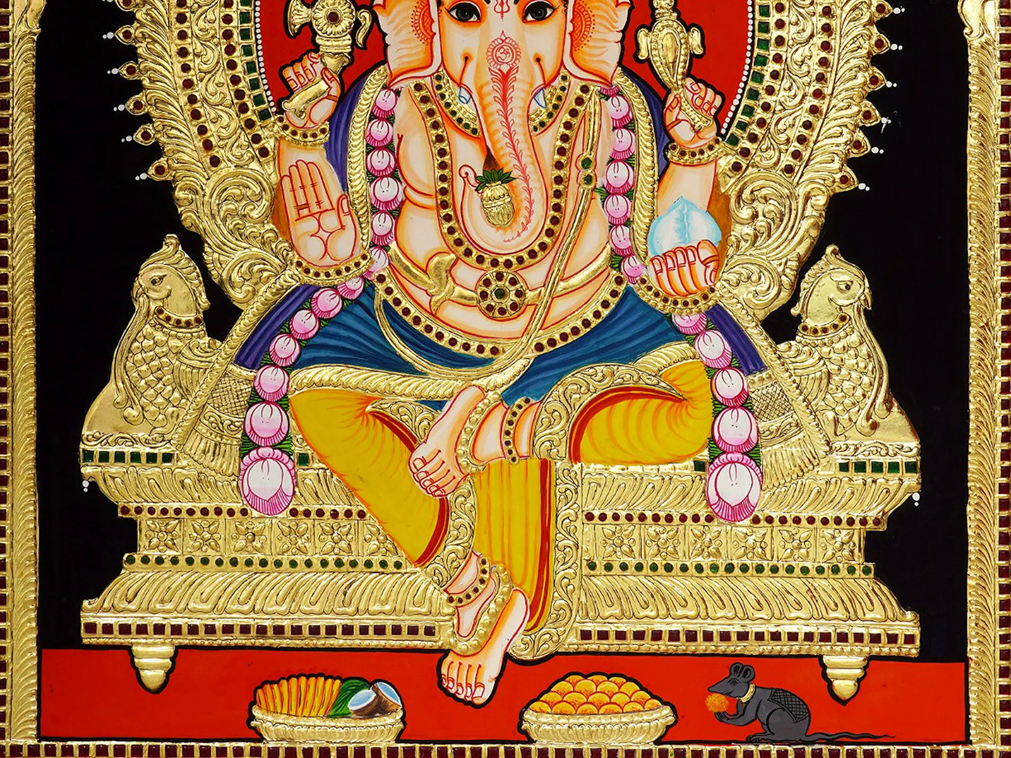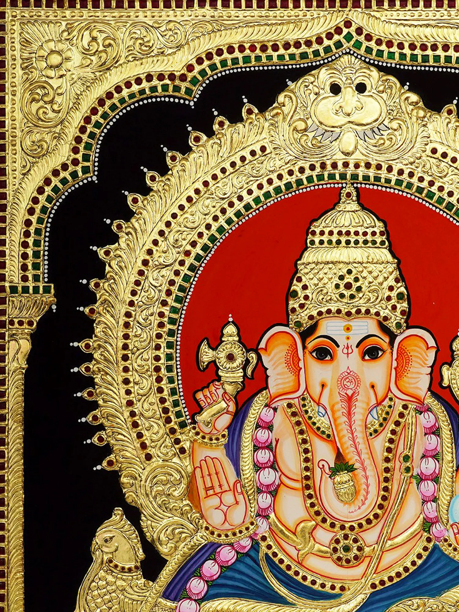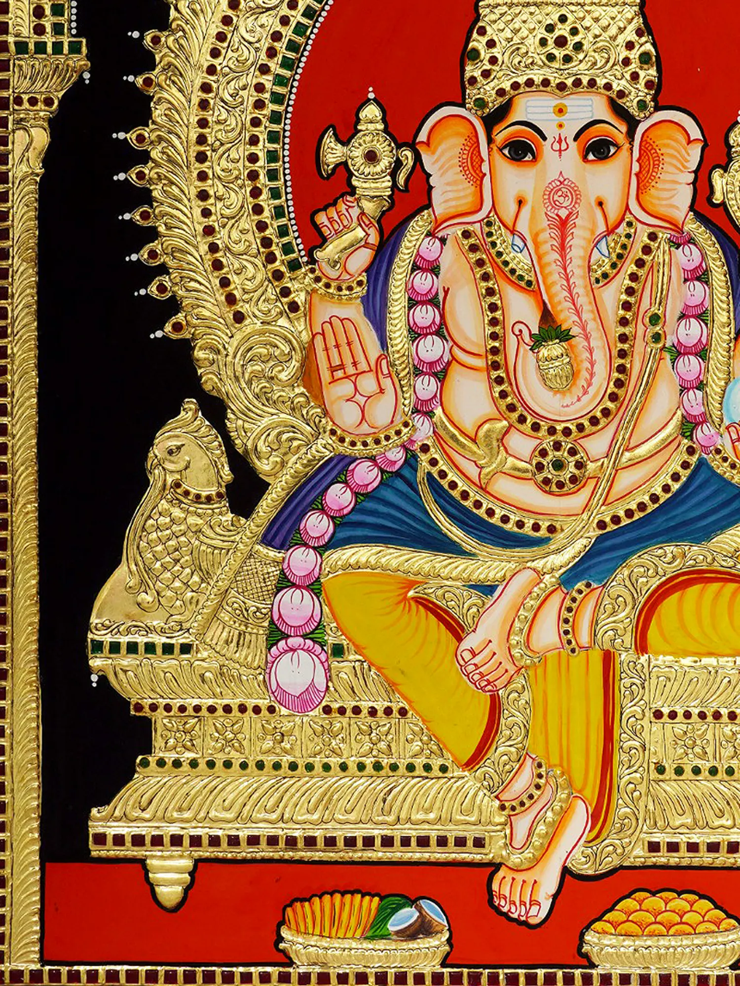 Tanjore paintings are deeply rooted in Hindu mythology, and this depiction of Ganesha draws upon his powerful symbolism as the deity of wisdom, intellect, and good fortune. He is revered as the patron of arts and sciences and is invoked at the beginning of rituals and ceremonies to ensure success. The artistic tradition itself dates back to the 16th century, flourishing under the patronage of the Chola kings, and continues to be a cherished expression of Indian cultural heritage.