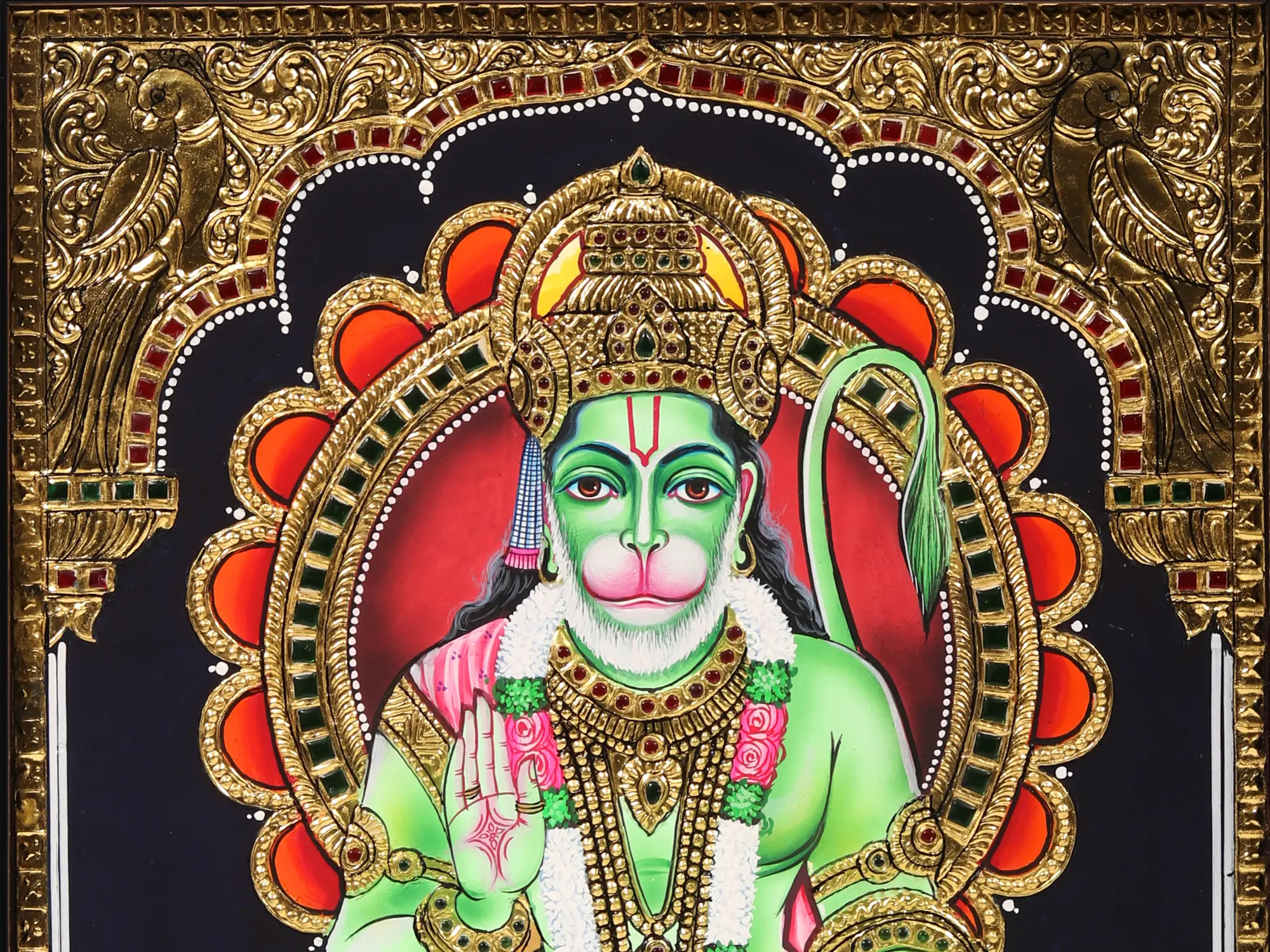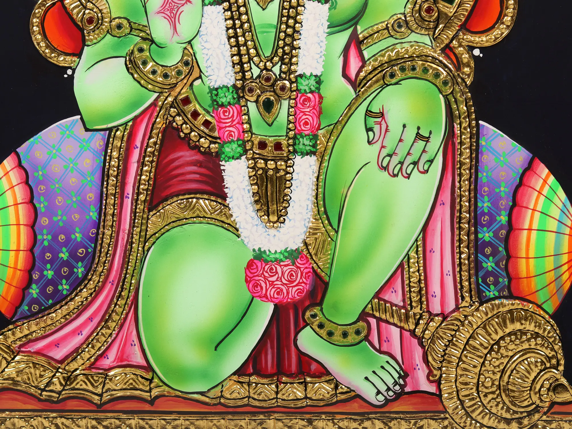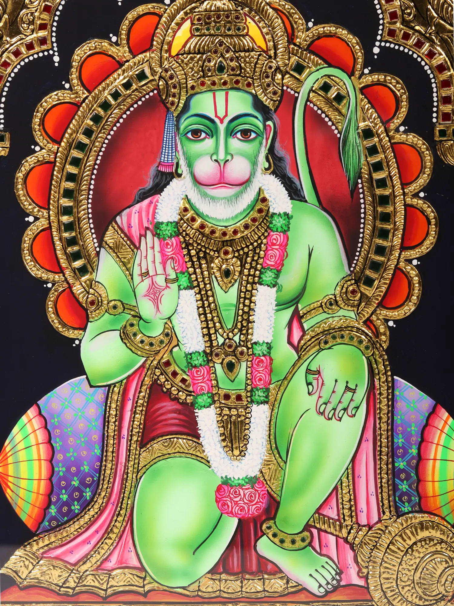 Find solace and strength in the Blessing Lord Hanuman, whose benevolent gaze and outstretched hand in the Abhaya mudra symbolise unwavering devotion and protection. In this beautiful Tanjore imagery, we find a reminder that even in our most challenging moments, divine support is always within reach. The patterned vibrant colours and the regal gold work of this artwork makes it a precious addition to your sacred space.