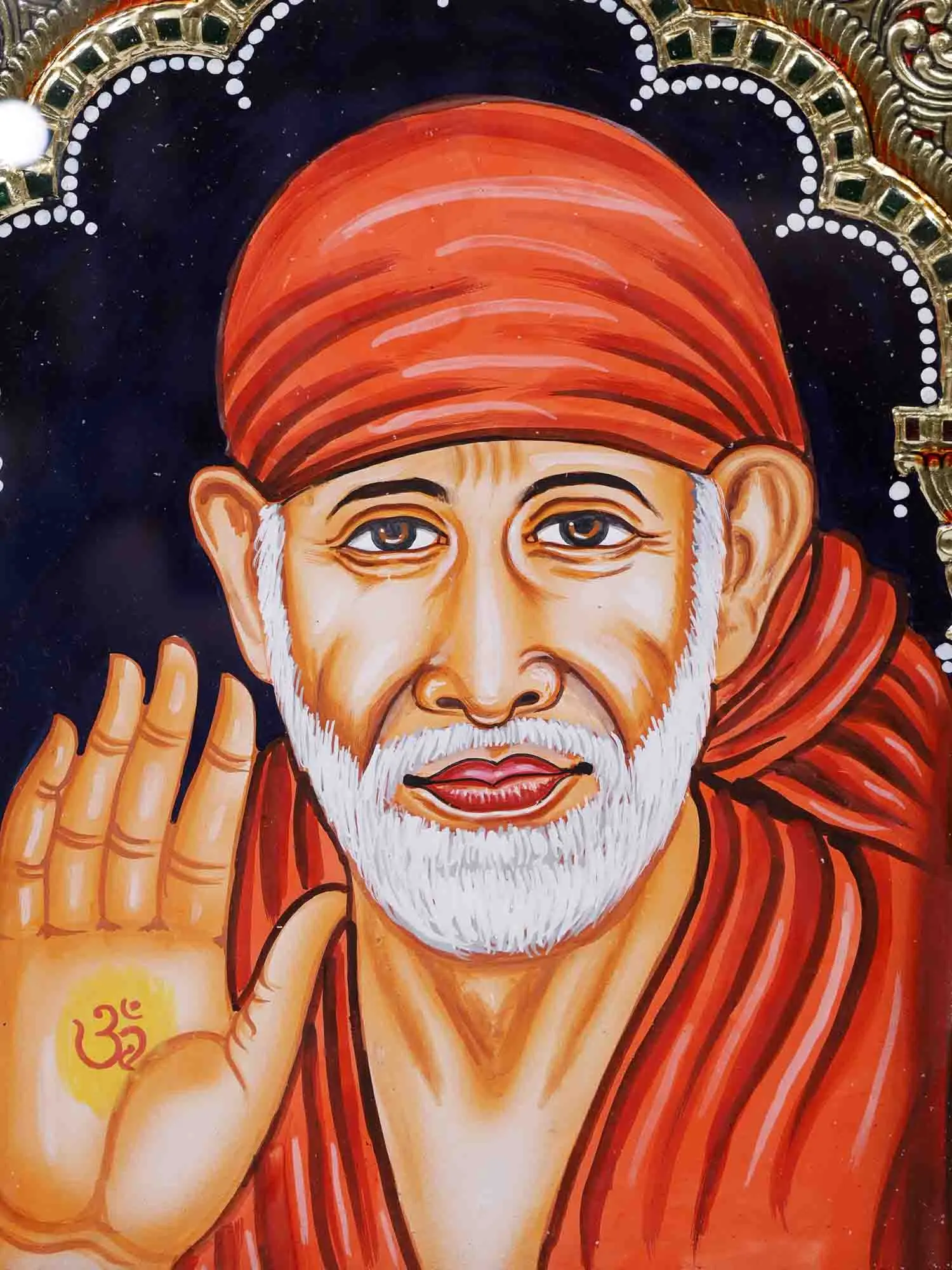 One notable detail in the painting is the depiction of the Om symbol painted on Sai Baba's palms. The Om symbol, representing the essence of the universe and the divine, adds a profound spiritual dimension to the artwork. It symbolizes the unity of the individual soul with the universal consciousness, reinforcing Sai Baba's teachings of unity, love, and harmony.