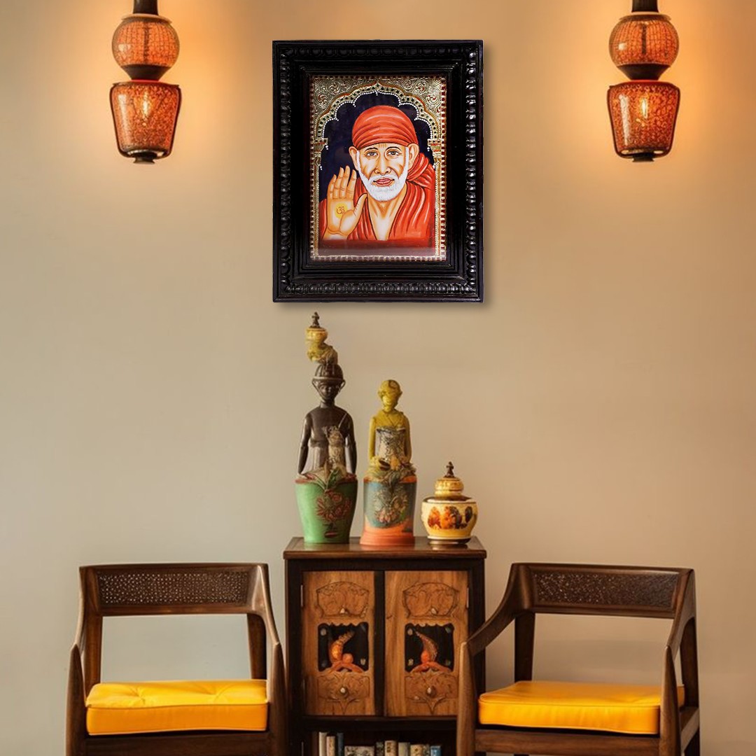 This Blessing Sai Baba Tanjore painting, enriched with 24-karat gold work, radiates divine grace and spiritual significance. Sai Baba, the revered saint of Shirdi, is depicted in a blessing posture, exuding compassion and serenity. His benevolent gaze and gentle smile convey a sense of peace and solace to his devotees.