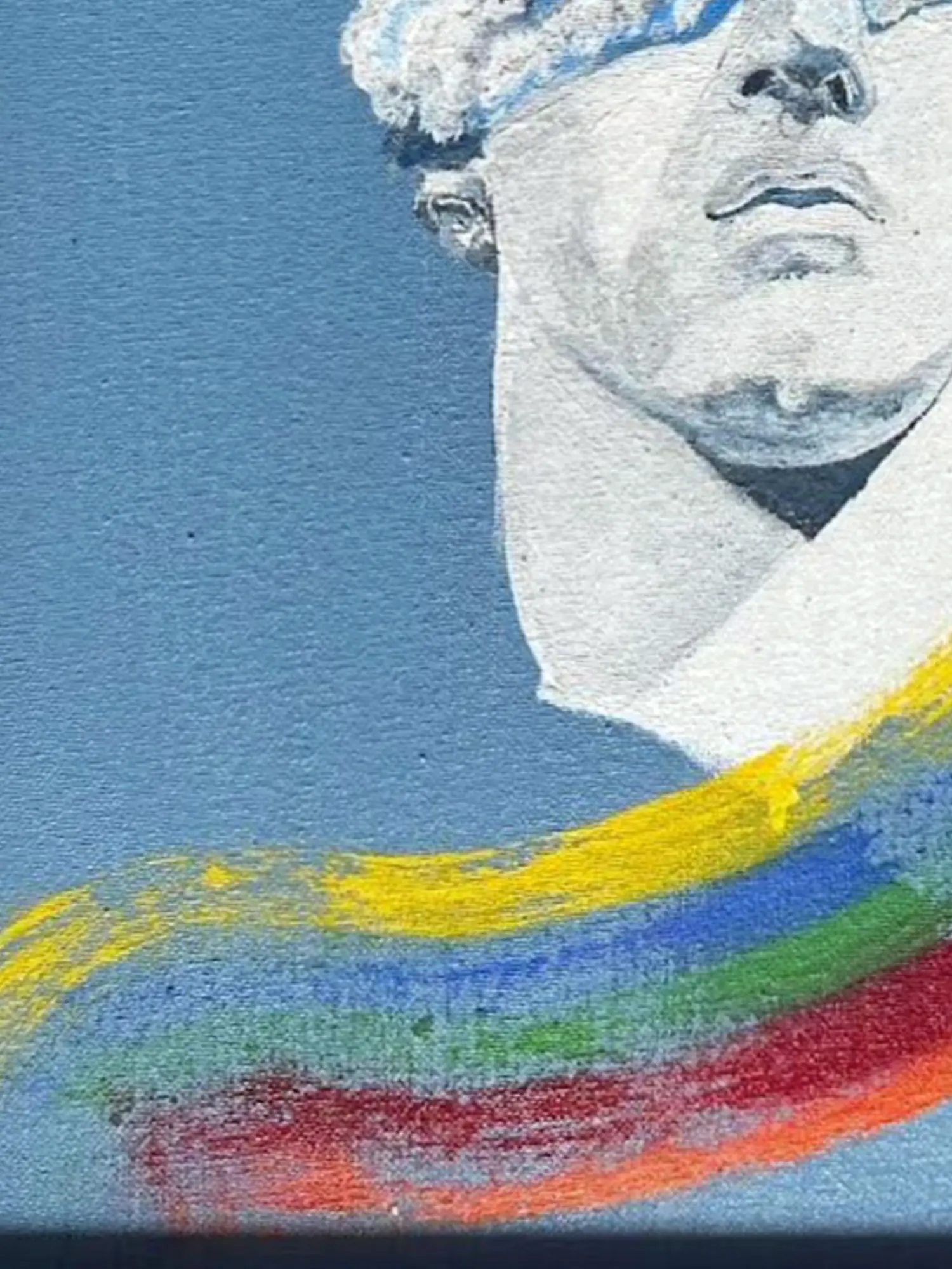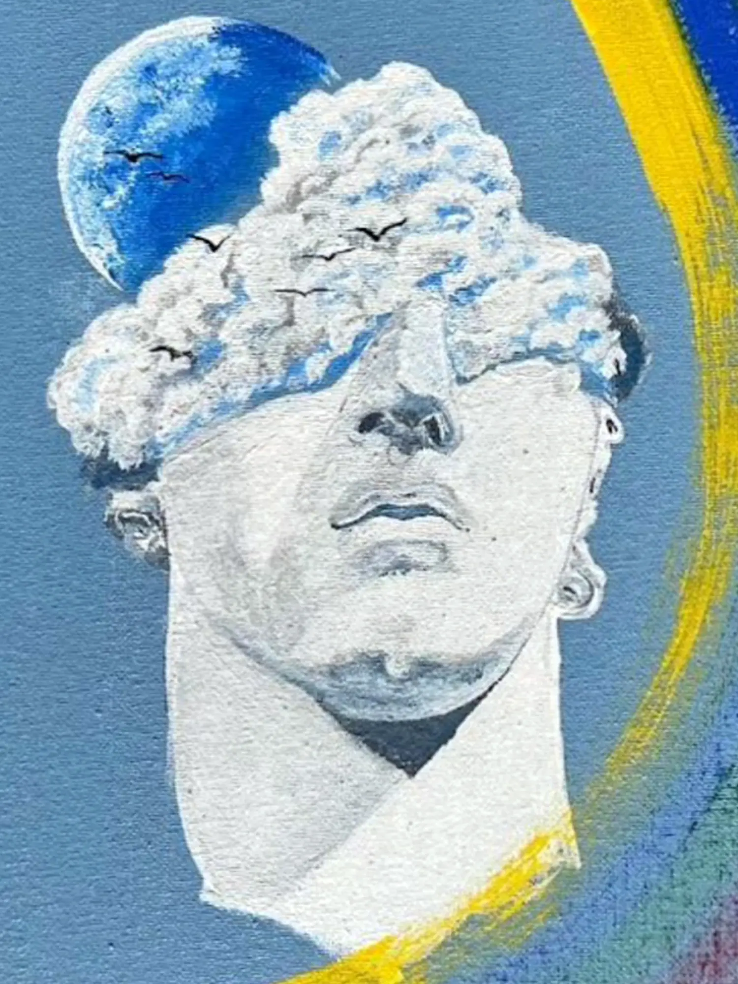 "Blinded By Lights" is more than just a painting; it's an exploration of perception, myth, and the vibrant spectrum of human experience. The artwork centers on a classical bust, its eyes veiled by a swirling mass of clouds, birds taking flight within their ethereal embrace. This evokes a sense of both concealment and revelation, a journey into the unknown where the boundaries of vision blur. The clouds themselves, reminiscent of the Olympian gods’ ability to shape-shift and control the weather, hint at higher forces at play, at the capricious nature of fate and the unpredictable journey of life.