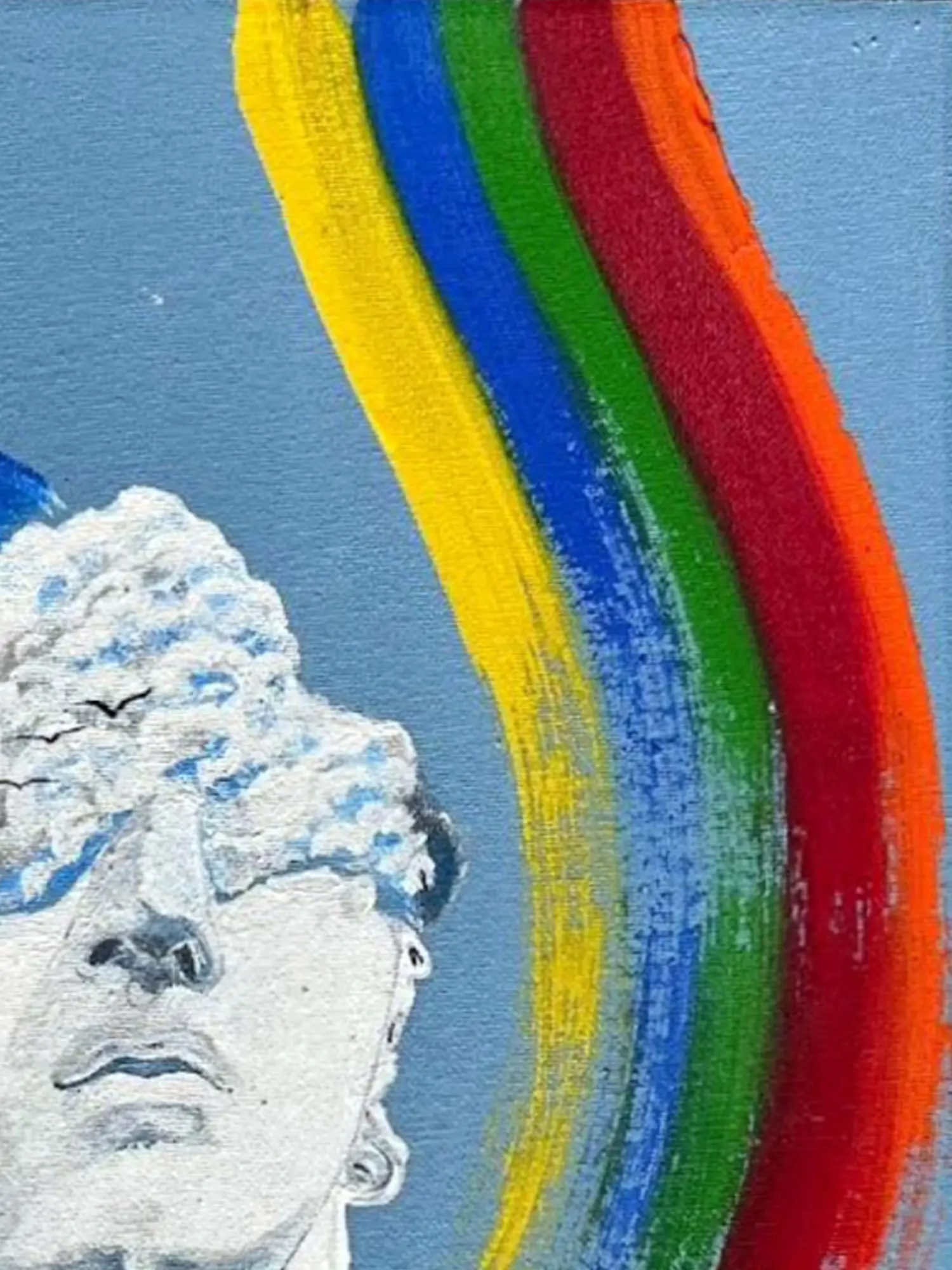 The moon partially obscured by the clouds, adds a celestial element, symbolizing hidden truths or subconscious knowledge. The small birds within the clouds imply freedom, a sense of escape or movement beyond the limitations imposed by the shrouded eyes. The entire composition unfolds as a journey – a narrative where the viewer is invited to decipher the symbolic language of the clouds, the rainbow, and the sculpted gaze. "Blinded By Lights" is a contemplation of perspective, an invitation to step beyond the veil and embrace the mystery of the unseen. This vibrant 16 inch by 12 inch acrylic on canvas is a captivating piece sure to spark conversation and add a unique artistic flair to any space.