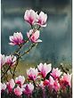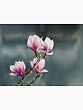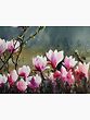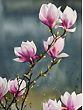Pink tulips predominate the paper canvas. A row of those dew-drenched blooms line the lower edge, filling up the foreground. From the very left amongst them, rise a couple of sprigs, such that the blooms - four in total - occupy, roughly, the centre of the surface area.