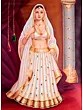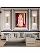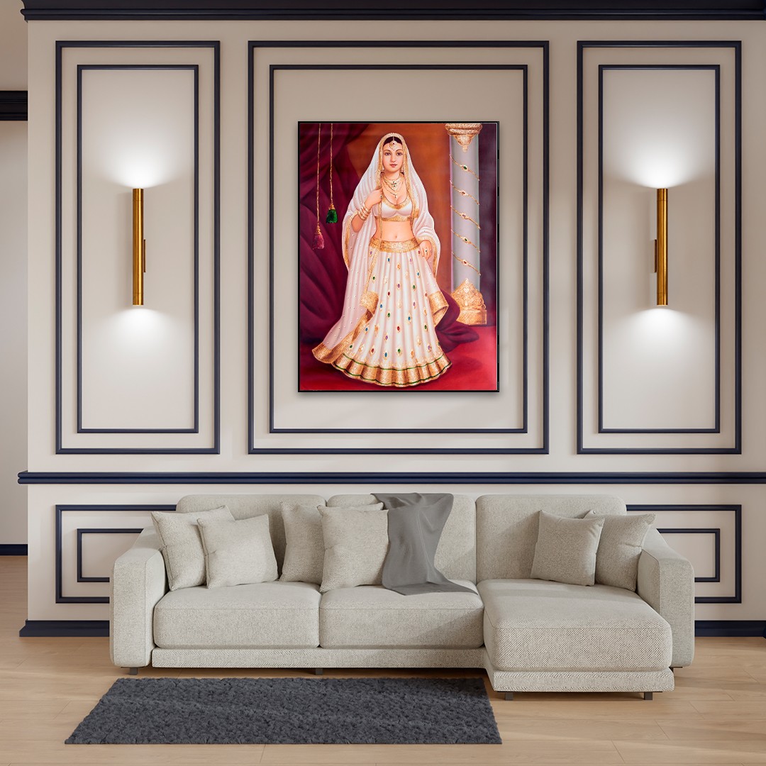 Though red is the favorite color for most Indian brides, the Dulhan (bride) in this oil painting drapes herself in white- the color of purity and beauty. The painter has added the blissful red as the drapery and carpet behind her, which highlights the gorgeousness of her white brocaded wedding ensemble perfectly. Brimming with youthful splendor, the bride-to-be holds a corner of her Chunni (scarf) and lifts her lehenga (skirt), as if preparing herself to walk in the Mandapa (space for marriage rituals) and her new life.