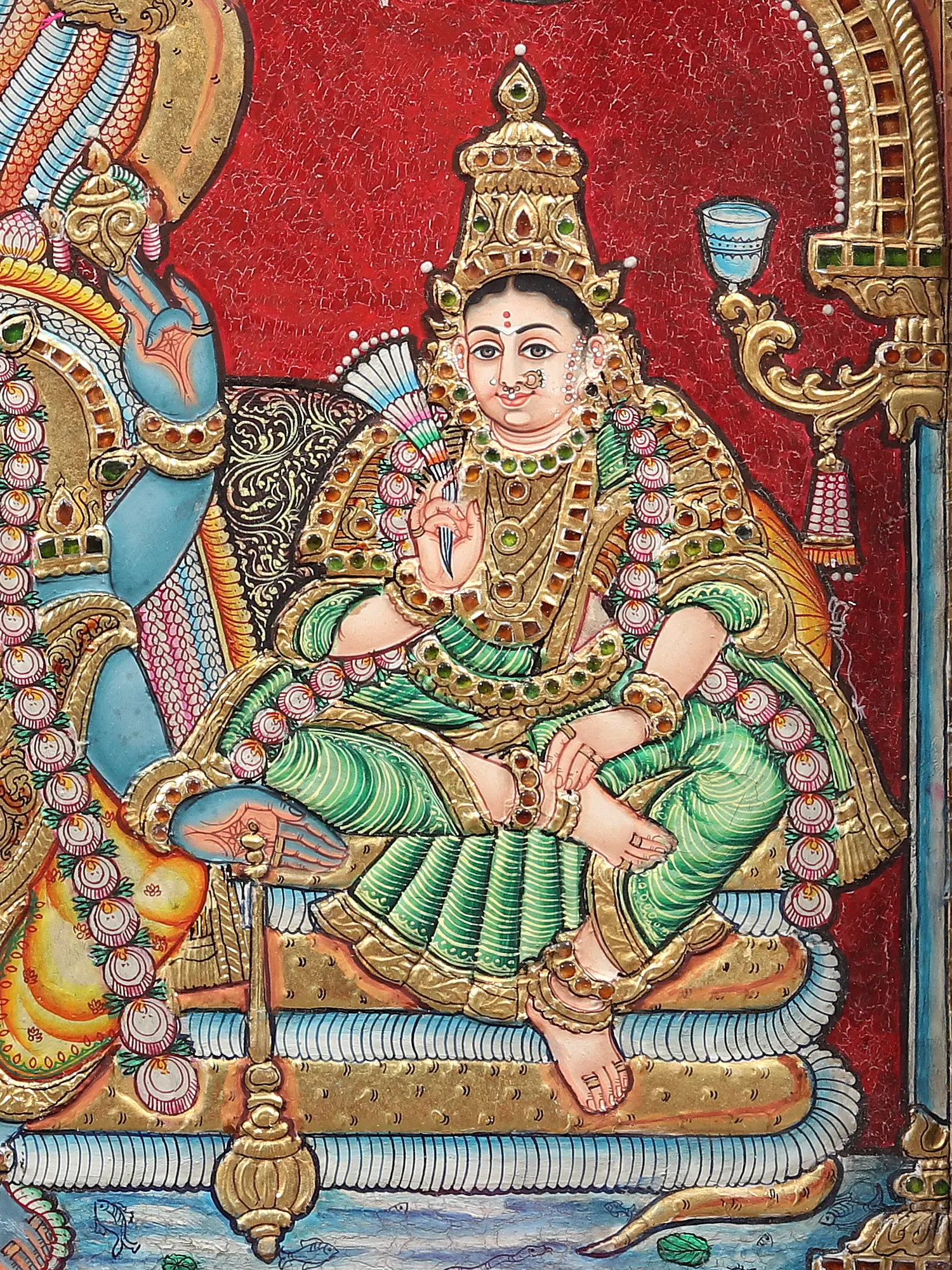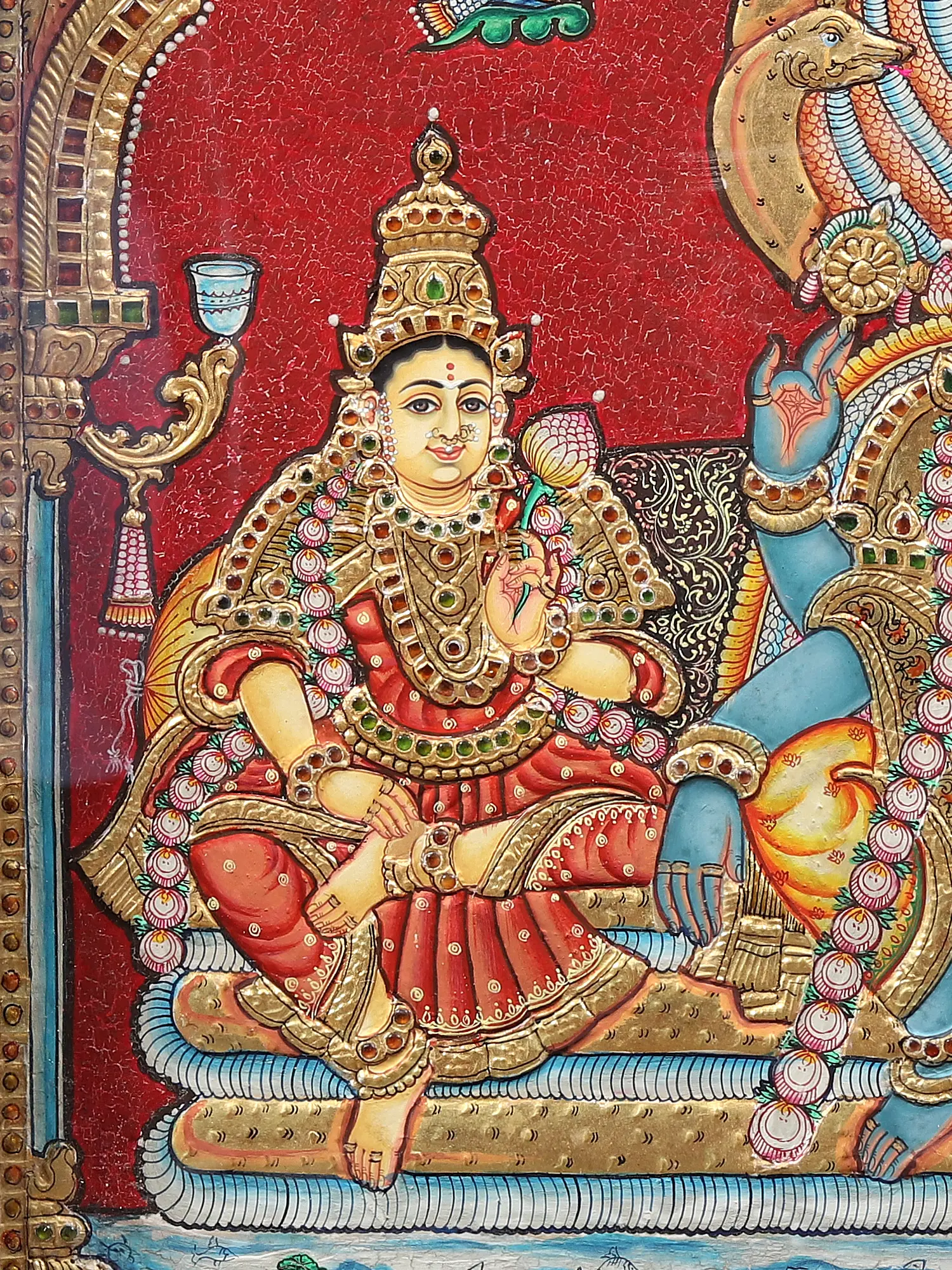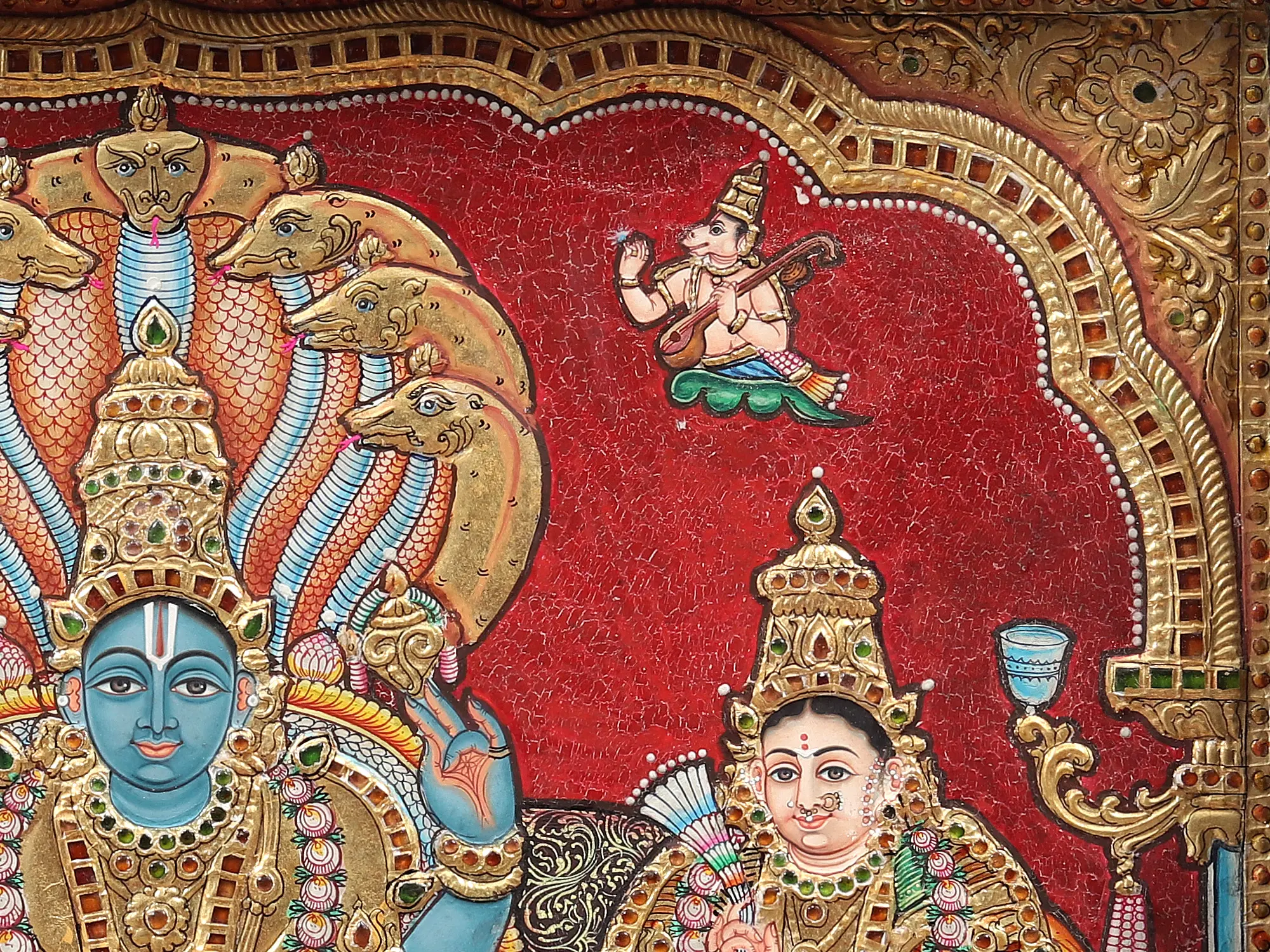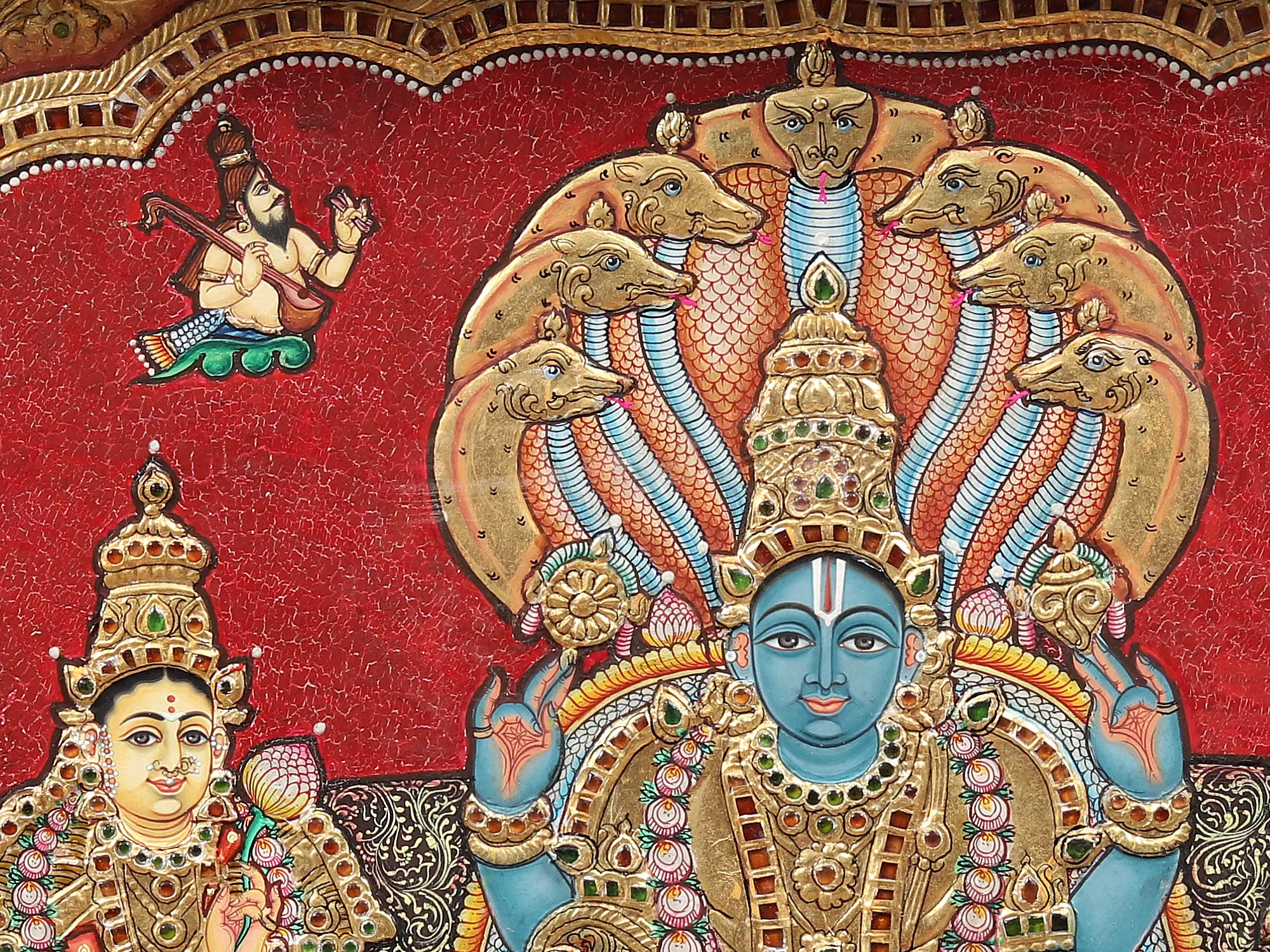 The ornaments of all three of them are beautifully layered with glimmering gold, and their facial features are painted beautifully to give the images an enchanting animation. In the topmost section of the painting are Narada and Tumburu, the divine devotees of Vishnu, witnessing the blissful presence of their Lord, and the Kshirasagar underneath the coils of Sheshanaga can be seen in the foreground. Placed within an antiquated teakwood frame, this Tanjore painting gives you the Darshana of the most sacred Vishnu Loka.
