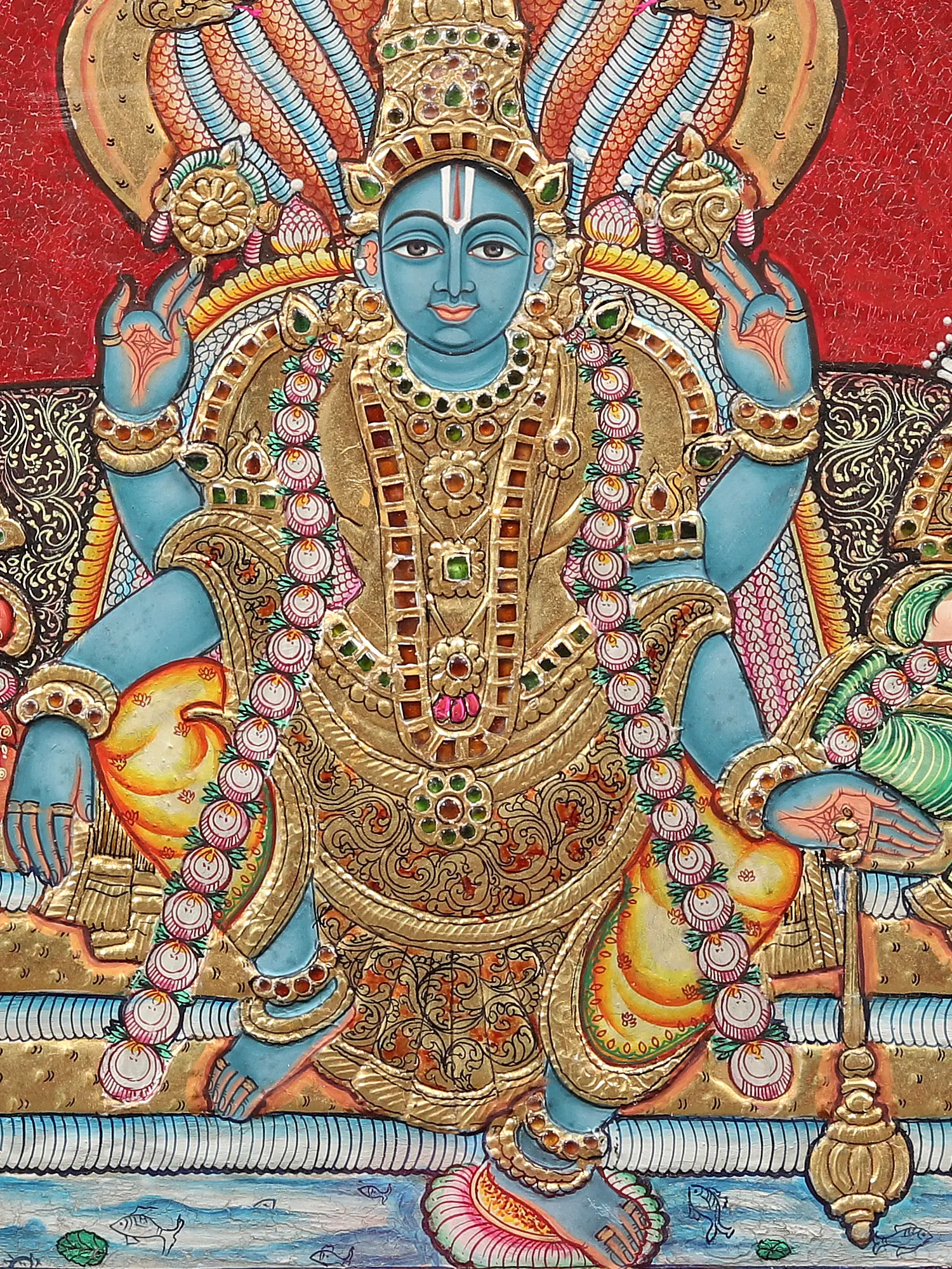 Handpainted with traditional Tanjore hues, delicately covered in 24-karat gold and meticulously infused with classical iconography, this Tanjore painting presents to the devotee the awe-inspiring scene of Sri Vishnu’s abode in Kshirasagara, where the blue-skinned Narayana resides with his twin Shaktis- Sridevi and Bhudevi. A textured red backdrop is used for the images of the three divinities- with Vishnu in the center, sitting in Lalitasana and Sridevi Lakshmi and Bhudevi, wrapped in red and green respectively, flanking their Lord.