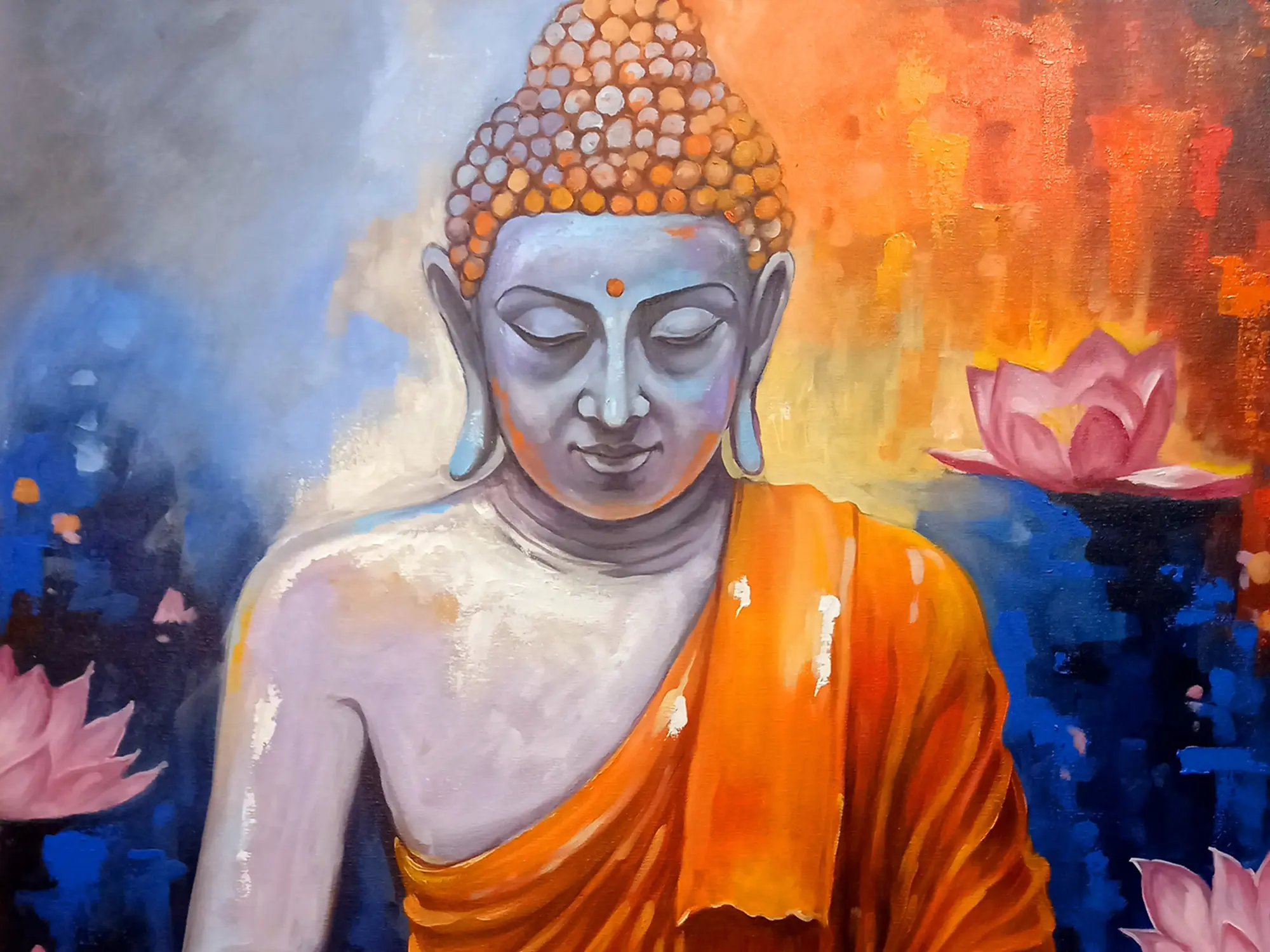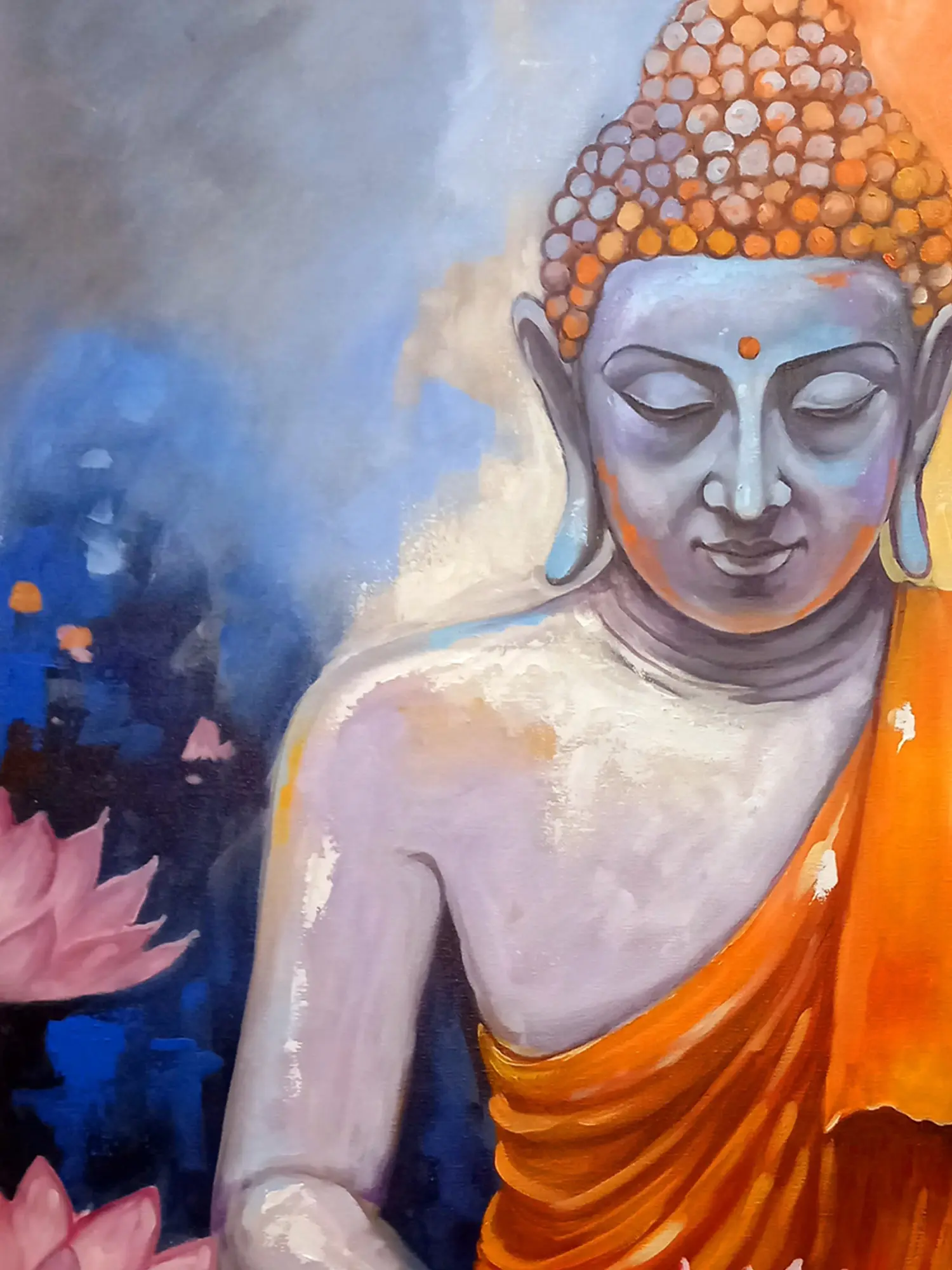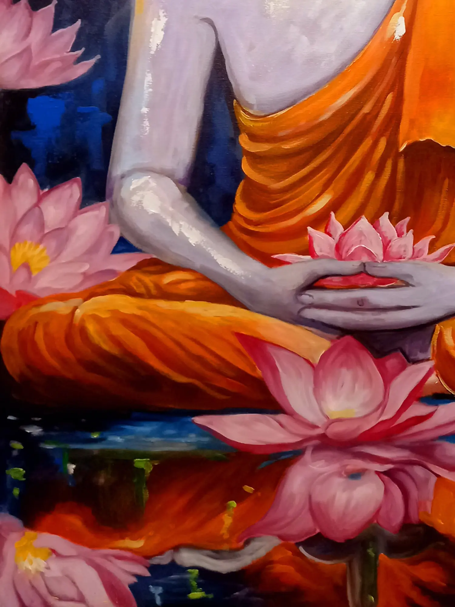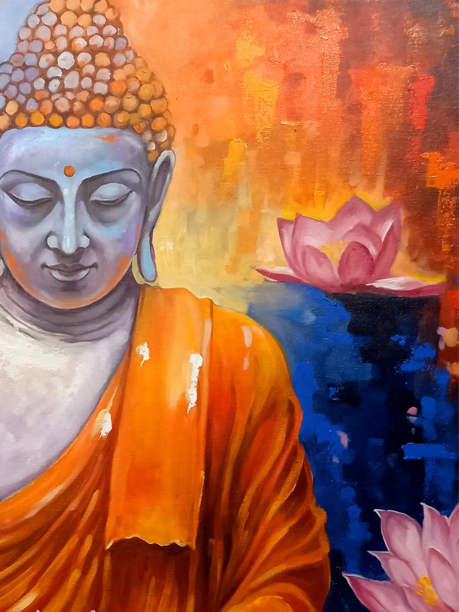 The composition is a symphony of color and form, with the figure of the Buddha rendered in subtle blues and whites, exuding an ethereal glow. The surrounding lotus blossoms, in shades of soft pink, symbolize purity and spiritual awakening, their reflections shimmering on the water's surface. The dynamic interplay of warm oranges and cool blues in the background creates a captivating visual dialogue, drawing the viewer into the scene’s meditative atmosphere. Its generous scale, measuring 36 inches in width and 48 inches in height, ensures it commands attention.