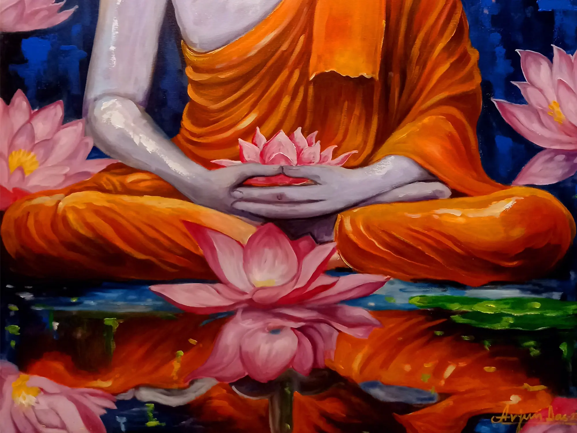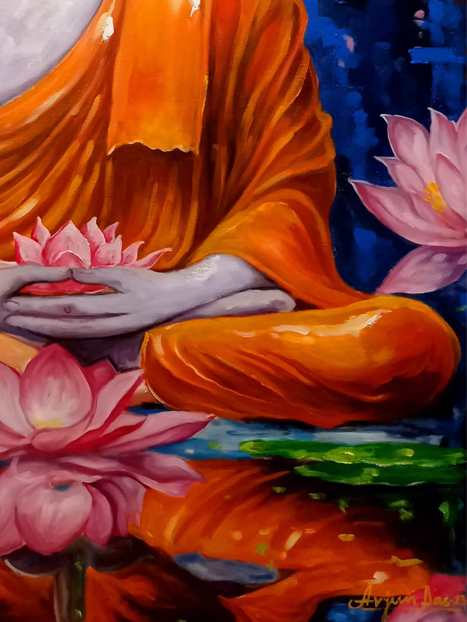 This portrayal draws inspiration from the timeless iconography of the Buddha, representing a pivotal figure in Buddhist philosophy and practice. The lotus, a recurring motif, symbolizes the journey from the muddy waters of attachment to the clear, enlightened state. The artist, Arjun Das, imbues this traditional subject with a contemporary sensibility, creating a piece that resonates with both historical reverence and modern aesthetic appreciation.