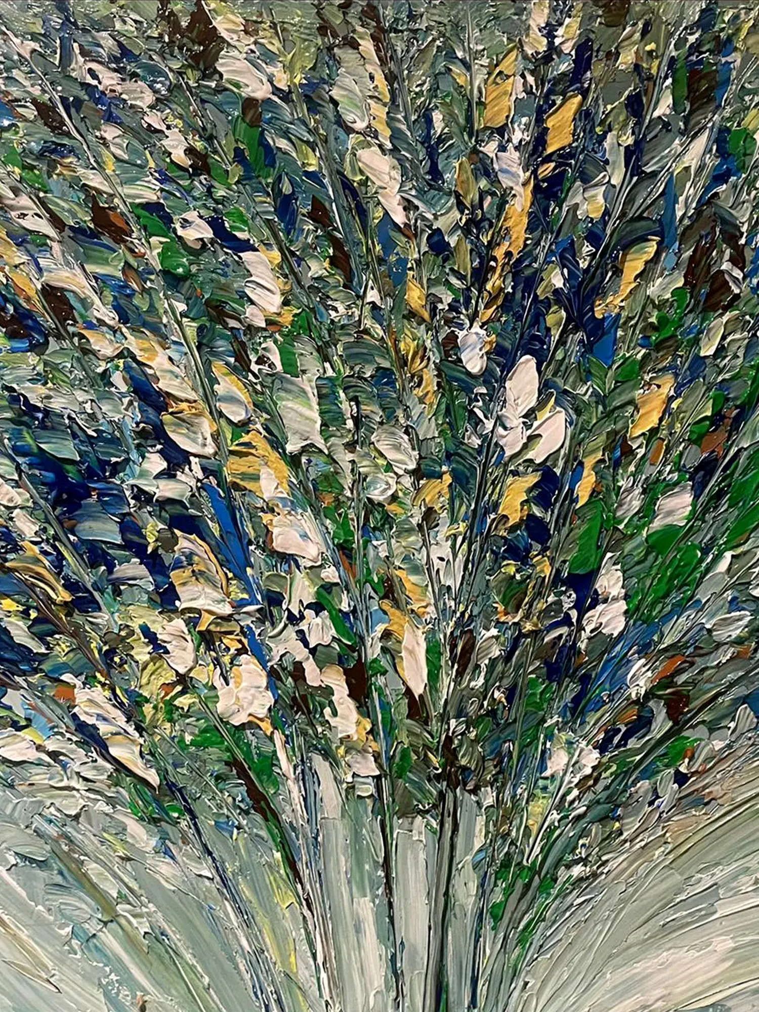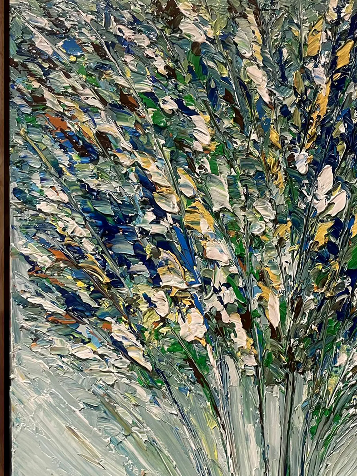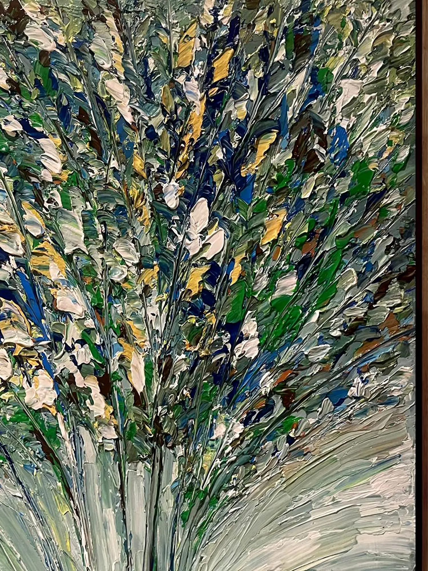 Immerse yourself in a vibrant expression of nature's beauty. This artwork captures the essence of a floral arrangement with a bold, abstract approach. Instead of precise representations, the artist uses confident strokes of acrylic paint to create a lively and dynamic composition. Blues melt into greens and yellows, highlighted with touches of white, evoking the feeling of sunlight dappling through leaves and illuminating blossoms. The texture of the paint adds depth and dimension, inviting you to reach out and touch the layers of color. This piece isn't merely a picture of flowers; it's an interpretation of the joy and vitality they represent.