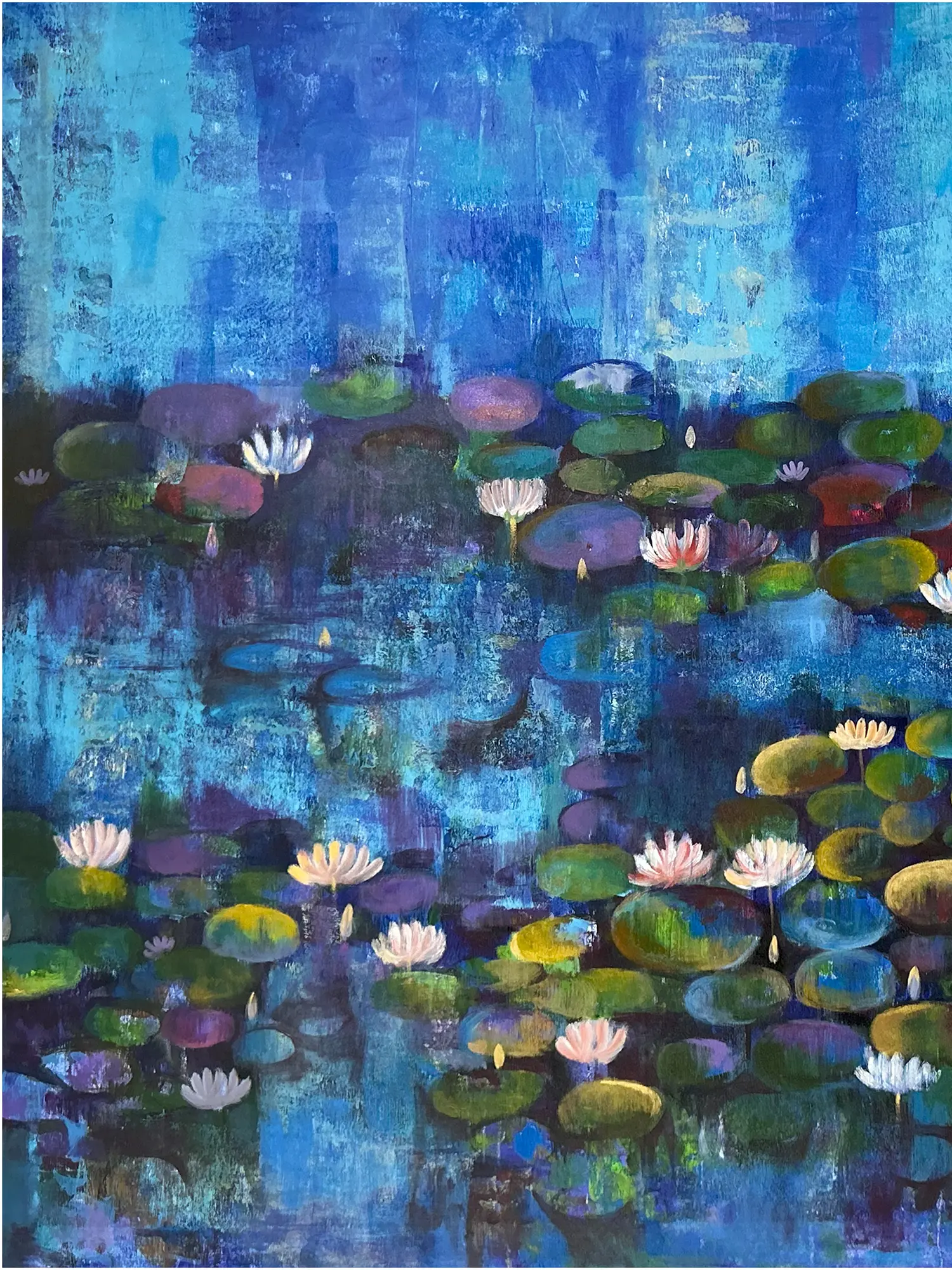 Water lilies hold profound significance across various cultures, symbolizing purity, enlightenment, and rebirth. This portrayal resonates with the serene spirituality often associated with these aquatic wonders, reminiscent of the iconic studies by Monet, yet infused with a contemporary vibrancy and personal expression. You'll find echoes of nature's enduring cycles and the quiet resilience of life within its depths.