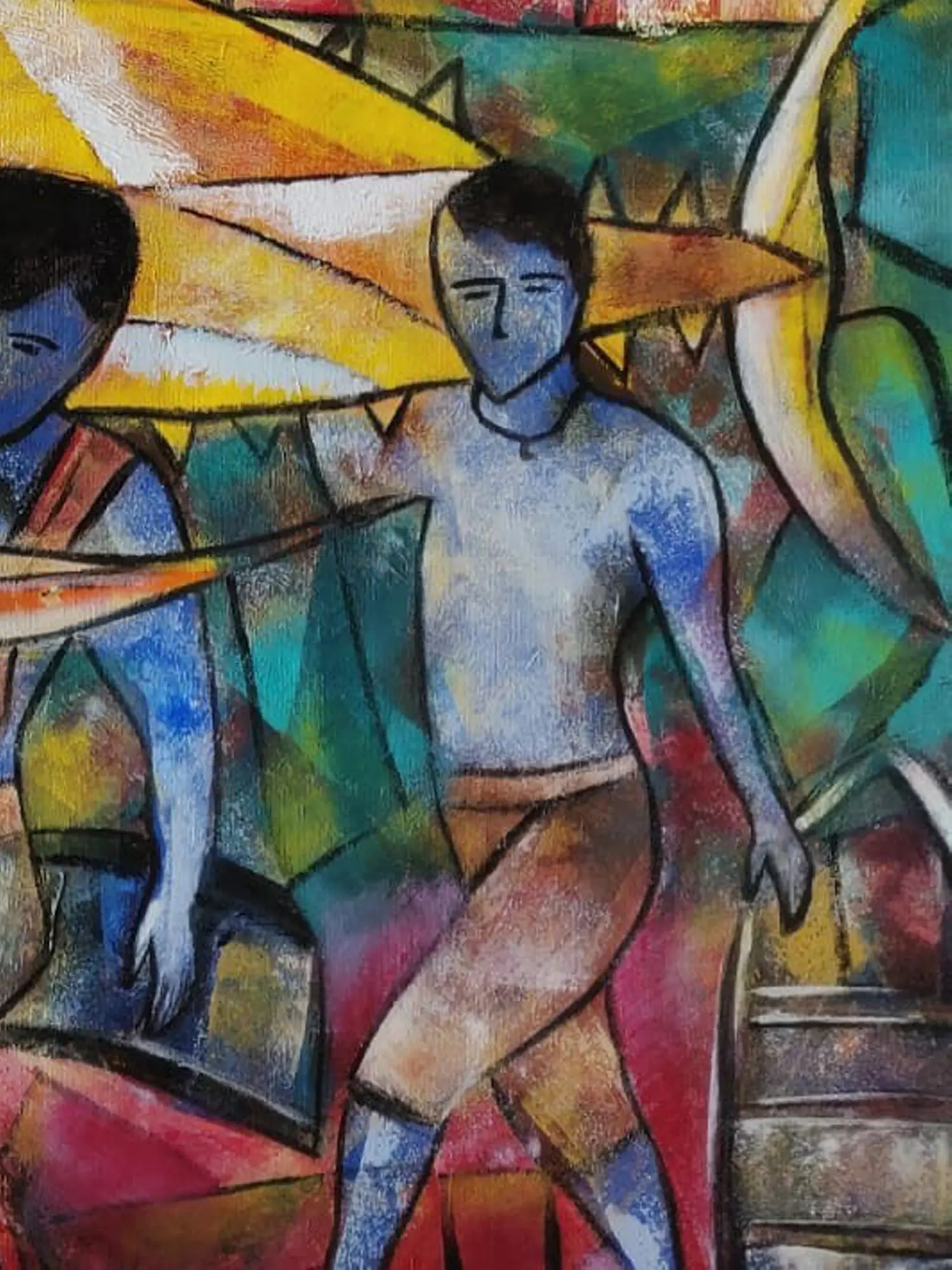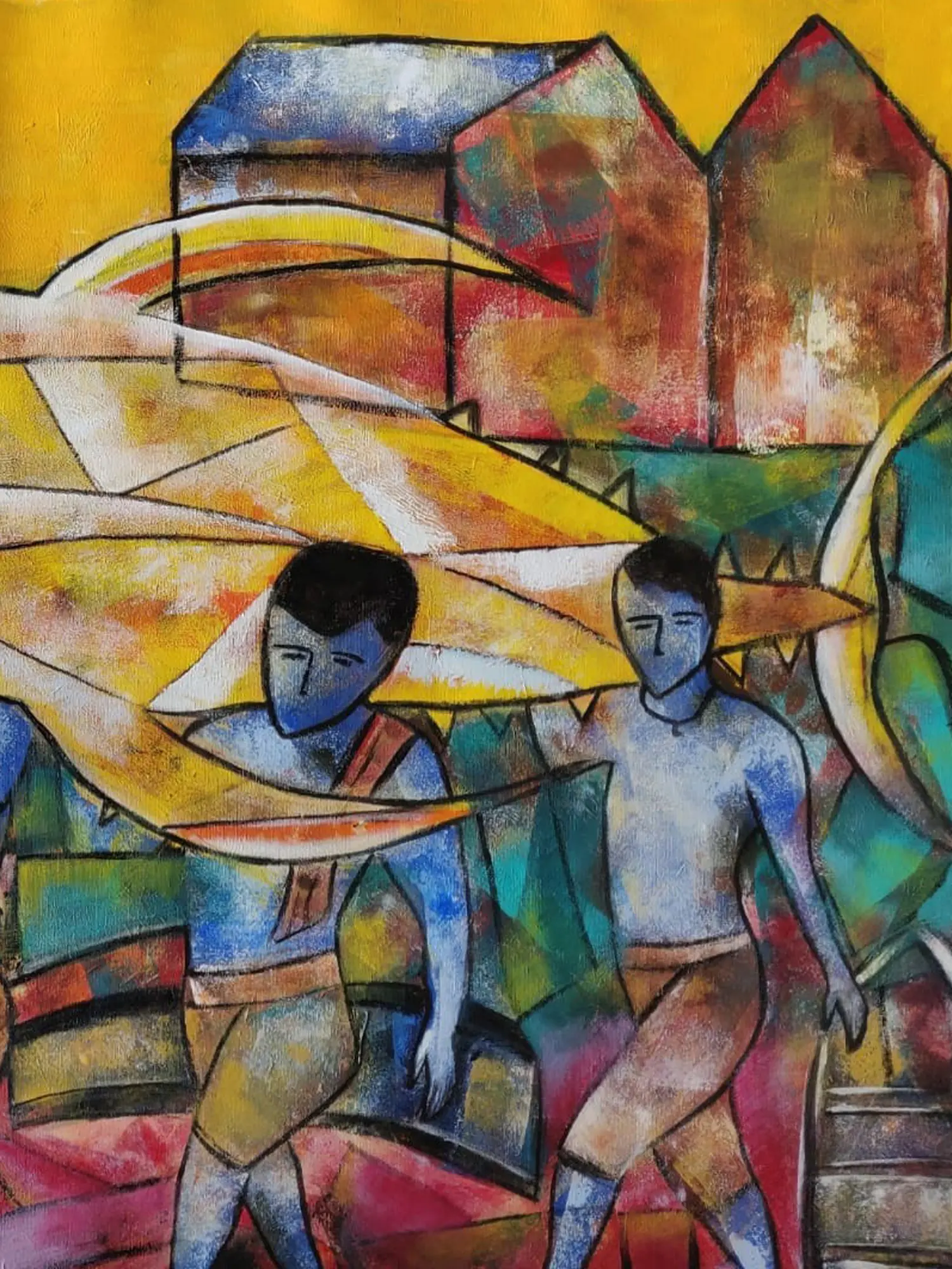 The expansive dimensions, measuring 31 inches in height and 47 inches in width, allow the scene to unfold with remarkable impact. You'll appreciate the dynamic composition, where simplified, abstracted figures carry the weight of their labor against a backdrop of bold geometric shapes representing boats and dwellings. The striking juxtaposition of deep blues, earthy browns, and vibrant yellows against a luminous ochre sky creates an atmosphere of both challenge and triumph, a visual symphony for your discerning eye.