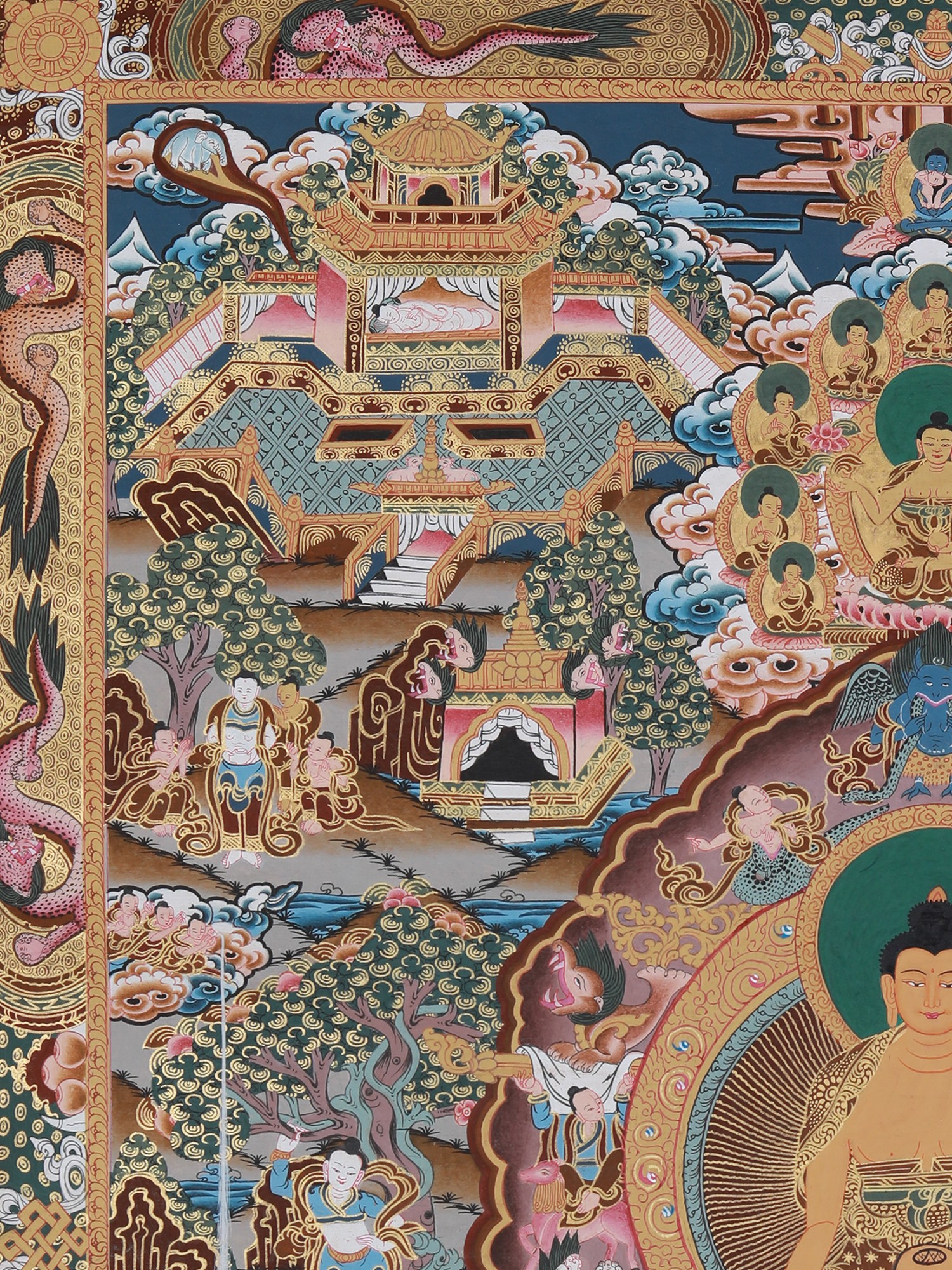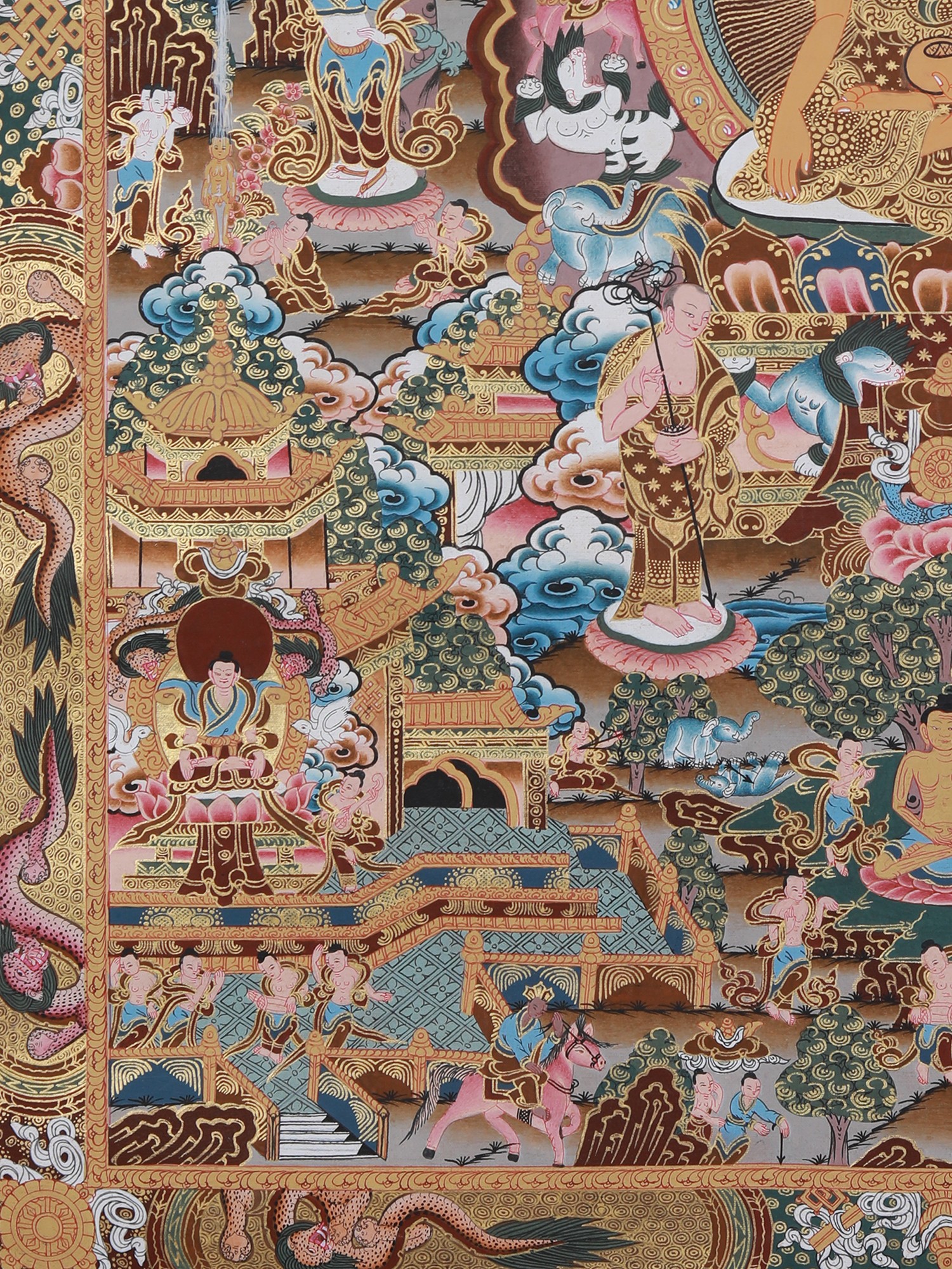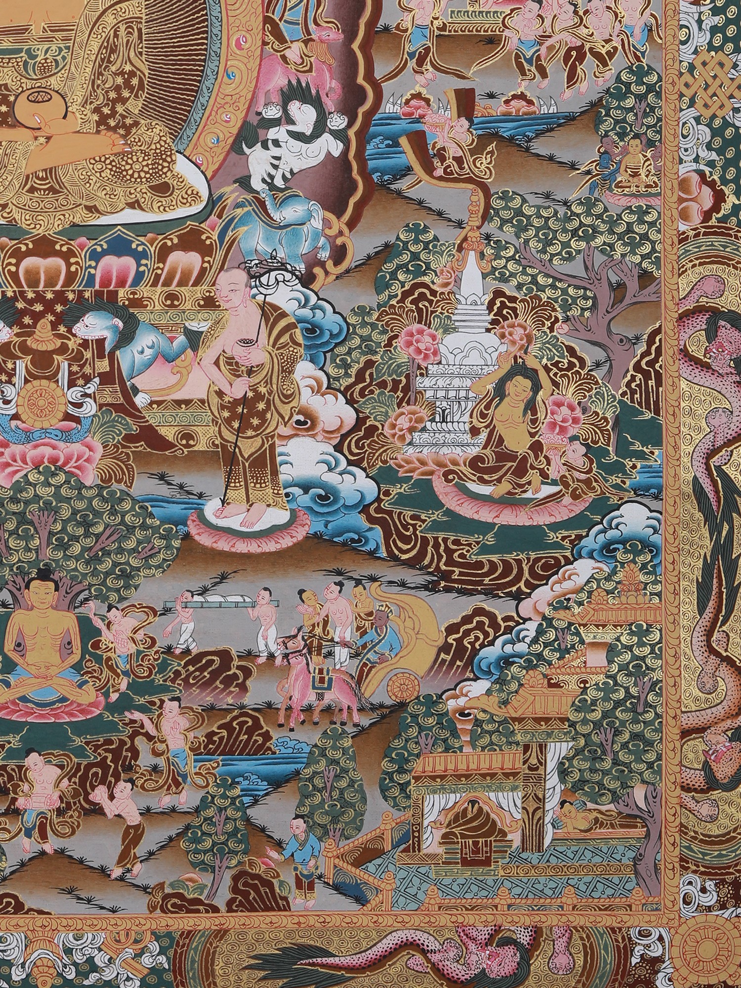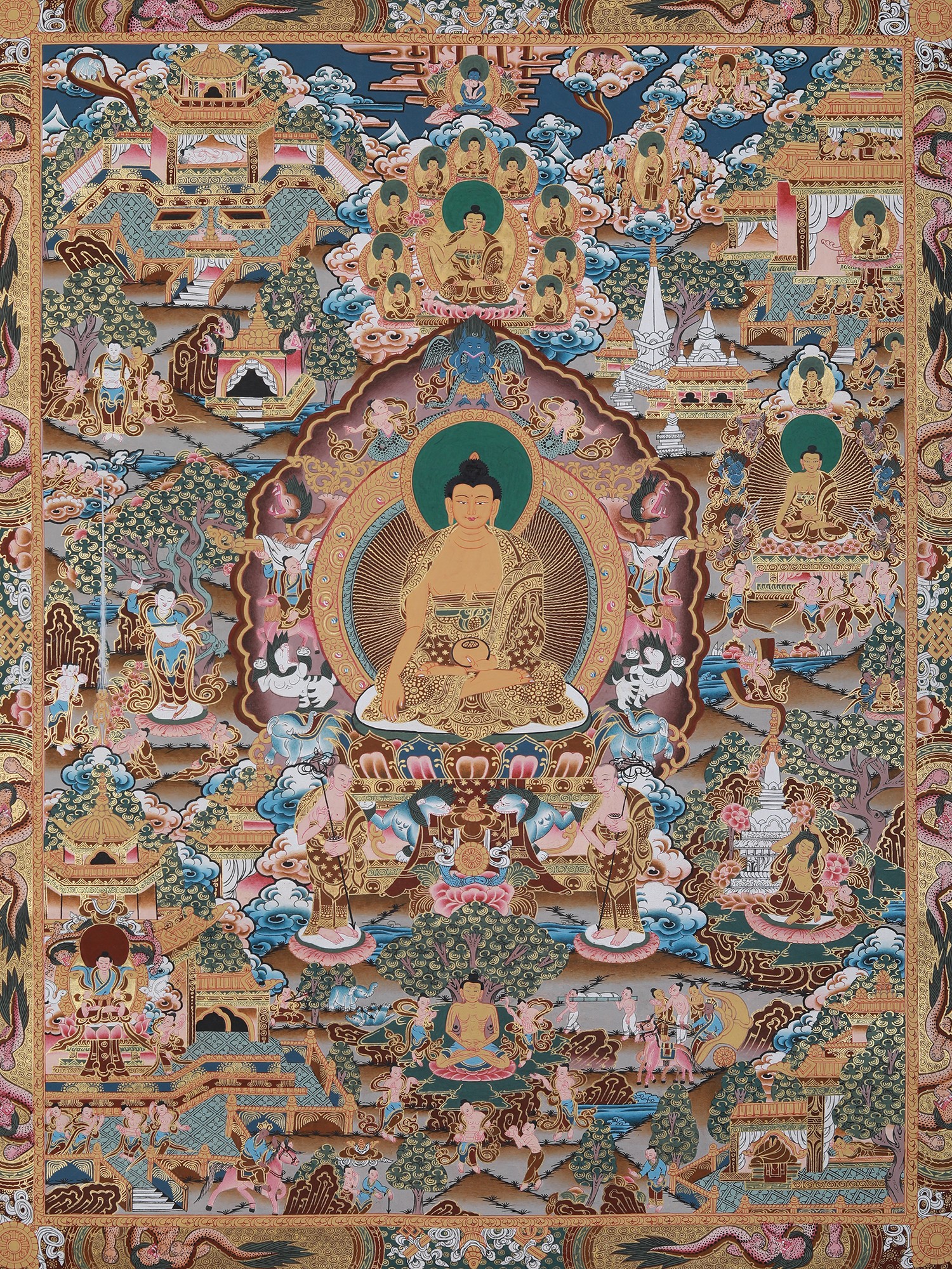 This exquisite Thangka painting is a visual journey through the life and teachings of Buddha, rendered with the intricate detail and vibrant colors characteristic of traditional Tibetan art. More than just a decorative piece, it's a sacred object intended to inspire contemplation, meditation, and a deeper understanding of Buddhist philosophy. The central figure, Buddha himself, radiates peace and serenity, drawing the eye into the heart of the mandala. Surrounding him is a universe of symbolic imagery, inviting the viewer to explore the interconnectedness of all things. The Thangka tradition emerged as a portable and accessible way to impart Buddhist teachings, particularly to a largely nomadic population. Lamas and monks used these painted scrolls to illustrate complex philosophical concepts and narratives. The creation of a Thangka is a deeply spiritual practice, with artists often meditating on the deities and principles they depict. This devotion infuses the artwork with a palpable sense of reverence and power.