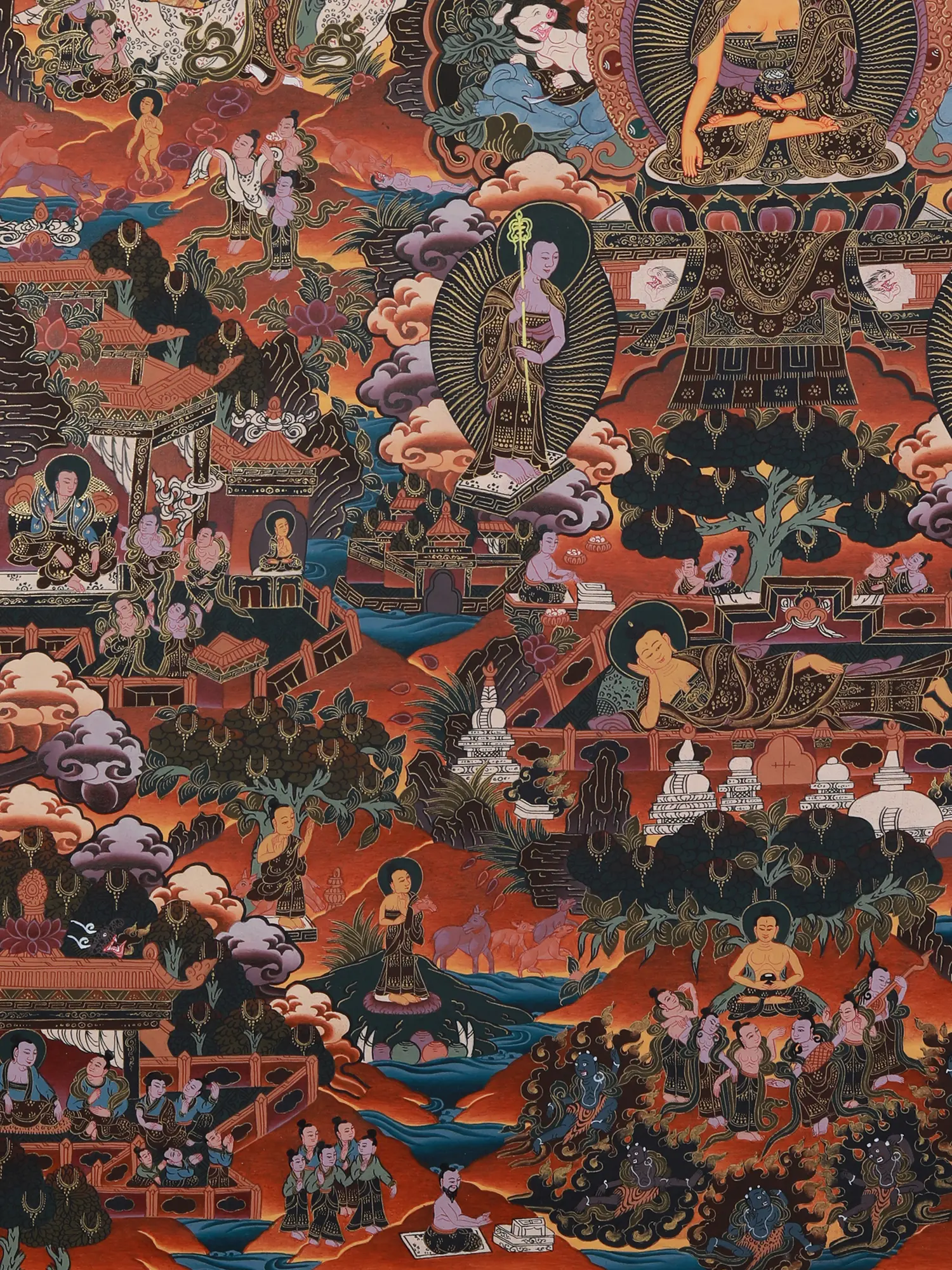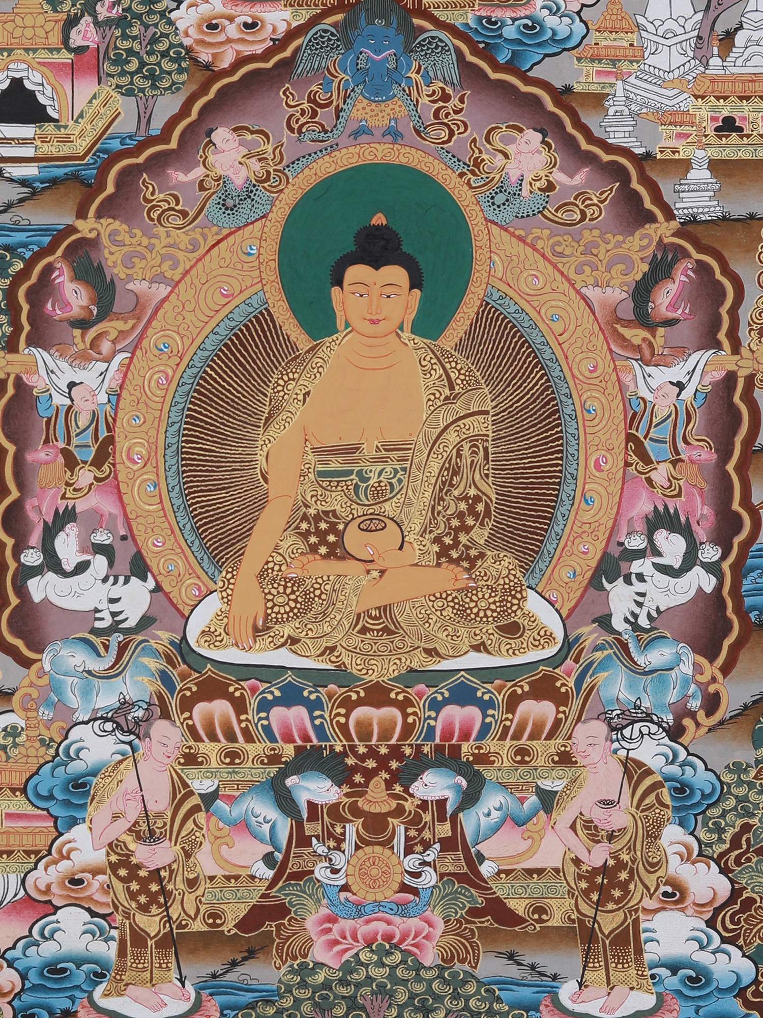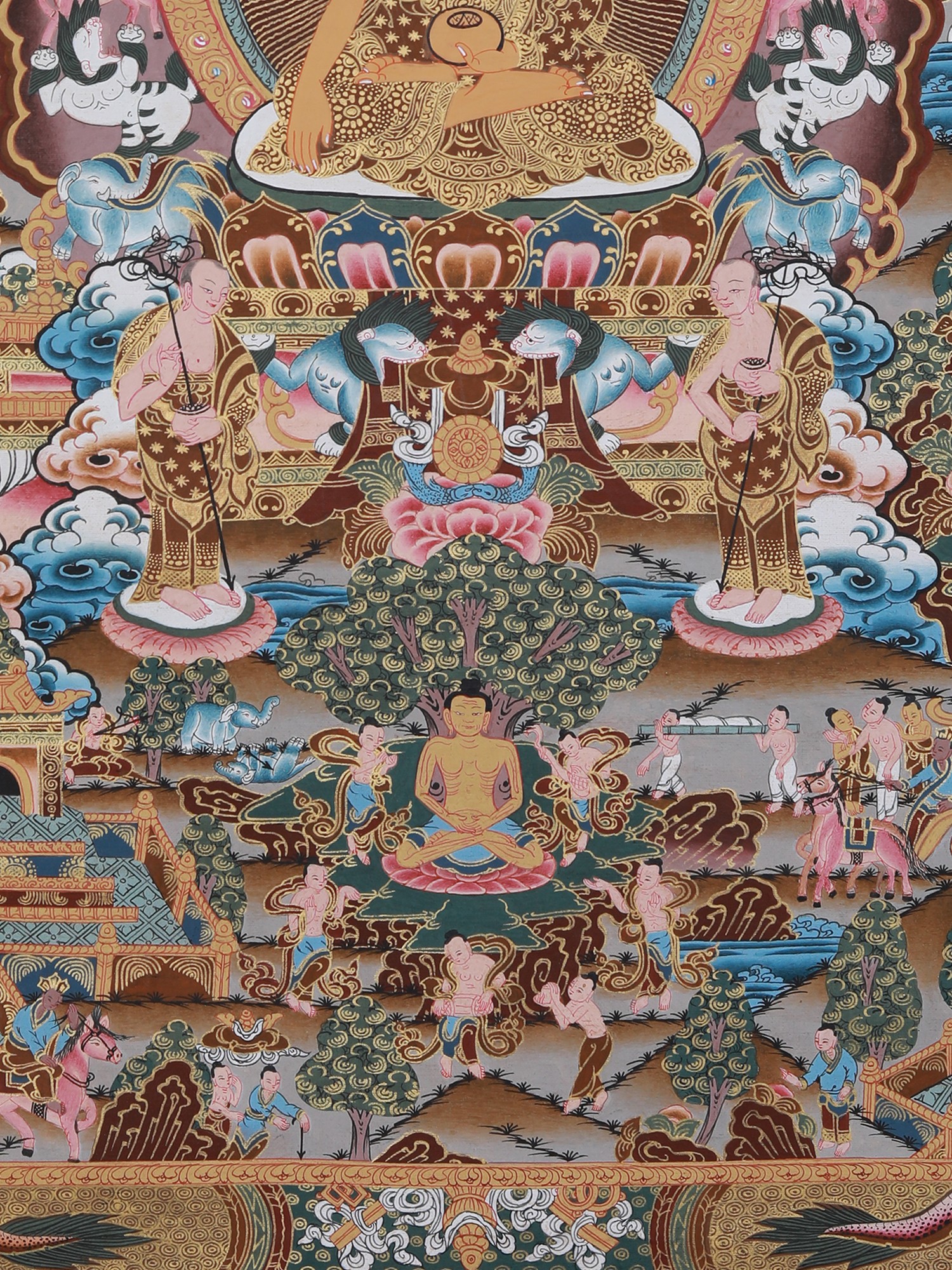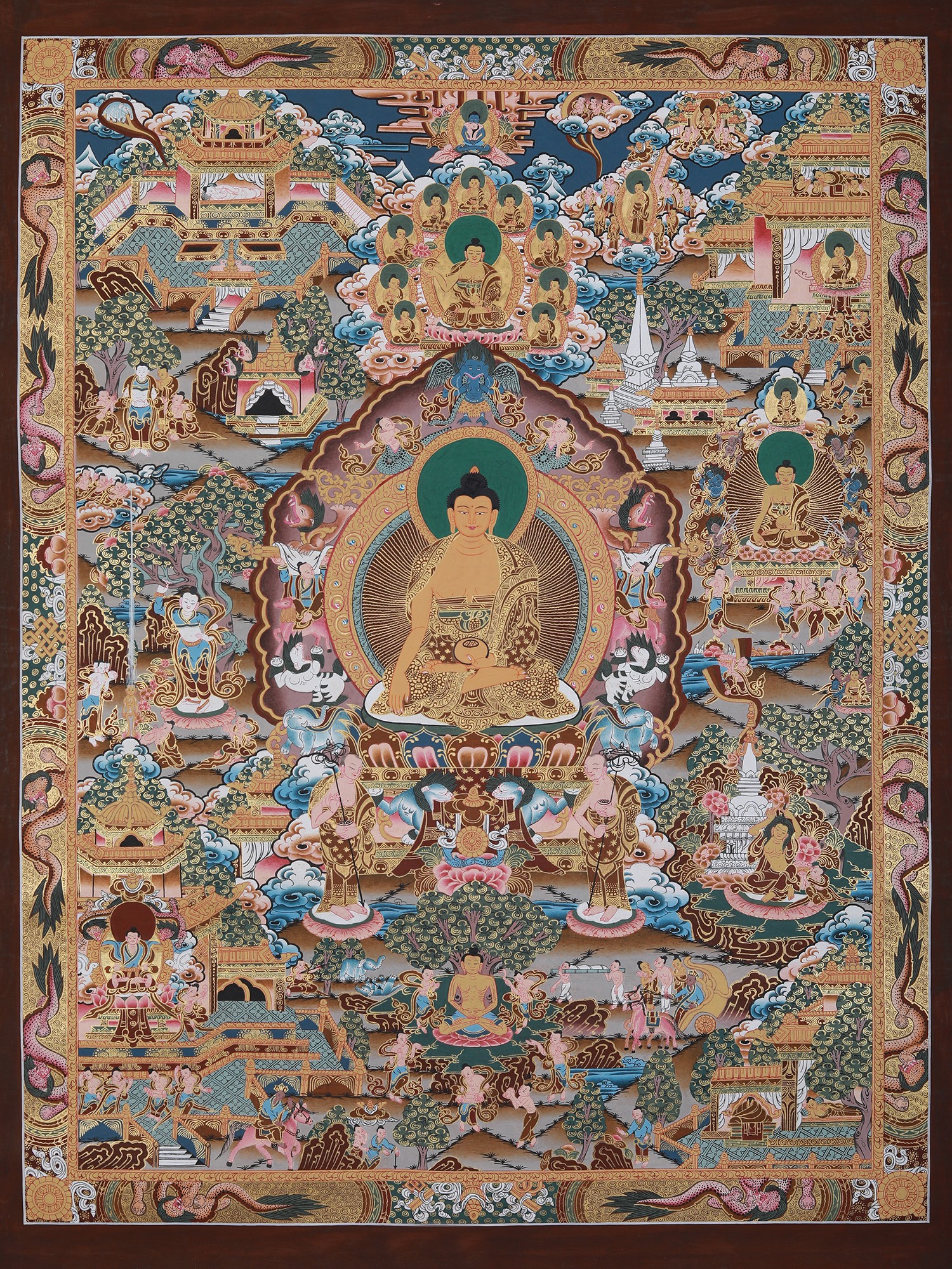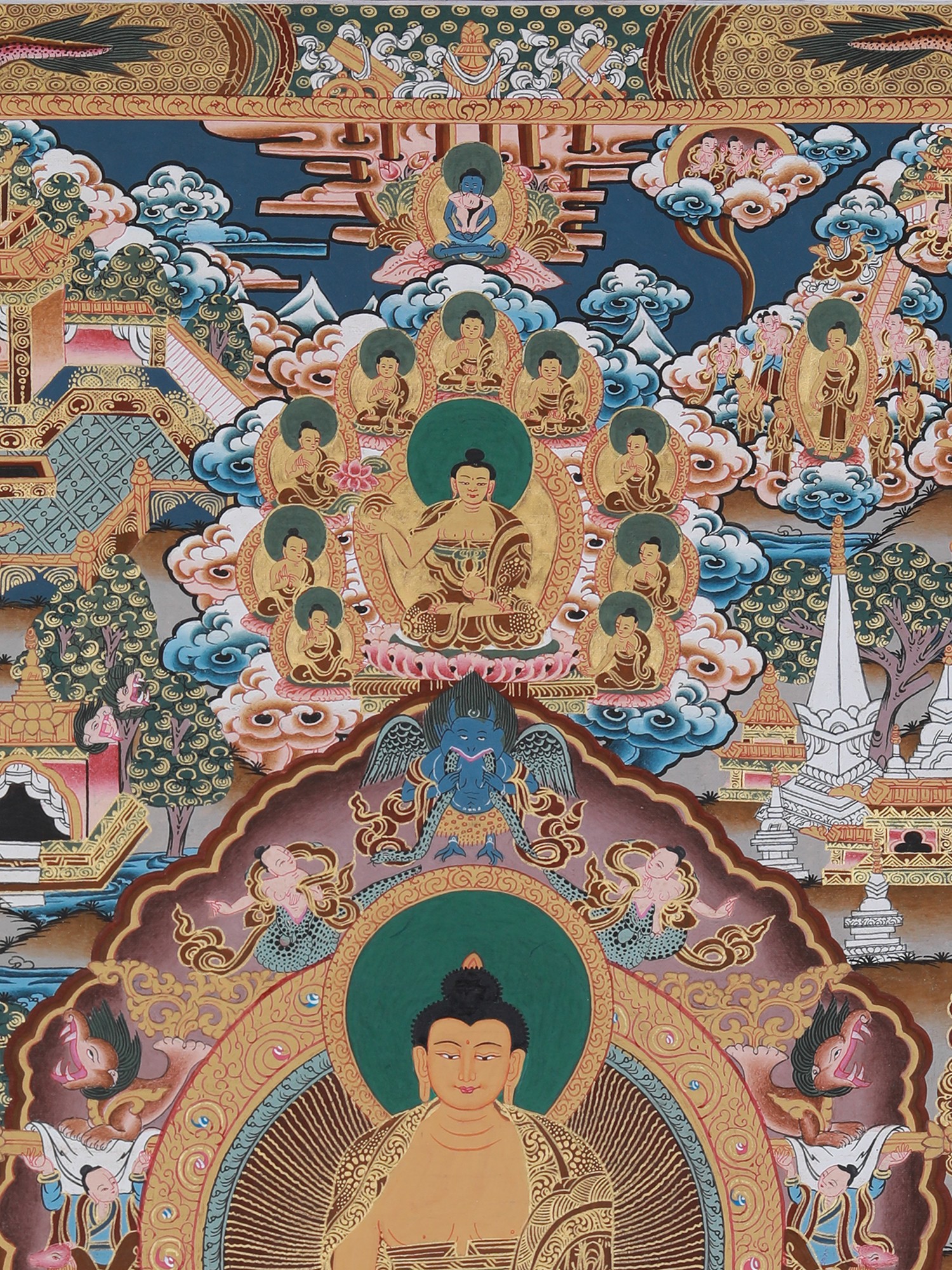 This exquisite Thangka painting is a visual journey through the life and teachings of Buddha, rendered with the intricate detail and vibrant colors characteristic of traditional Tibetan art. More than just a decorative piece, it's a sacred object intended to inspire contemplation, meditation, and a deeper understanding of Buddhist philosophy. The central figure, Buddha himself, radiates peace and serenity, drawing the eye into the heart of the mandala. Surrounding him is a universe of symbolic imagery, inviting the viewer to explore the interconnectedness of all things. The Thangka tradition emerged as a portable and accessible way to impart Buddhist teachings, particularly to a largely nomadic population. Lamas and monks used these painted scrolls to illustrate complex philosophical concepts and narratives. The creation of a Thangka is a deeply spiritual practice, with artists often meditating on the deities and principles they depict. This devotion infuses the artwork with a palpable sense of reverence and power.