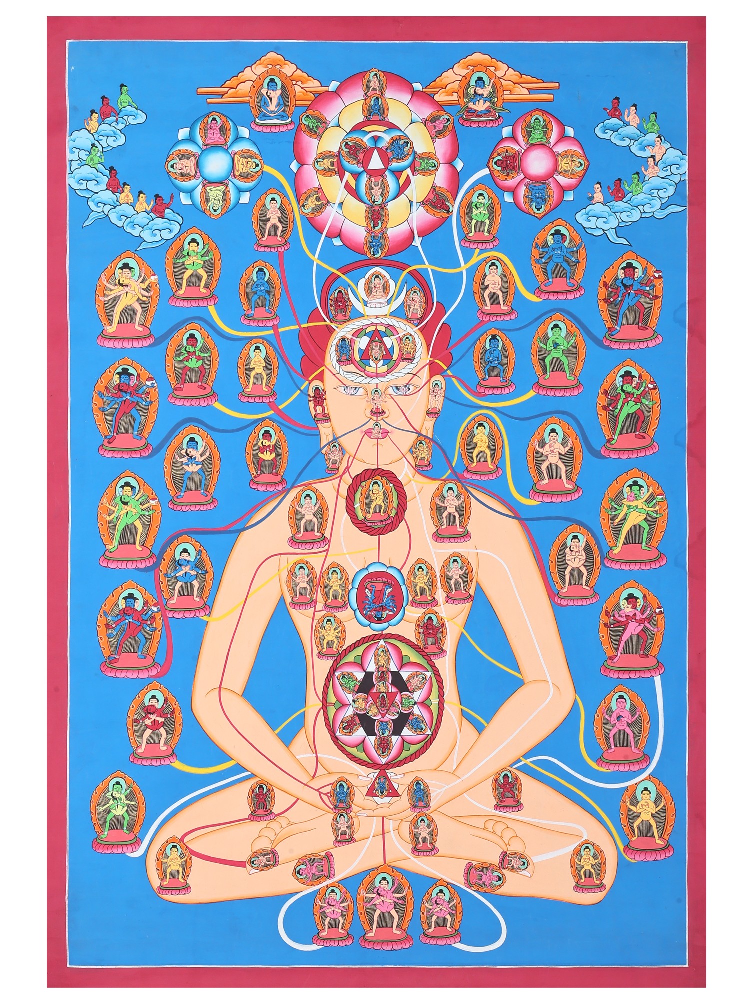 This stunning Tibetan Thangka painting offers a visual representation of the subtle body as understood within Tantric Buddhist traditions. More than just an aesthetic piece, it is a map of inner landscapes, a guide to navigating the complex energies that shape our reality. The central figure, depicted in serene meditation, serves as a microcosm of the cosmos, a vessel containing the potential for enlightenment. Every detail, from the intricate network of channels to the presence of deities, holds symbolic meaning and invites contemplation on the nature of consciousness. This artwork acts as a reminder of our inherent potential for transformation and the interconnectedness of all things.
