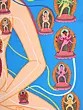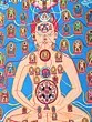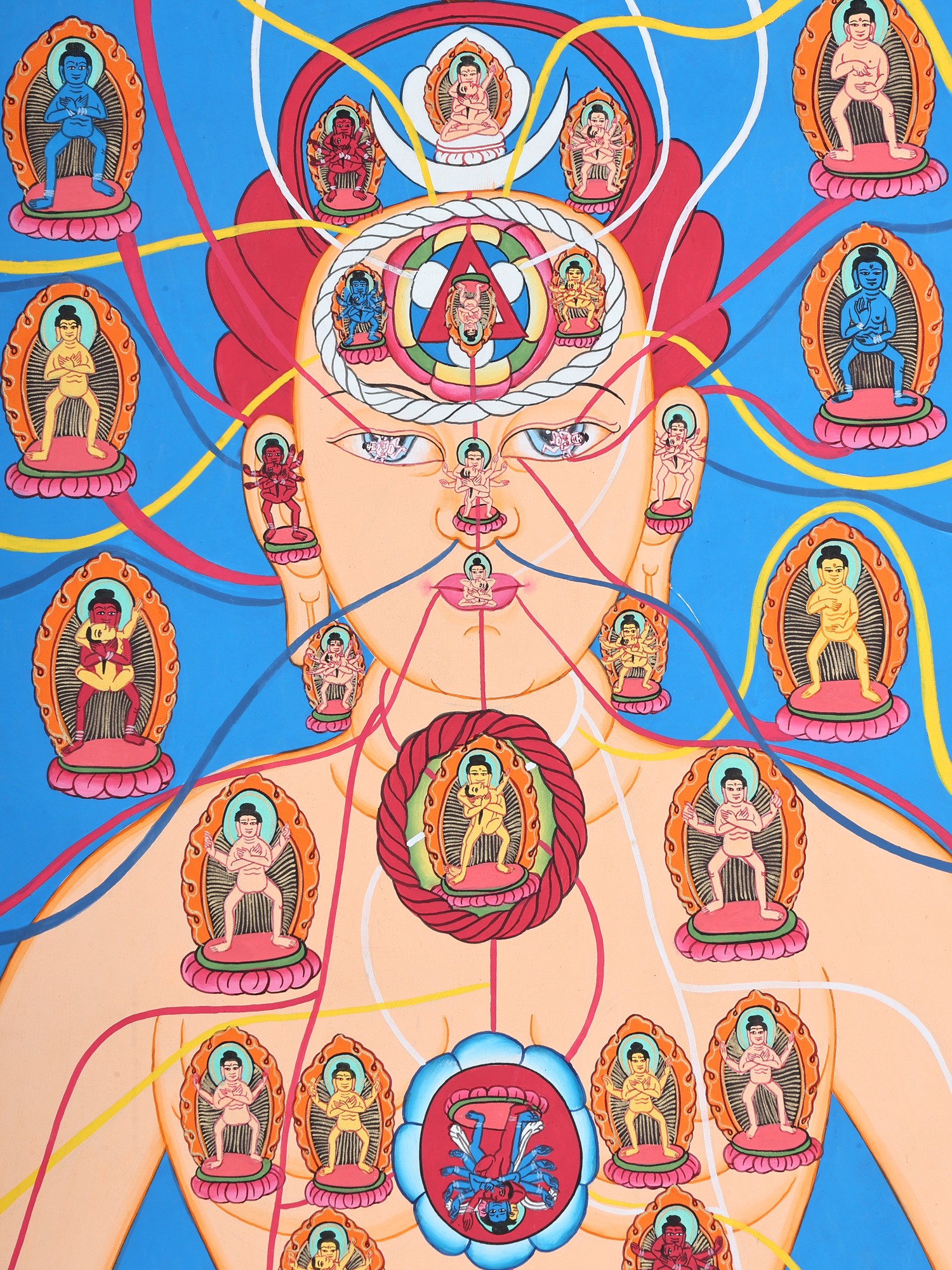 The painting features a network of channels, often visualized as veins of light, that connect various points within the body. These channels, known as nadis, are conduits for vital energy, or prana. The seven major energy centers, or chakras, are prominently displayed, each represented by a unique lotus flower and associated with specific qualities, colors, and deities. Starting from the base of the spine and ascending to the crown of the head, these chakras are believed to govern different aspects of our physical, emotional, and spiritual well-being. The deities present are not merely ornamental; they are archetypal energies that can be invoked and integrated into one's own being through meditation and practice. By visualizing these deities within the corresponding chakras, practitioners seek to unlock their hidden potential and transcend limiting beliefs. The presence of these beings speaks to the deep connection between the human body and the cosmic forces at play.