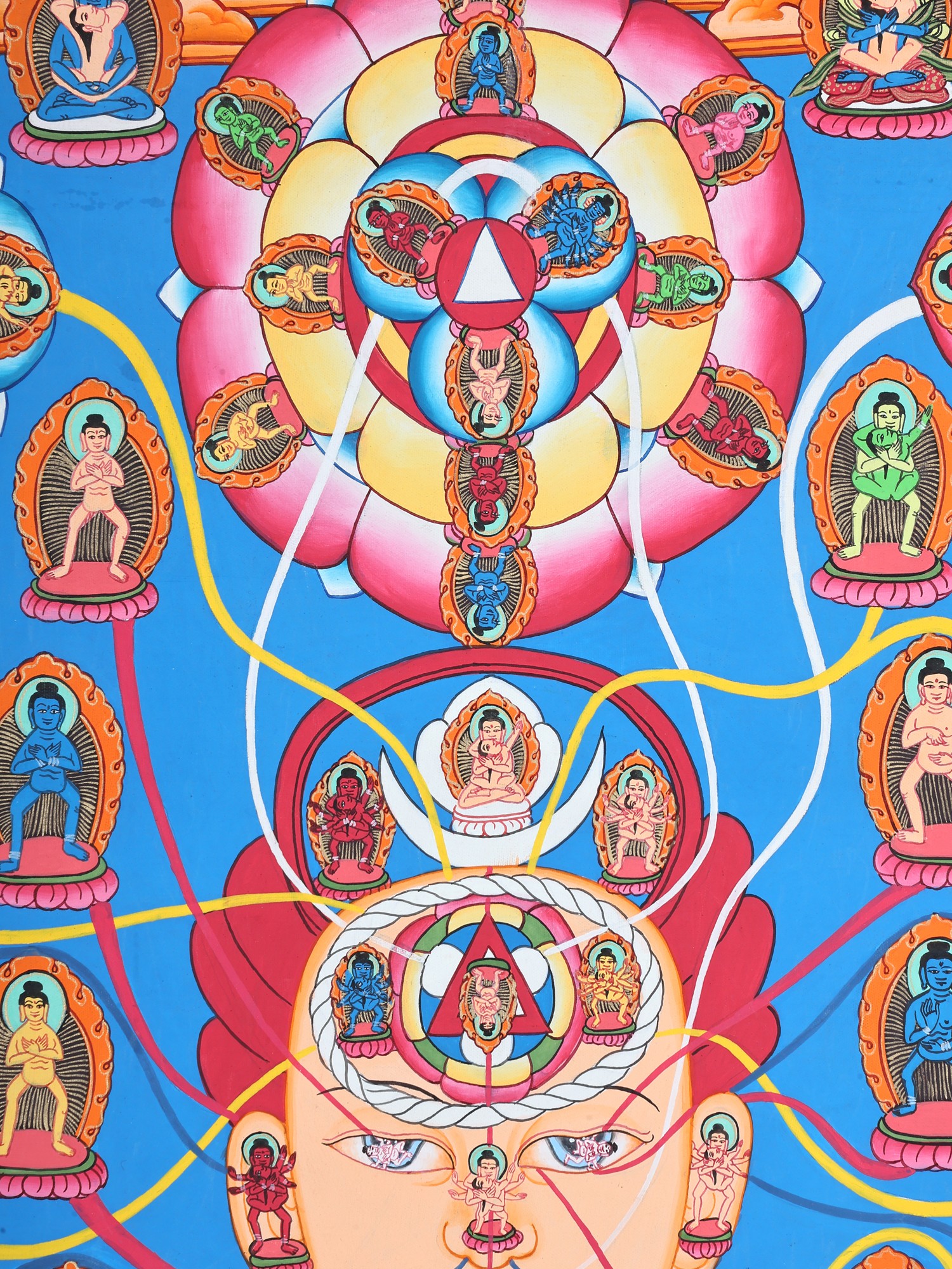 After this, the outline of the form of the deity is sketched with a pencil or charcoal onto the canvas using iconographic grids. The drawing process is followed in accordance with strict guidelines laid out in Buddhist scriptures. The systematic grid helps the artist to make a geometrical and professional painting. When the drawing of the figures is finalized and adjusted, it is then outlined with black ink.