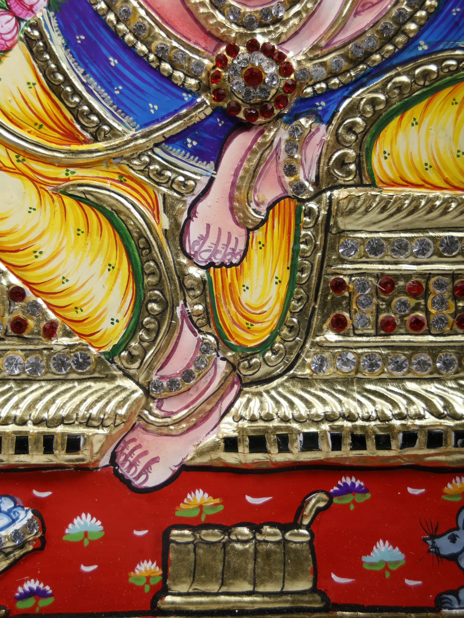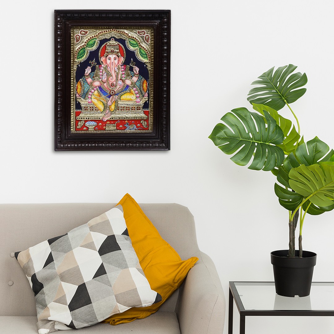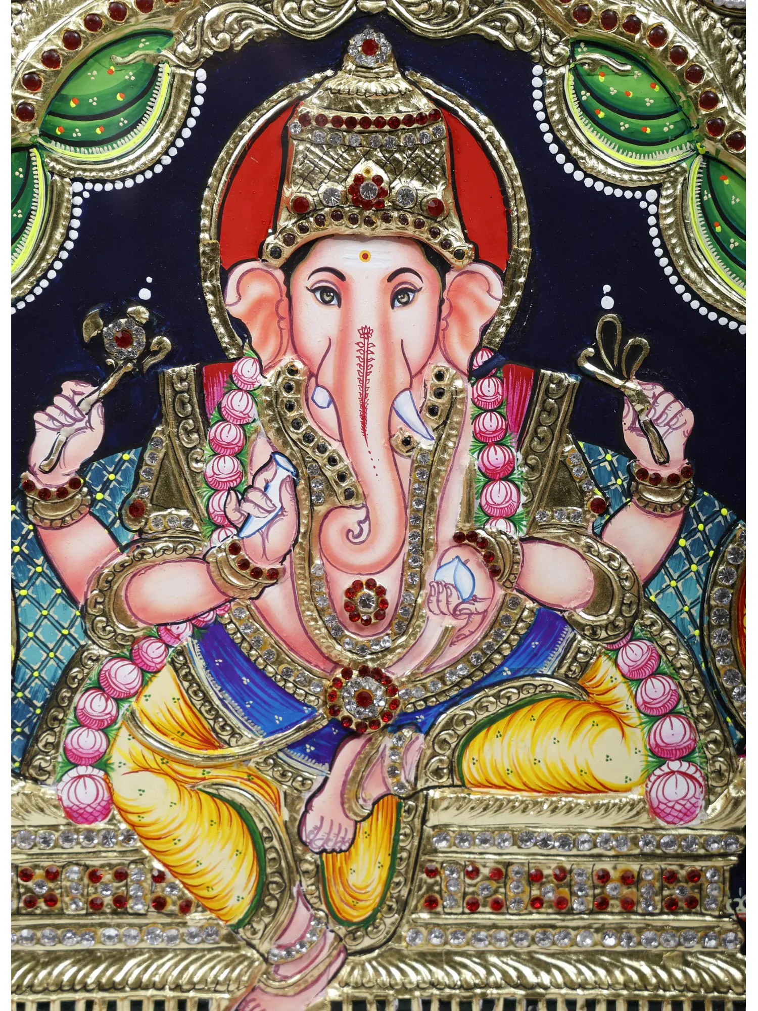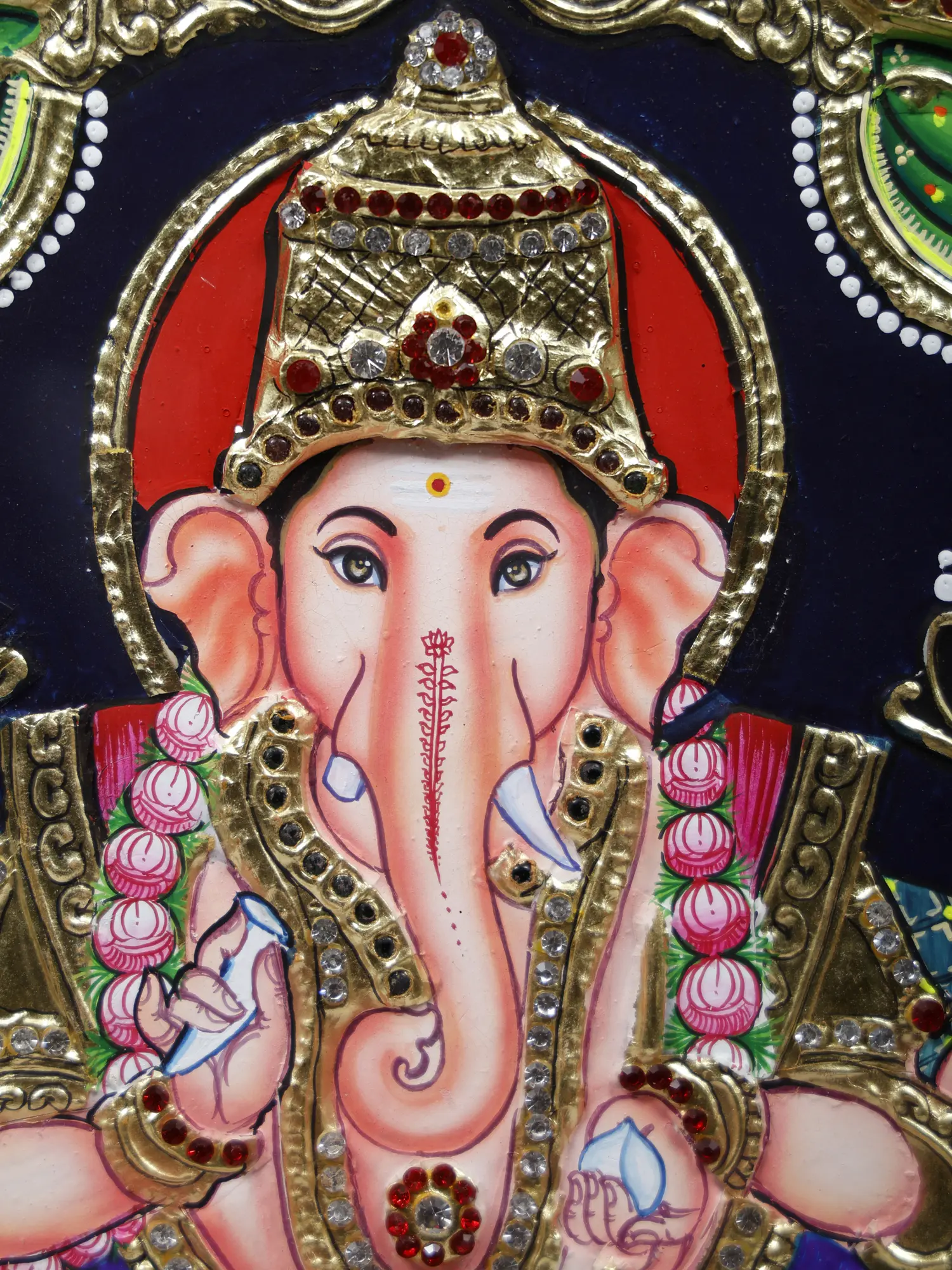 This Ganesha Tanjore painting exudes spiritual grace, crafted with 24-karat gold and adorned with delicate pearl beads that enrich its vibrant color palette.