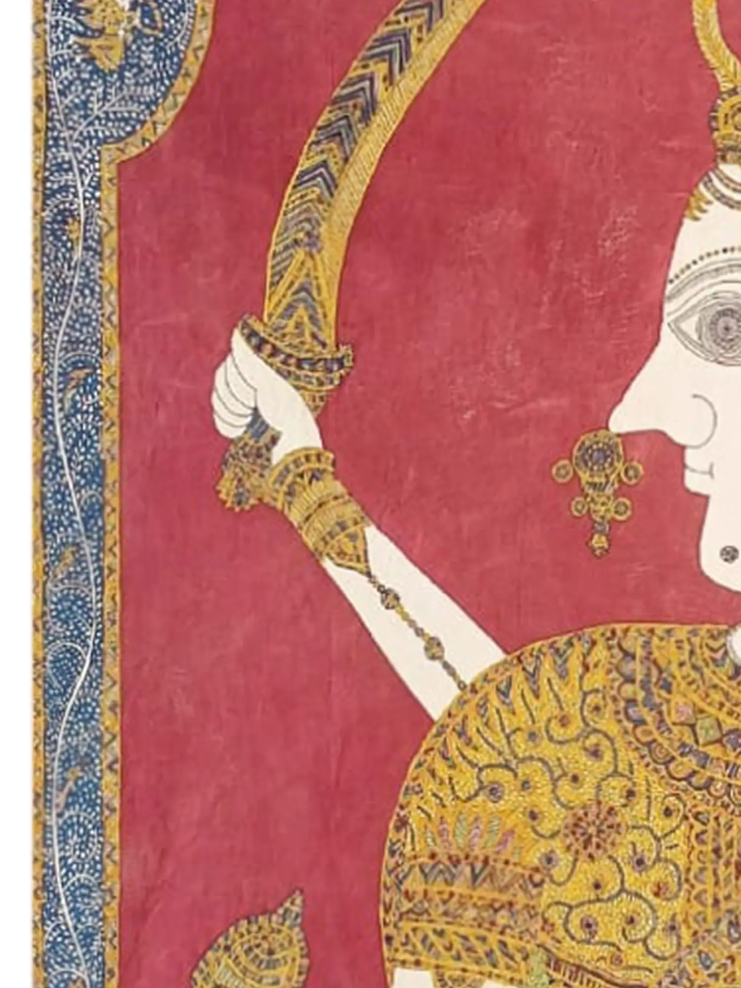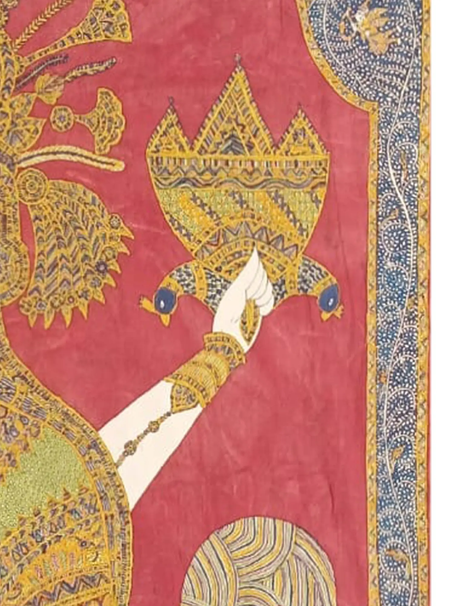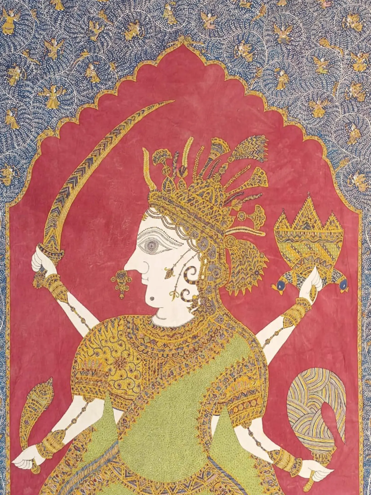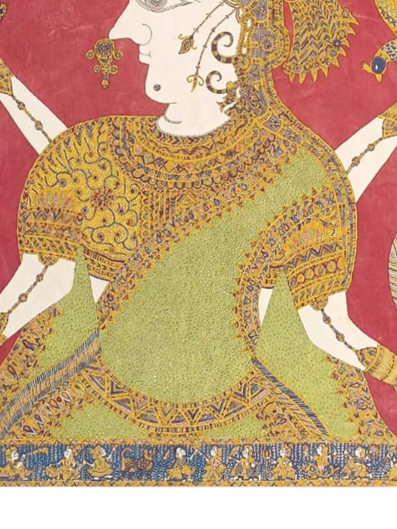 "Chaturbhuja Goddess Jogani" emerges from the depths of mythology, rendered in vivid natural colours on canvas. This painting embodies the philosophy of divine feminine power and cosmic balance, where the Goddess reigns supreme in her four-armed splendour. Through symbolism, the canvas becomes a shrine to devotion and reverence. As the Goddess bestows blessings upon her devotees, each stroke of colour becomes a testament to the eternal dance of creation and destruction, where cycles of life unfold in harmonious rhythm.