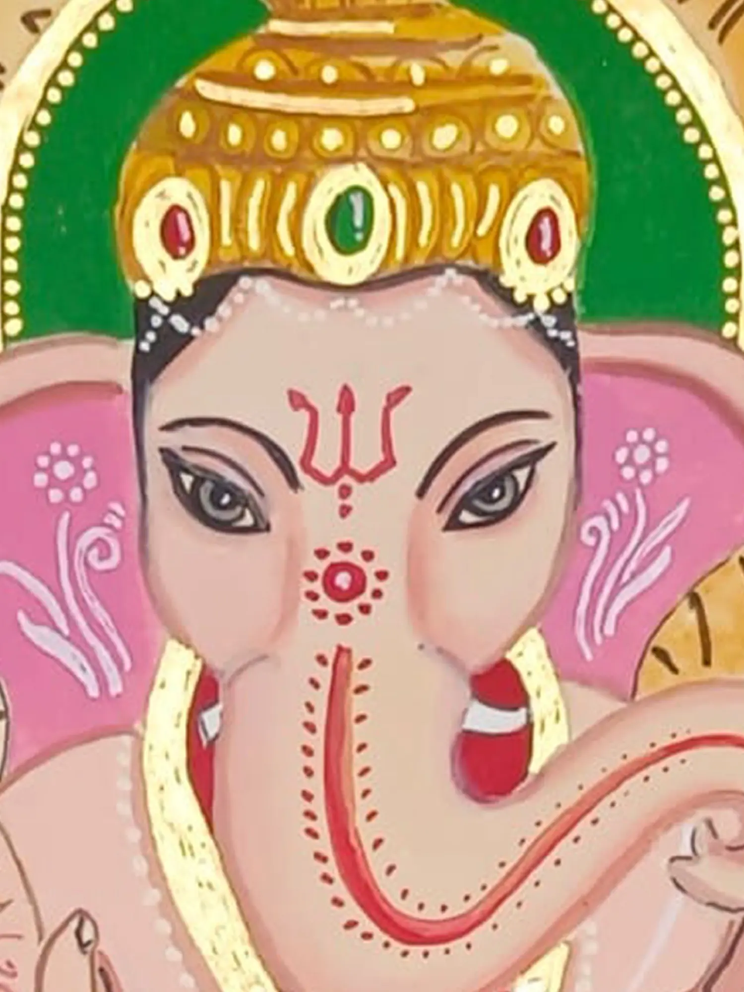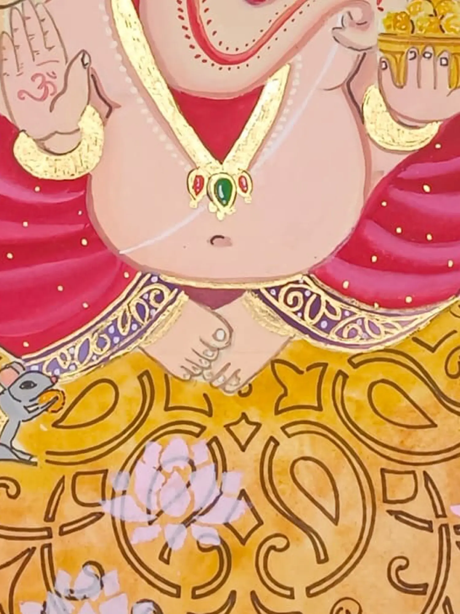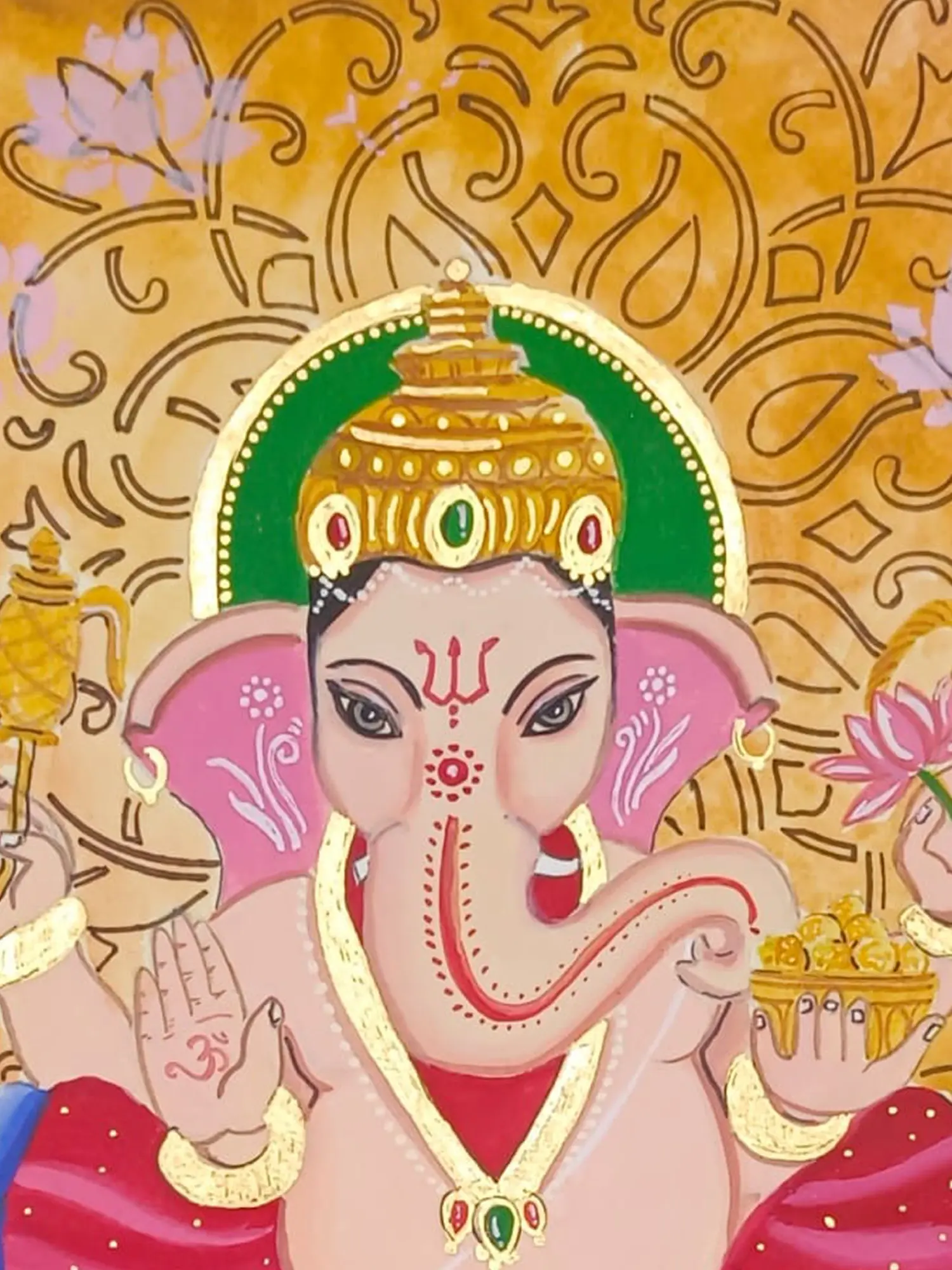 This artwork draws inspiration from the rich tapestry of Hindu mythology, specifically portraying the beloved deity Ganesha, the elephant-headed god. Revered as the patron of arts and sciences, the deva of intellect and wisdom, and the harbinger of good fortune, Ganesha is celebrated across India and beyond. His four arms, or Chaturbhuja, represent his immense power and ability to bestow blessings in all directions.