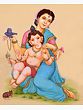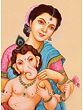Though in an unstitched traditional textile – a sari, but dyed, printed and worn in the modus revealing modernity, even Europeanism at least in the sari’s tint, this representation of Parvati spans the earliest with the latest : the vision of ‘the unborn’ into a frame ‘born to die’. The artist’s creative imagination has a wider perspective, especially in exploring his subject’s inner and multi-dimensionality of her being. While portraying a caressing mother holding her child with her left hand, he has also portrayed a devoted wife holding in her other hand a symbolic ling-icon representing her spouse Shiva, and a mind occupied in his thoughts. The Shiva-ling carried in her right hand is not for her a votive icon for ritual worship but a living entity, and the flower-garland she has laid around is an expression of her devotion to him who is her part, not one beyond or separate from her. She carries a rosary around her fingers but not turning its beads; it stands for a mind circumambulating around his name and image.