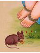 The four-armed Ganesha, a plumpish child as tender as a velvet toy, endowed with soft silken transparent skin identical to child Krishna’s image in Tanjore art, is not unaware of his supreme divine power and his sectarian role. Besides carrying an axe for protecting the innocent and weak and punishing the wicked, and a ‘laddu’, symbolising good, auspicious and riches with which he rewards the right-doers, he holds one of his other two hands in ‘abhaya’ – protective posture, and in the fourth, a pair of lotuses. Apart, his form has been conceived with a peacock feather crest typical of Krishna. Thus, with lotuses in hands and a peacock crest, this son of Shiva stands in between Shaivite and Vaishnava lines in a conciliating role. However, in his demeanour as if seated in an arm-chair, twisted trunk, style of hair and an air of pride as one enjoying some special privilege, the artist has conceived this image of Ganesha essentially as a child.