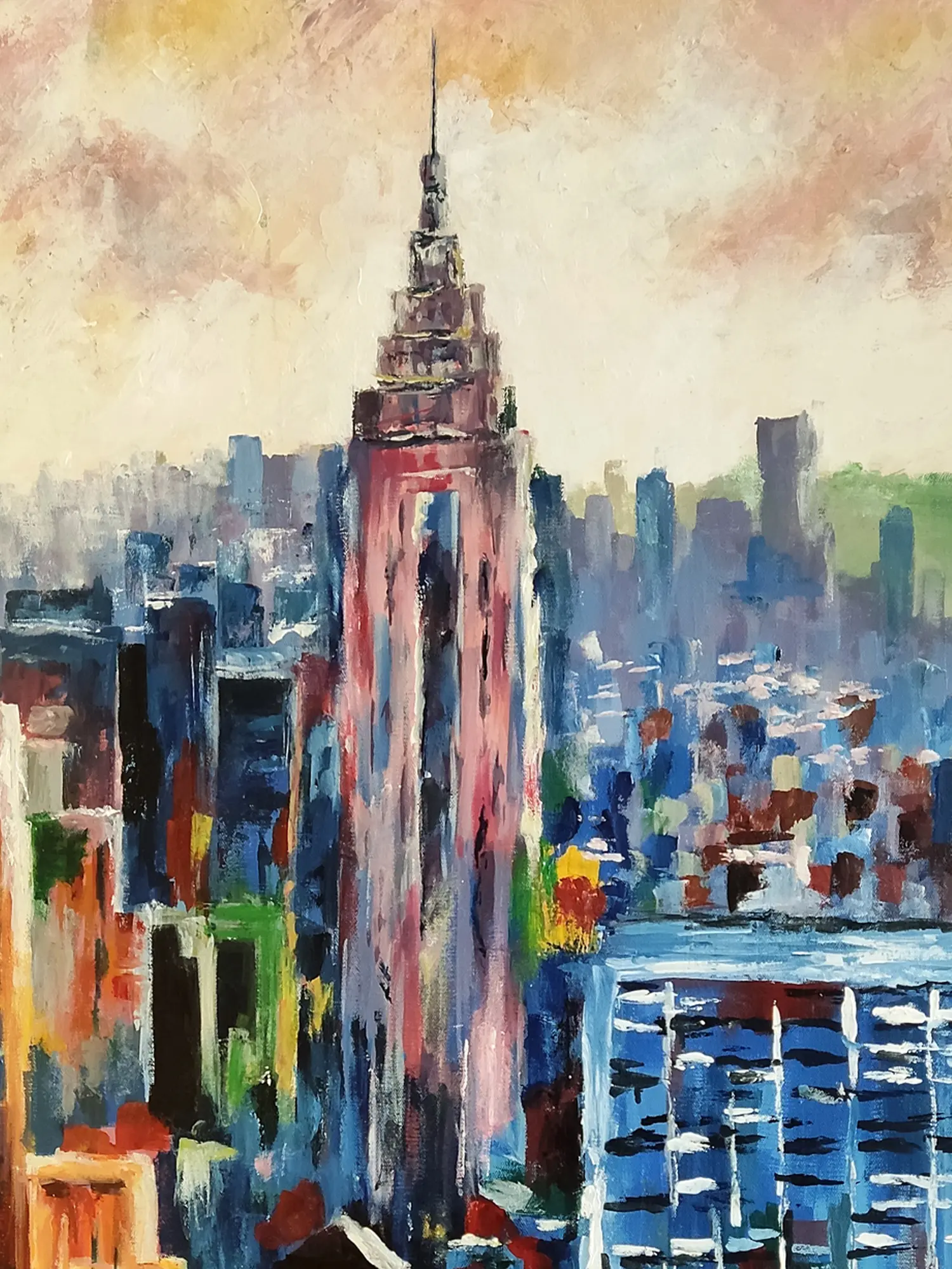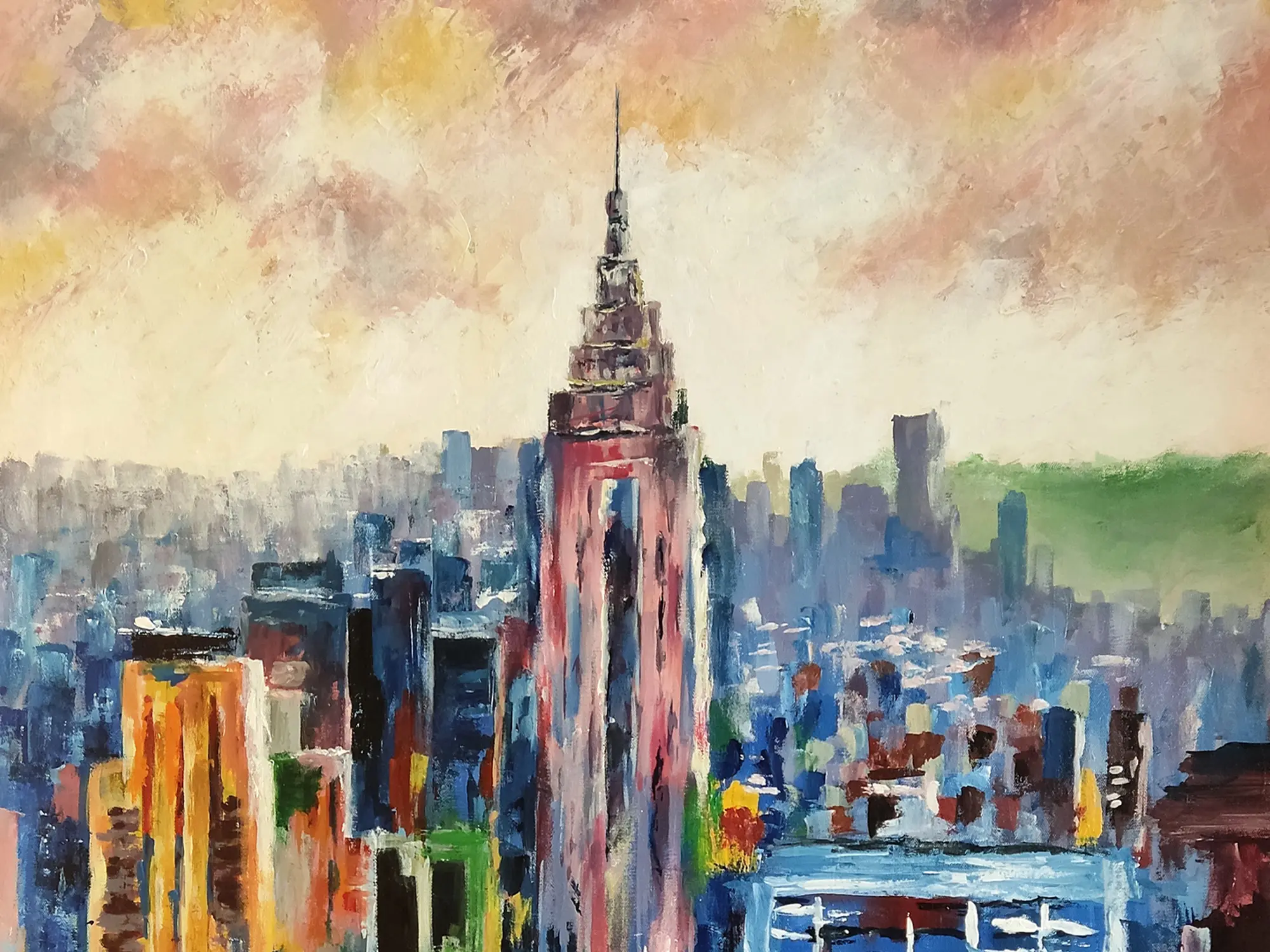 Immerse yourself in the vibrant energy of urban life with a captivating interpretation of a towering metropolis. This piece invites you to experience the majestic scale and dynamic spirit of a cityscape that pulses with an inimitable rhythm. It's more than just a depiction; it's an emotional resonance of a world built by ambition and dreams.