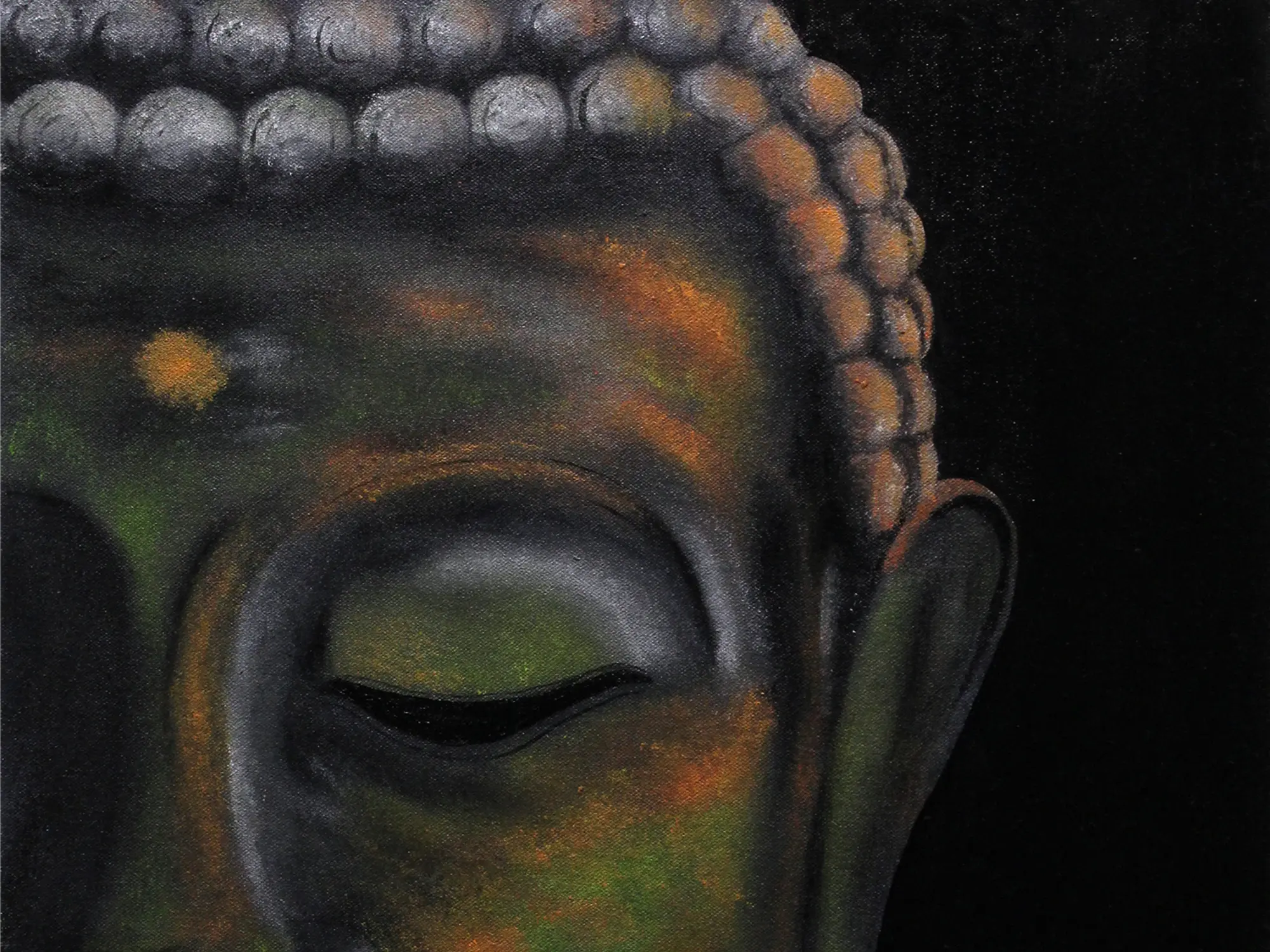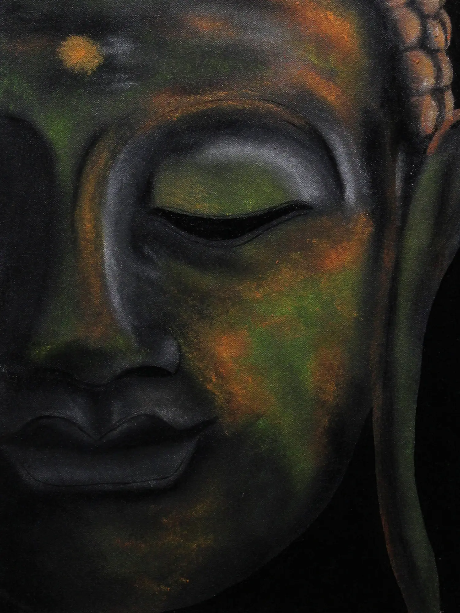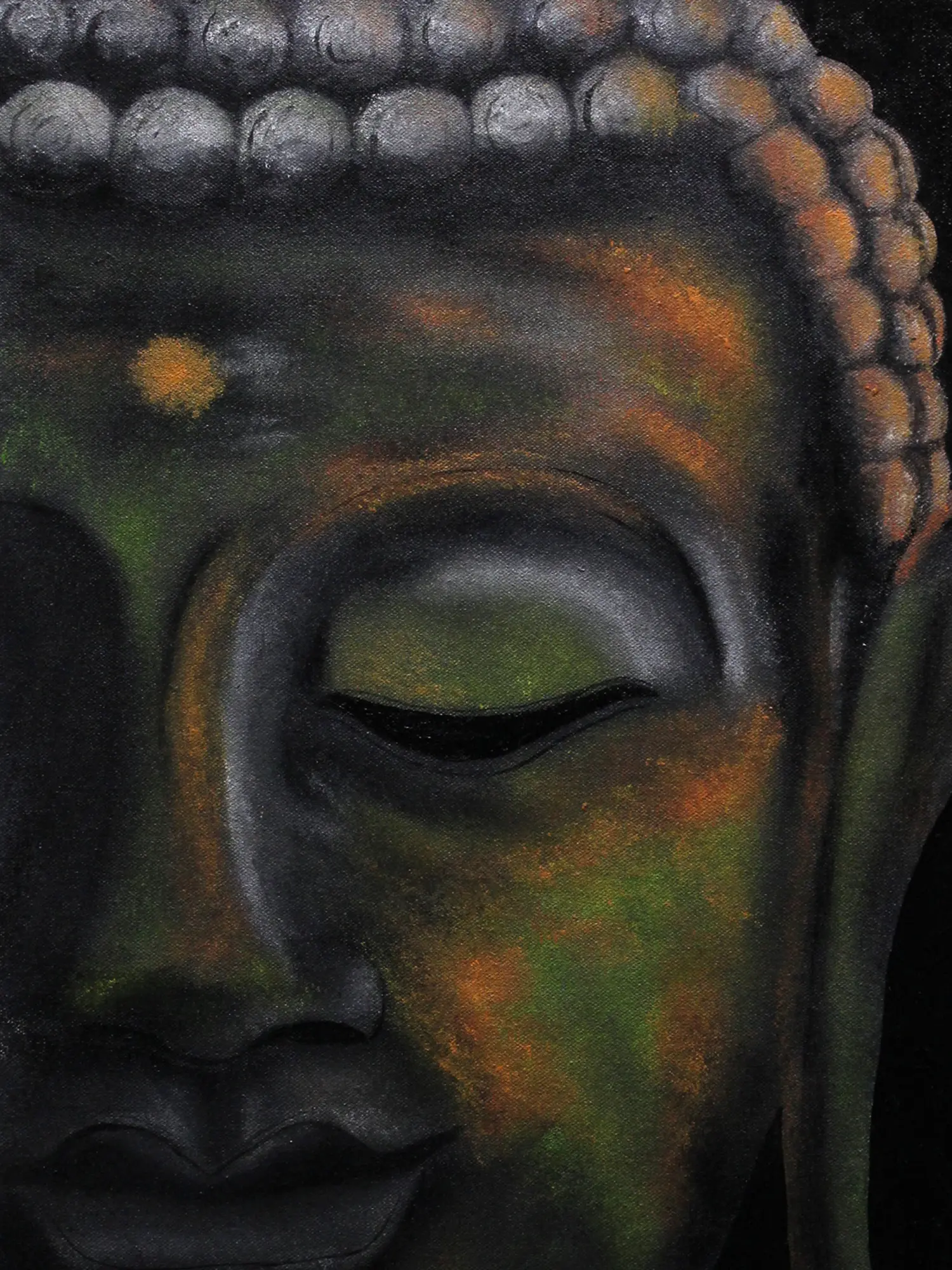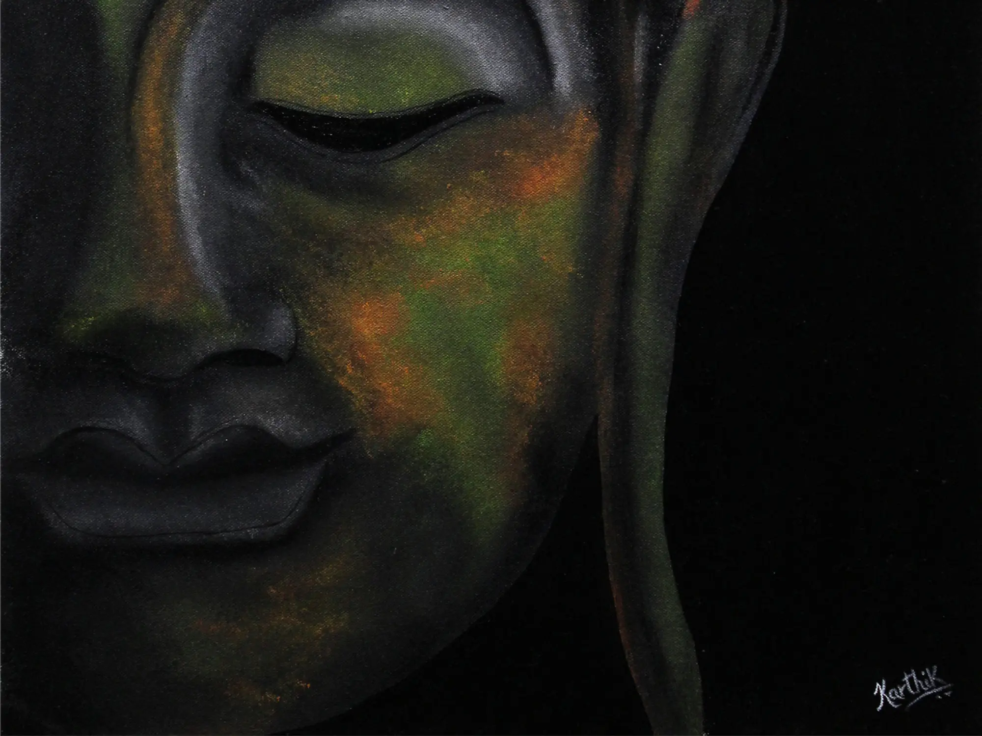 Buddha in the Dhyana Mudra is the most loved and represented figure. This painting titled "Colorful Face of Buddha" by Karthik is a depiction of the same but in a colorful manner. This painting mesmerizes with fine strokes of oil on canvas. It depicts half of the Buddha's serene countenance adorned in vibrant hues of green and orange. The peaceful face of Buddha with half-closed eyes symbolizes harmony and duality. The captivating visage invites contemplation, prompting viewers to explore the harmonious balance between tranquility and dynamism and find profound wisdom in the union of opposites.