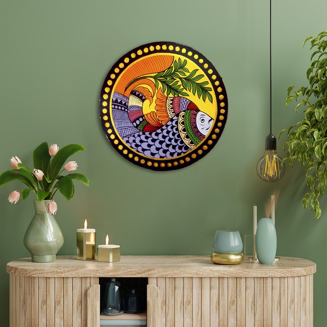 In Indian art, fishes symbolize abundance, fertility, and transformation, garnering respect through symbolic representation. Jagriti Bhardwaj's "Colorful Fish Painting on MDF Wood Plate" beautifully epitomizes this symbolism in a Madhubani style with a modern twist. The fish, coiled at the frame's bottom, exudes a dynamic energy. The yellow backdrop and green fauna enhance the vibrancy, creating a harmonious blend of tradition and contemporary aesthetics.
