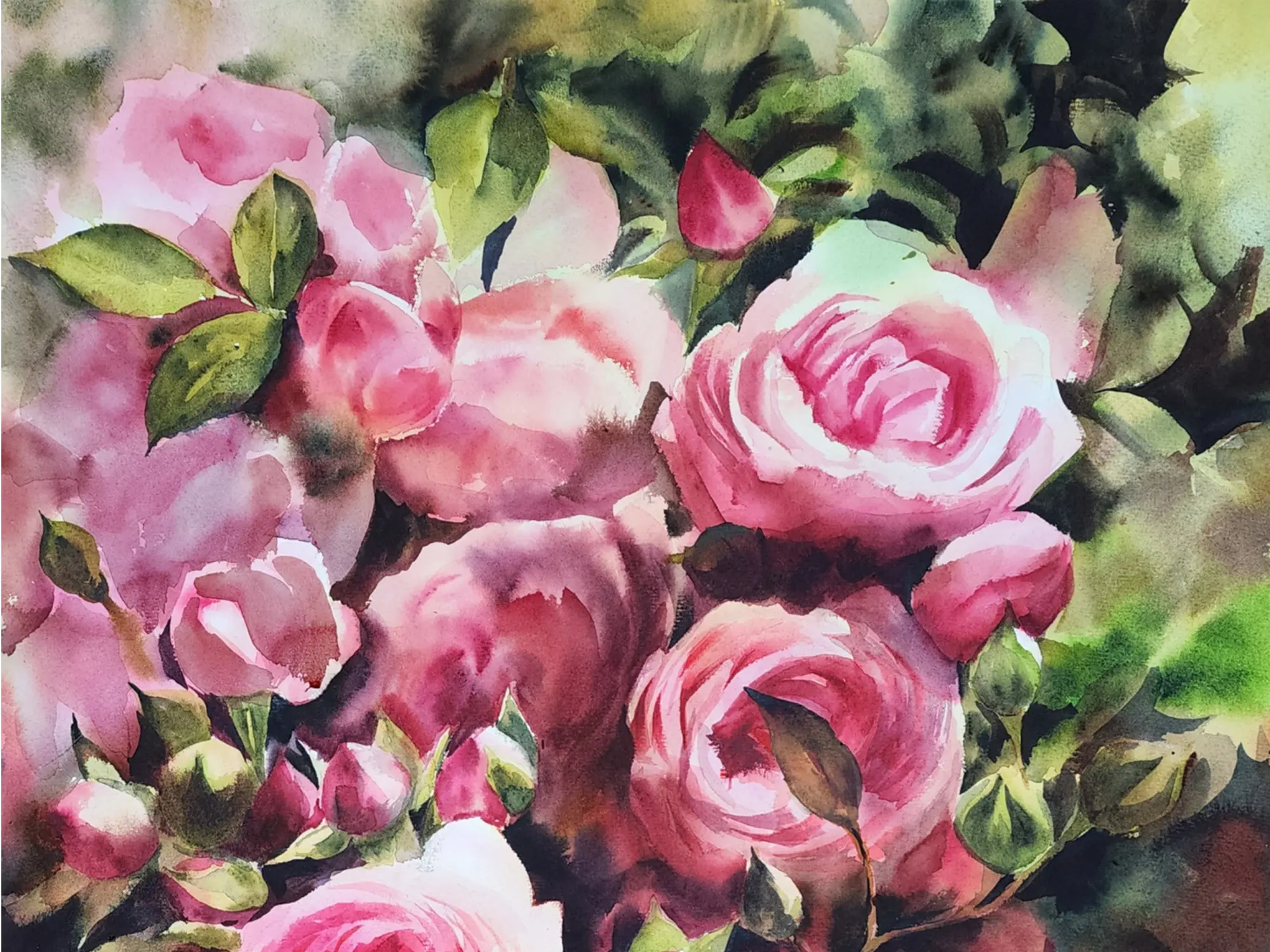 Observe the intricate dance of light and shadow as it defines the velvety texture of each rose, from tightly furled buds to fully opened blossoms. The rich palette, dominated by a spectrum of pinks and deep greens, creates a captivating visual depth. The scale of this piece, measuring 30.00 inches in height and 22.00 inches in width, allows for a truly immersive experience, drawing you into its floral world. You'll appreciate the subtle variations in tone and the delicate bleeding of color that are characteristic of true watercolor artistry.