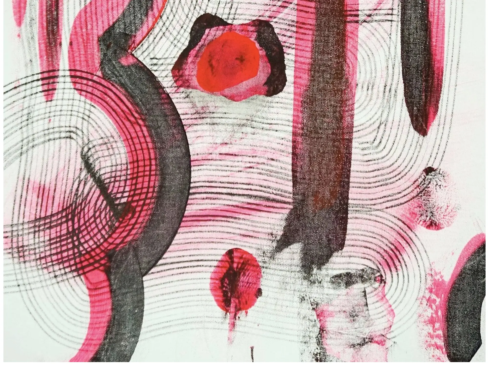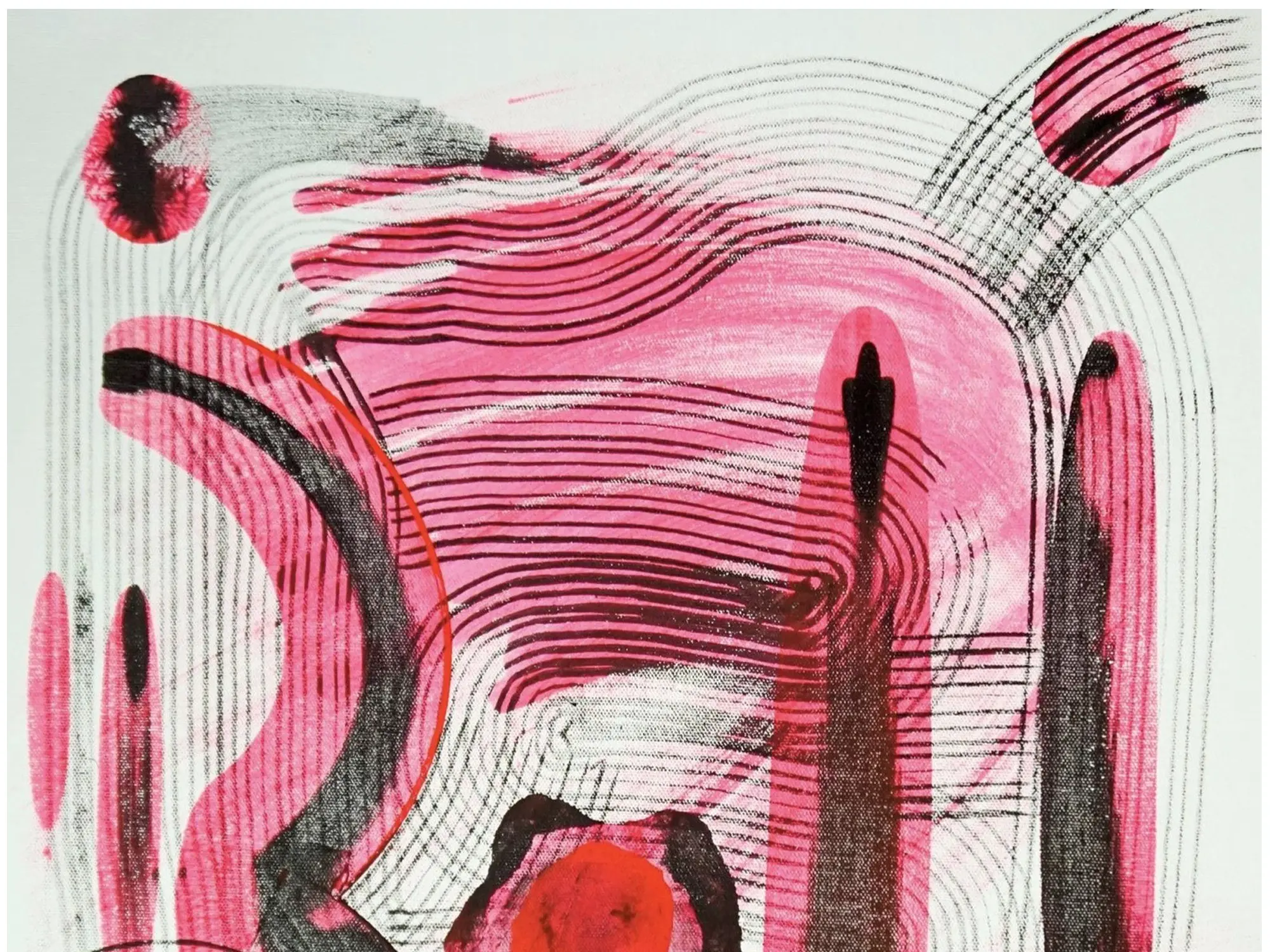 The canvas presents a compelling dance of bold lines and soft washes, dominated by striking shades of pink and deep charcoal. Organic, curvilinear forms intertwine with precise, concentric patterns, evoking a sense of both movement and rhythm. Subtle, almost luminous red accents add a touch of intensity, hinting at passion and vitality within the abstract landscape.