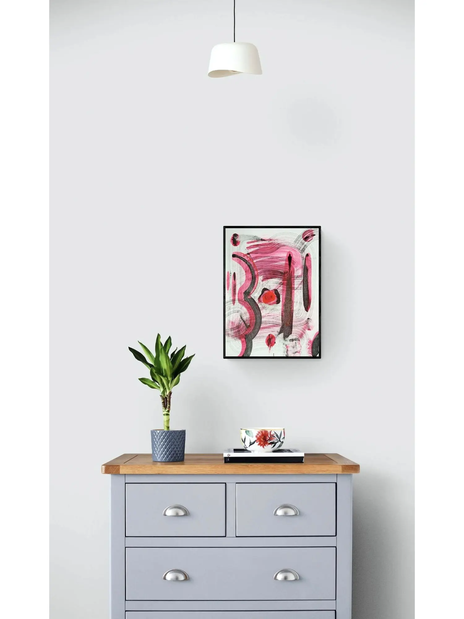 Perfect for a modern living room, a sophisticated home office, or an inspiring studio space, this artwork breathes life into any interior. Its 22-inch height and 16-inch width make it versatile for placement, capable of commanding attention without overwhelming the surrounding décor. It serves as an exquisite statement piece, enhancing your aesthetic with its bold, contemporary appeal.