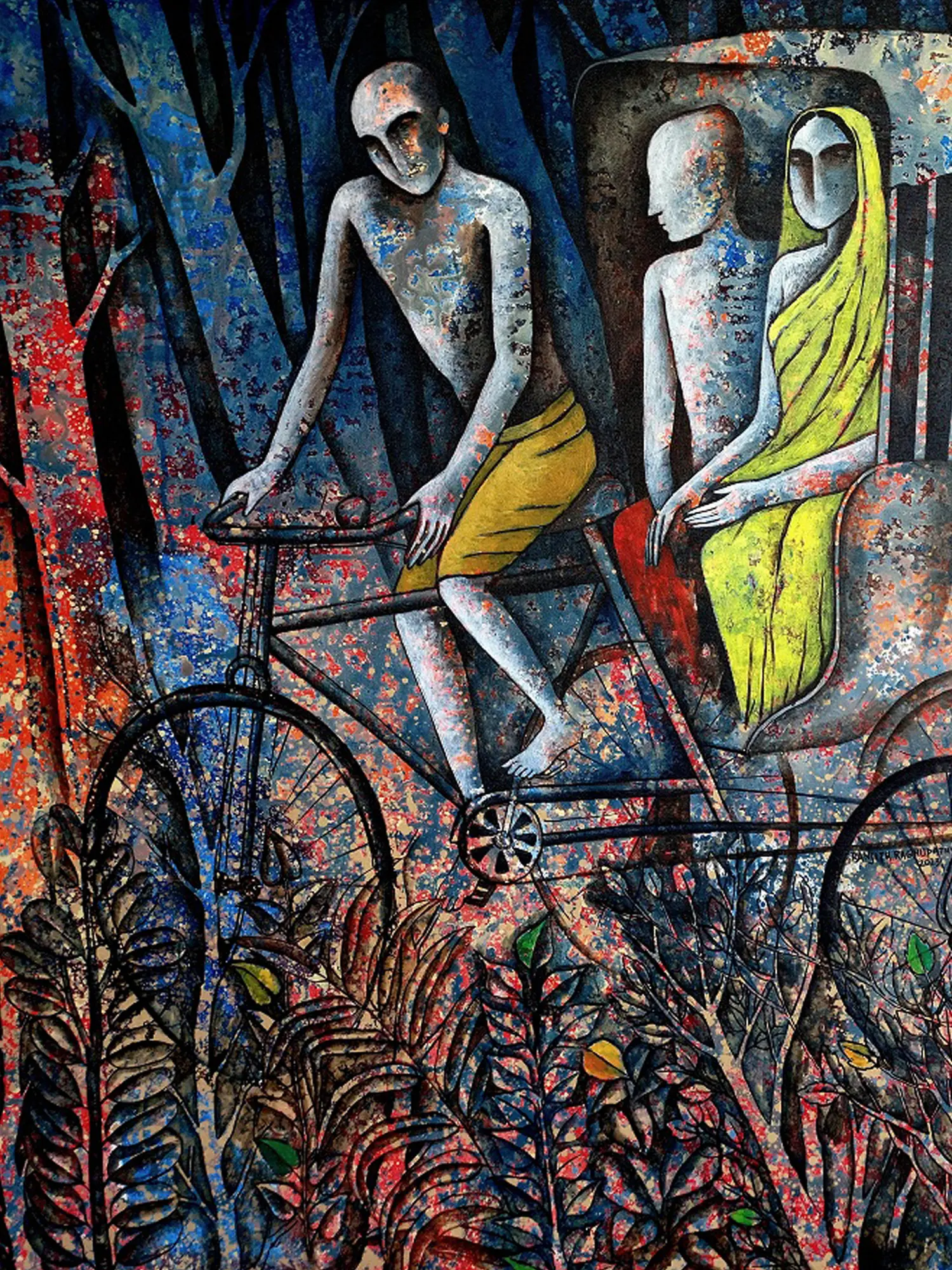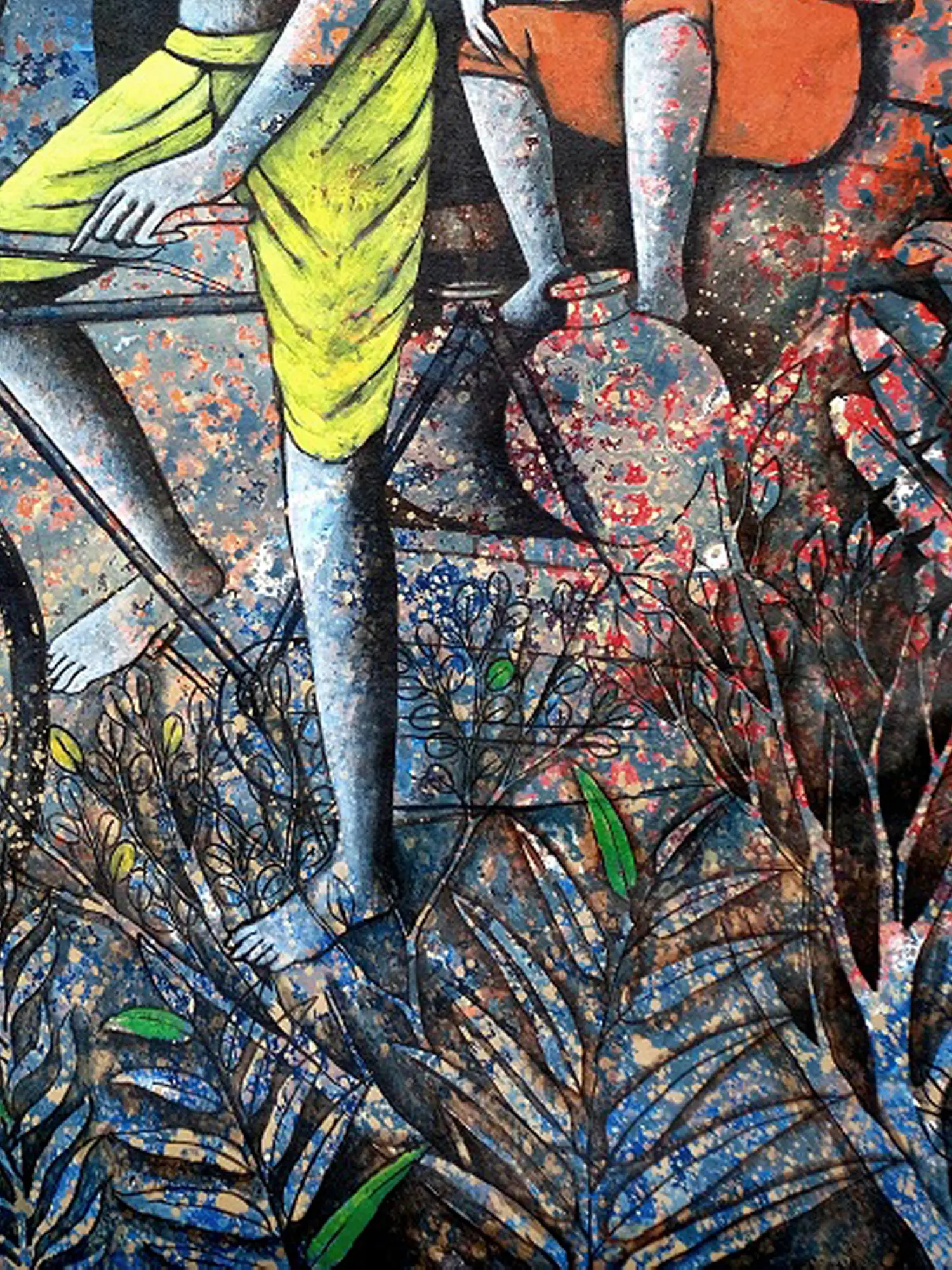 Each stroke of acrylic on canvas is a deliberate expression of mastery, showcasing Ranjith Raghupathy's signature technique. The rich pigments are applied with an impasto style, building layers of texture that lend a tangible depth to the scene. You will appreciate the meticulous attention to detail, from the rugged forms of the figures to the intricate rendering of the surrounding foliage.