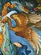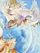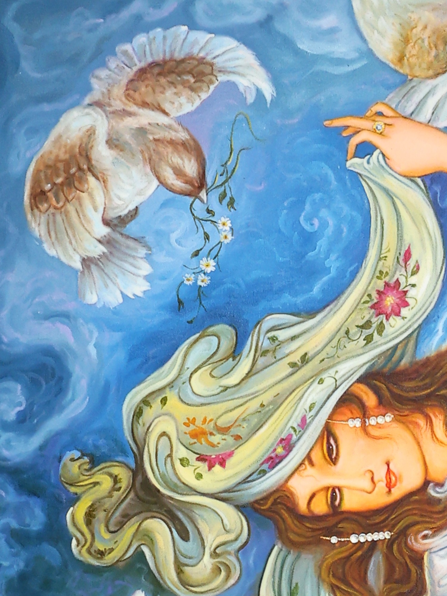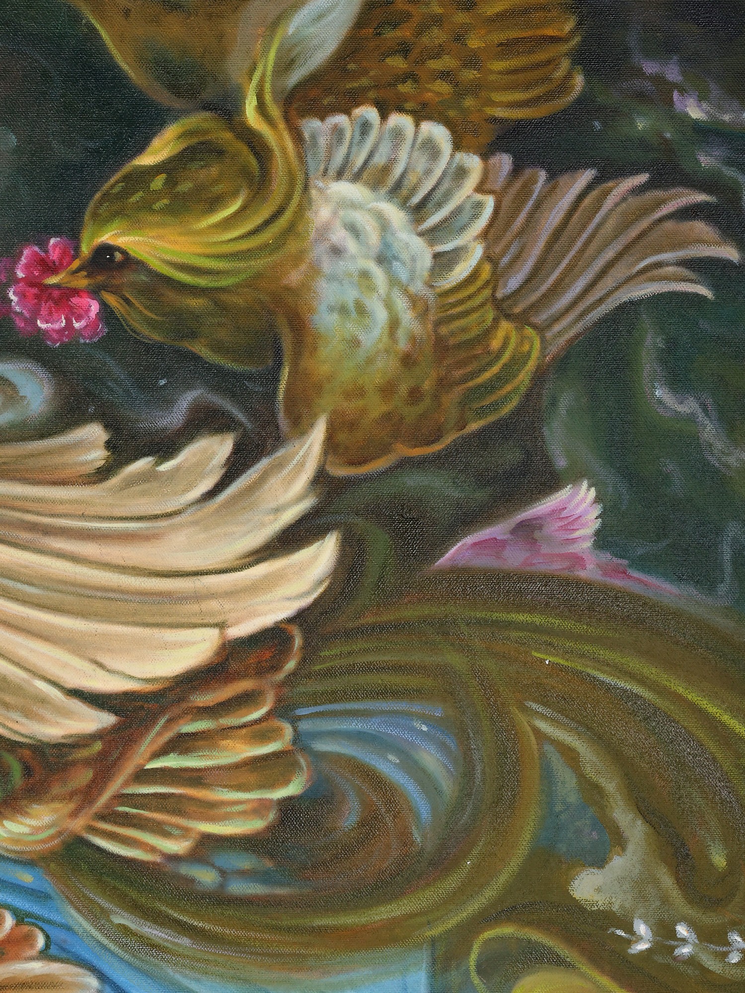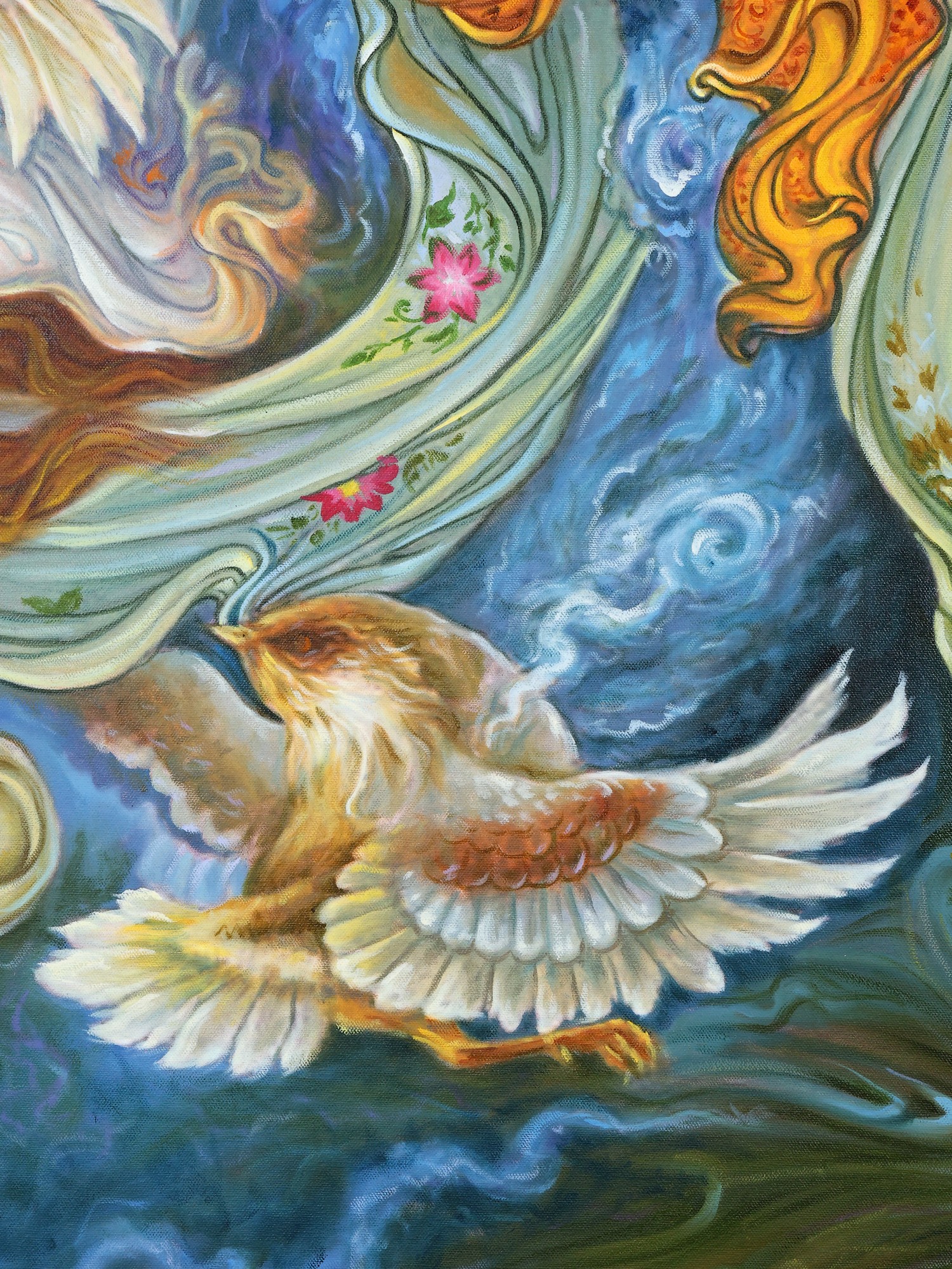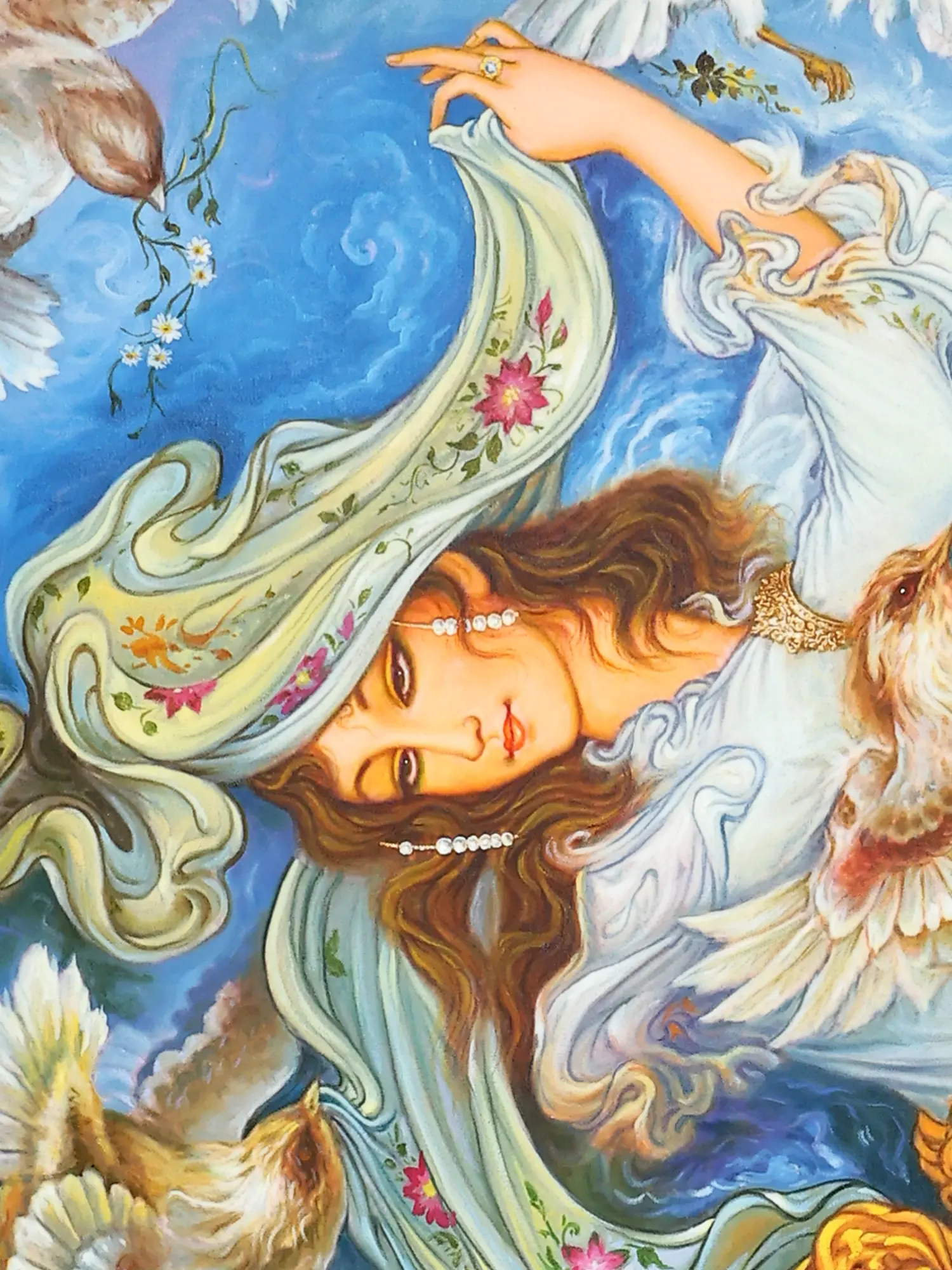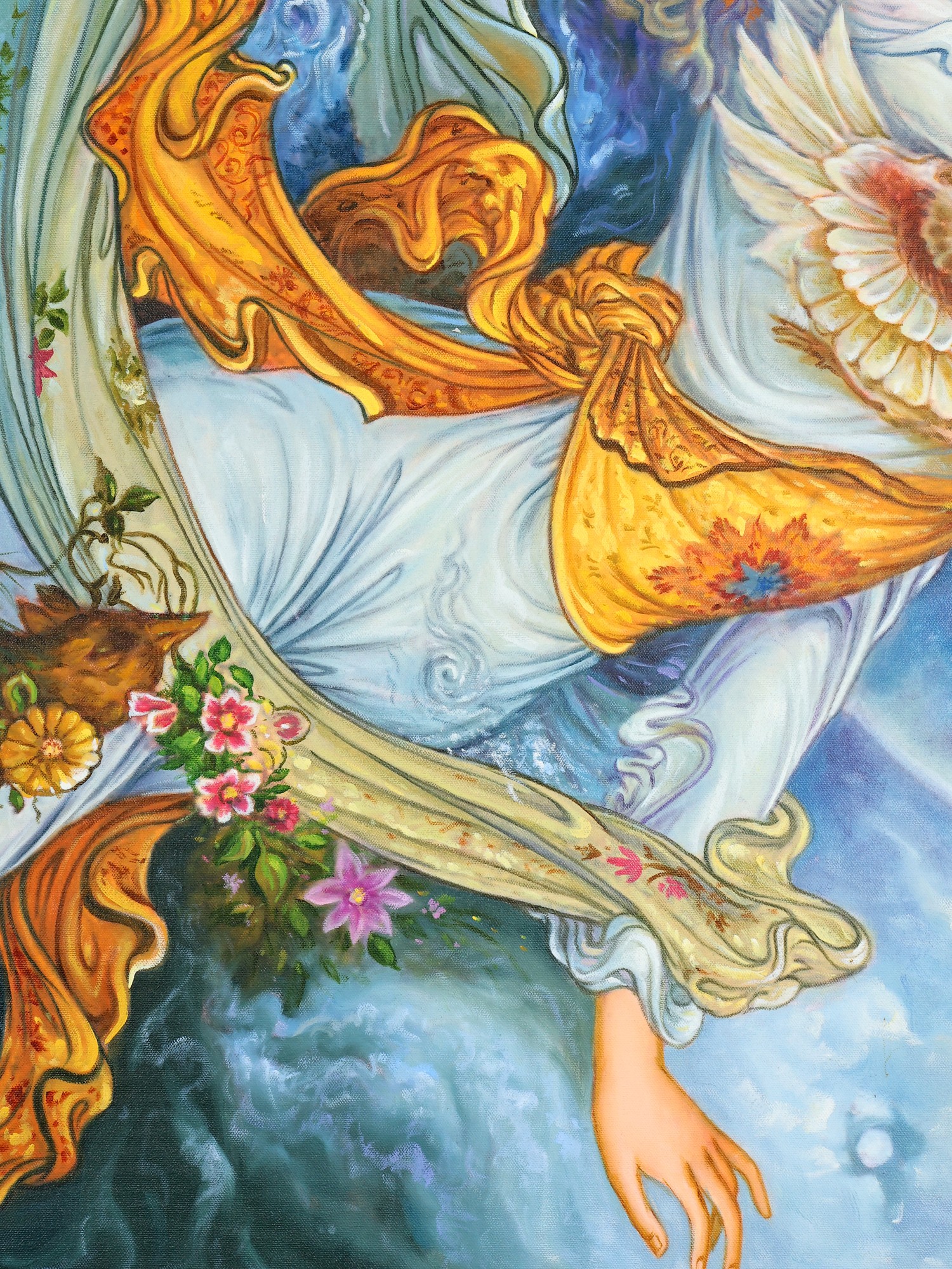 Birds sweep across the canvas, merging into the currents of her drapery until the boundary between woman and nature dissolves. Flowers bloom mid-air, ribbons unfurl like rivers, and the entire scene breathes with the rhythm of a world untethered from gravity.