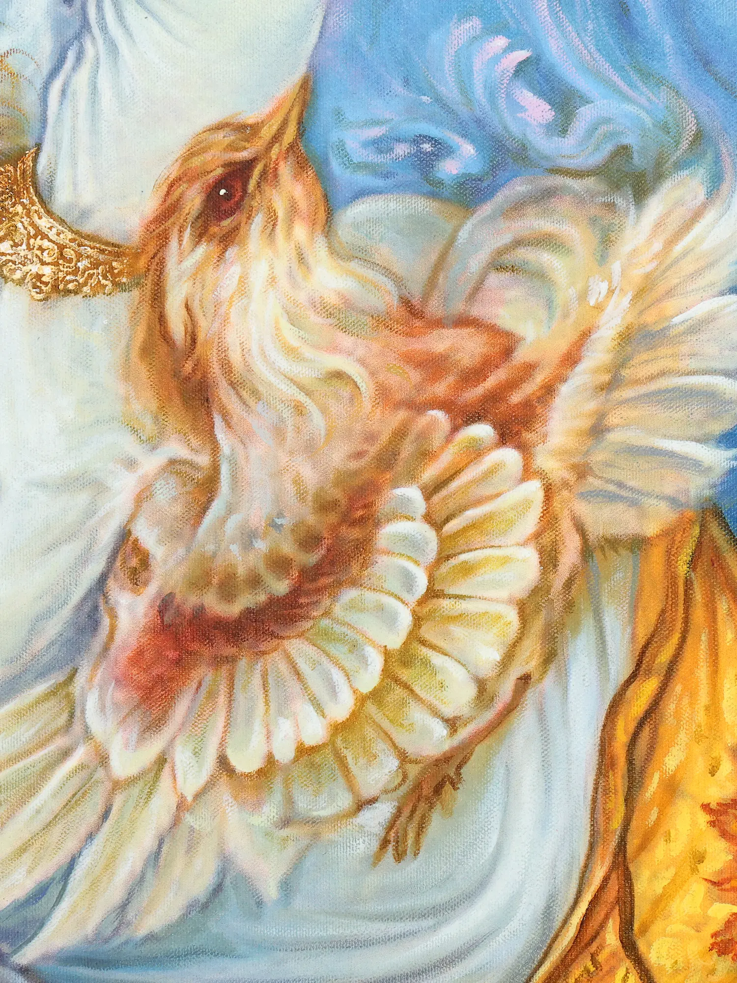 This life-size oil on canvas unfolds like a vision suspended between dream and sky, where a celestial muse drifts in an ecstatic dance woven from wind, wings, and moonlight. The entire composition moves as if carried by a single breath- garments swirling in liquid motion, hair lifting like a flame, and flocks of birds orbiting her body in a choreography of weightless grace.