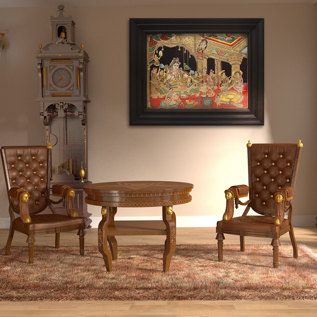 On the ceiling is also Vaata-patra Shaayi Krishna, lying on a banyan leaf, an auspicious and dotting image, residing in which Krishna appears to be appreciating the grandeur of his own court. The visual language of the painting and its masterful details are all inspired by the courts of Thanjavur and Maratha Nayakas, who patronized the regal art form, resulting in an aesthetics that is eternally luxurious, perfect for bringing divine beings on earth.