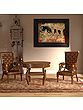 The architecture of Krishna’s court is made divine not only by the rich use of gold embossing, but also by the sacred images of Gandabherunda (a cosmic form of Krishna) above the Lord, standing Krishna painting, and Dashavatara and Ashtalakshmi icons in the ceiling.