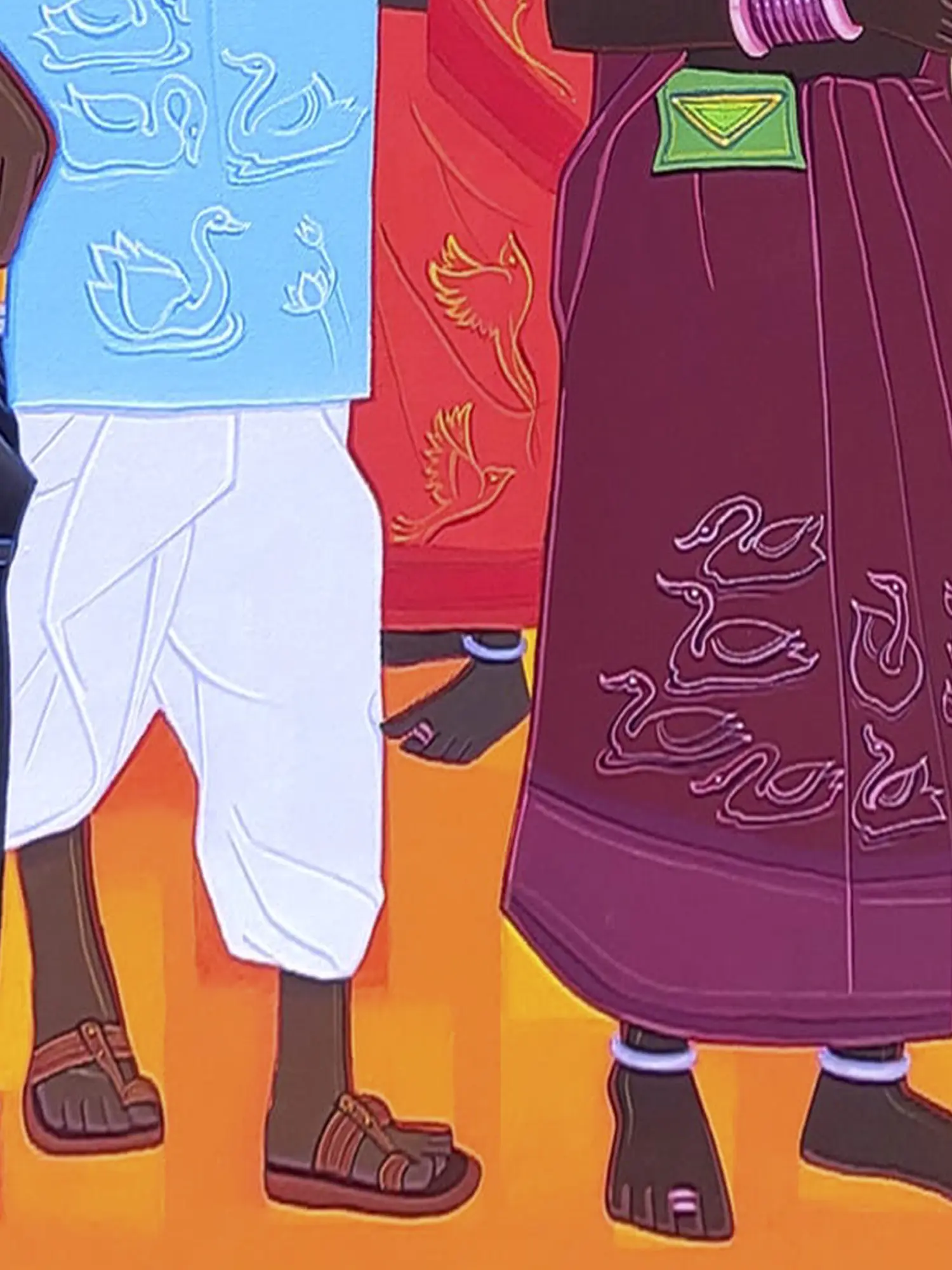 The striking composition, measuring 24 inches in height and 24 inches in width, is thoughtfully balanced, drawing the eye across the canvas with its interplay of figures and vibrant hues. Notice the meticulous rendering of traditional attire, each fold and drape rendered with sensitive precision. The artist’s choice of a warm, enveloping background enhances the intimacy of the scene, while subtle symbolic motifs, like the graceful birds adorning the fabrics, add layers of meaning for you to discover.