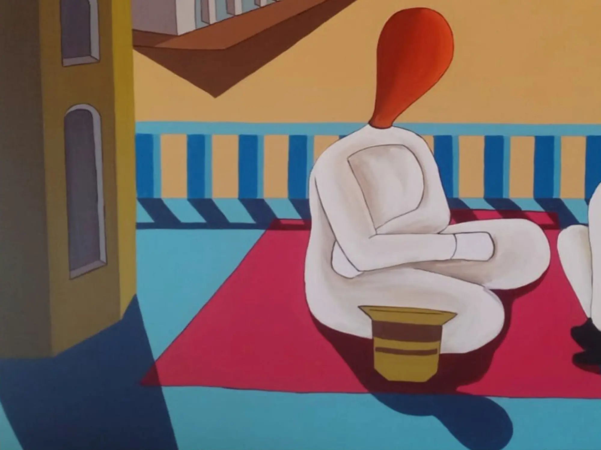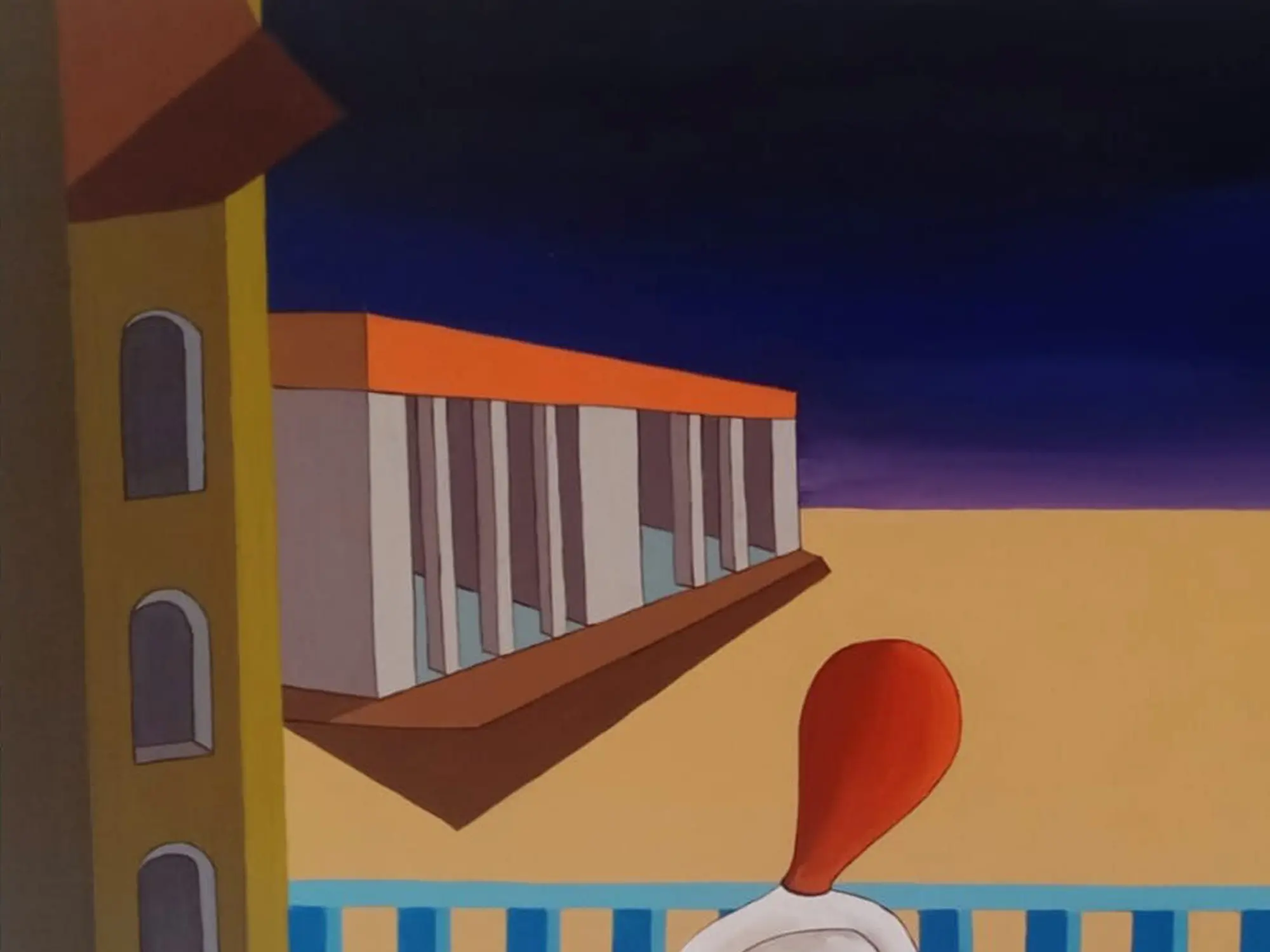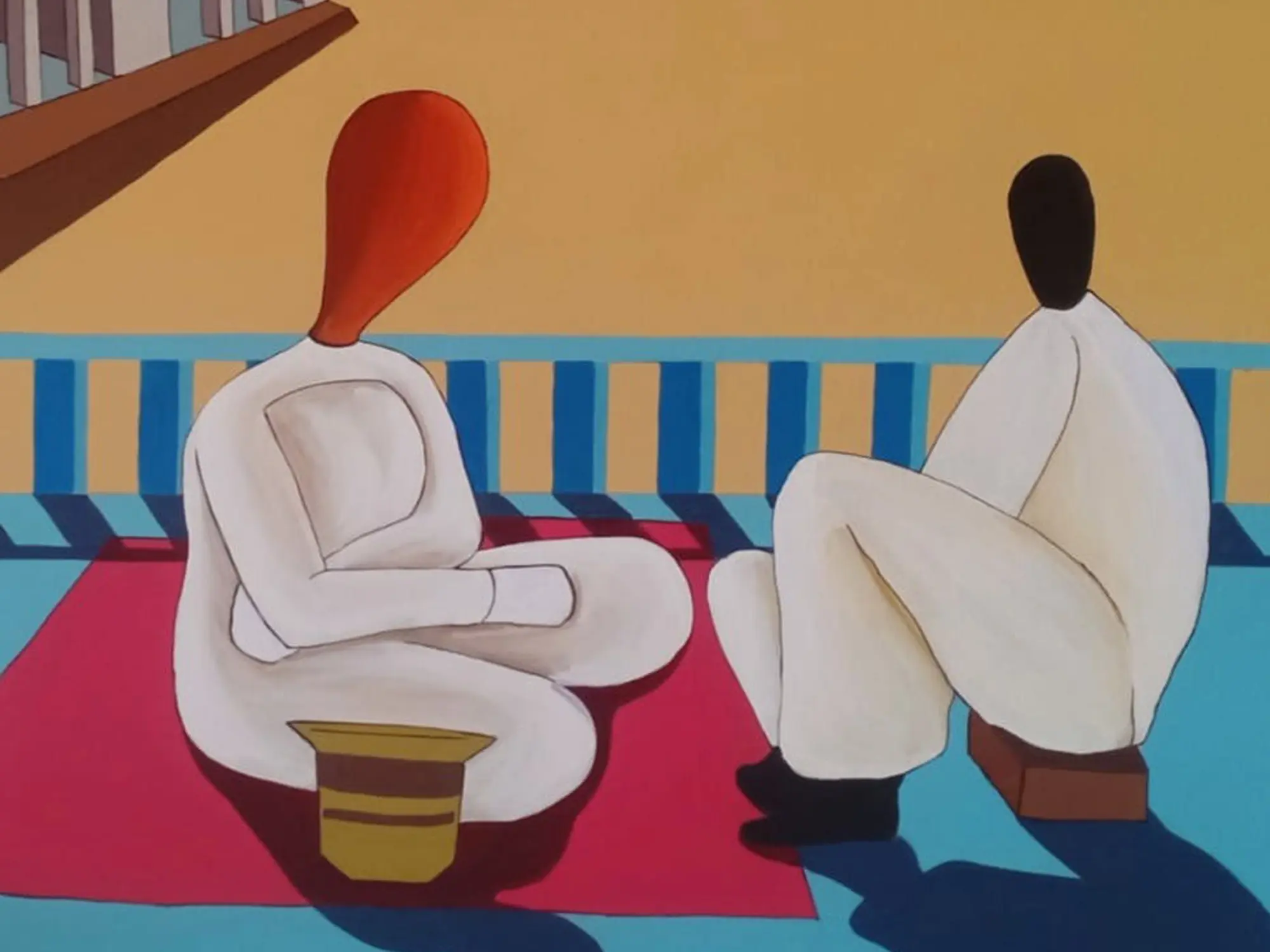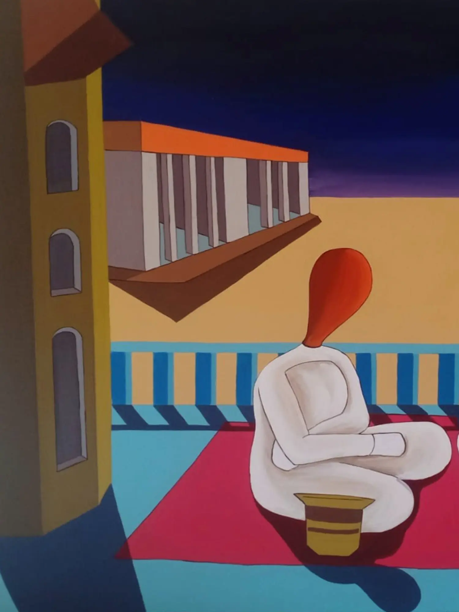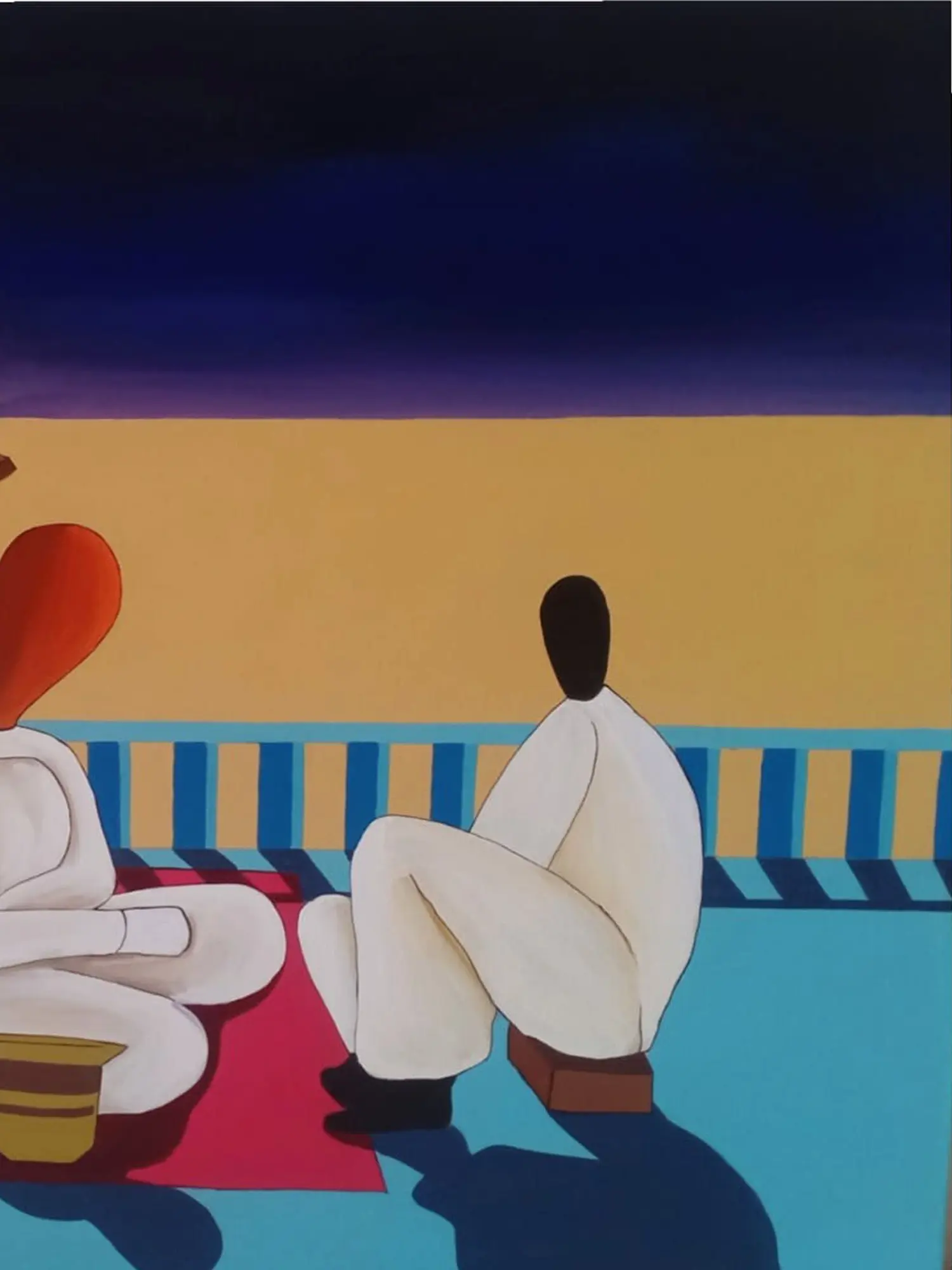 Measuring 24 inches in height and 30 inches in width, this artwork presents a captivating balance of form and color. The interplay of architectural elements, suggested by clean lines and geometric shapes, grounds the figures within their contemplative space. The rich, graduating tones of the sky and the striking contrast of the figures' simple, flowing forms draw your eye through the composition, evoking a sense of serene depth.