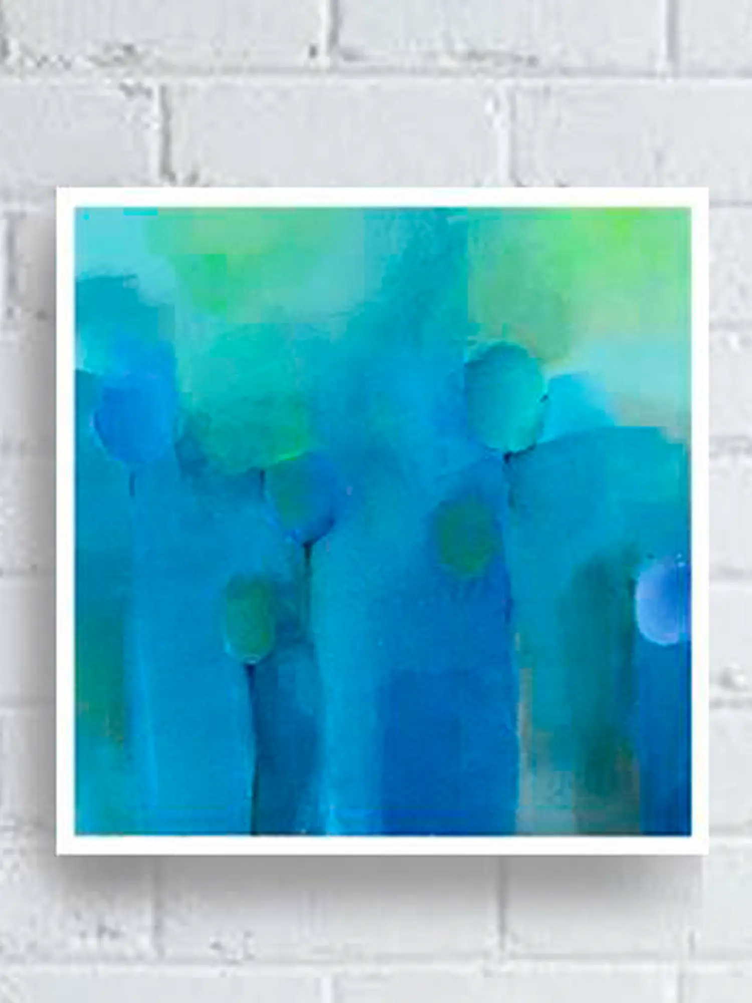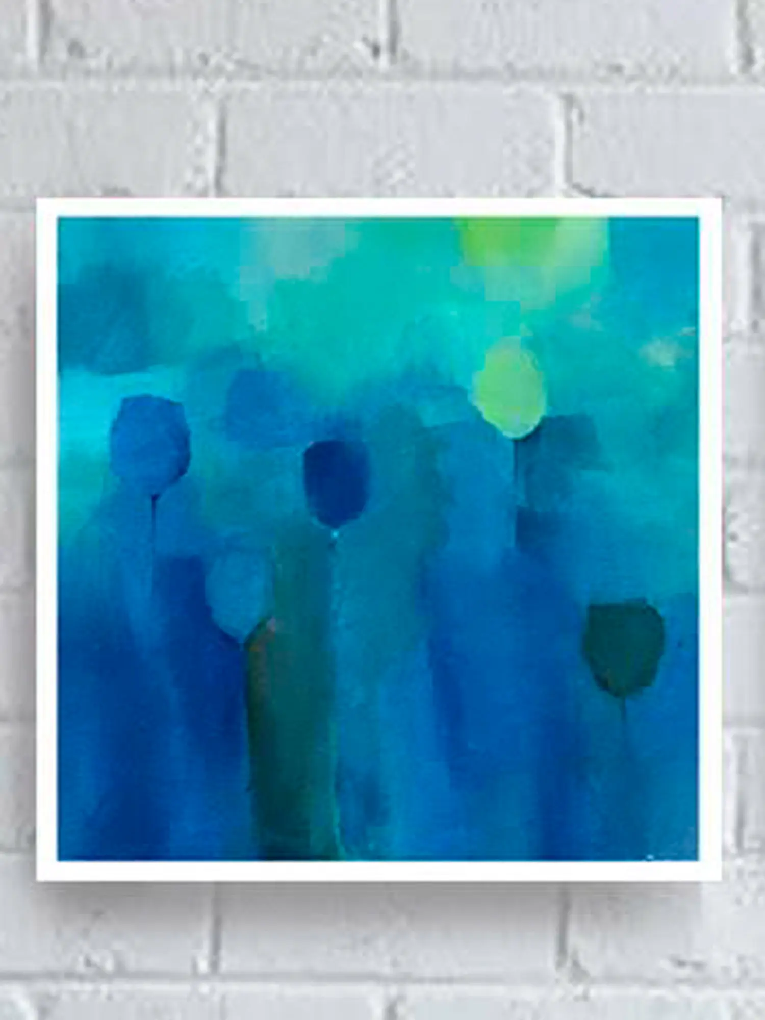 Each of these square compositions, measuring eleven inches by eleven inches, unfolds a mesmerizing dance of abstract forms. You'll be drawn to the delicate suggestion of floral elements, hinted at through soft, rounded shapes and varying intensities of color. The cool palette, dominated by deep indigos and lively aquas, evokes a sense of calm and rejuvenation, while subtle touches of lime green add a spark of life.