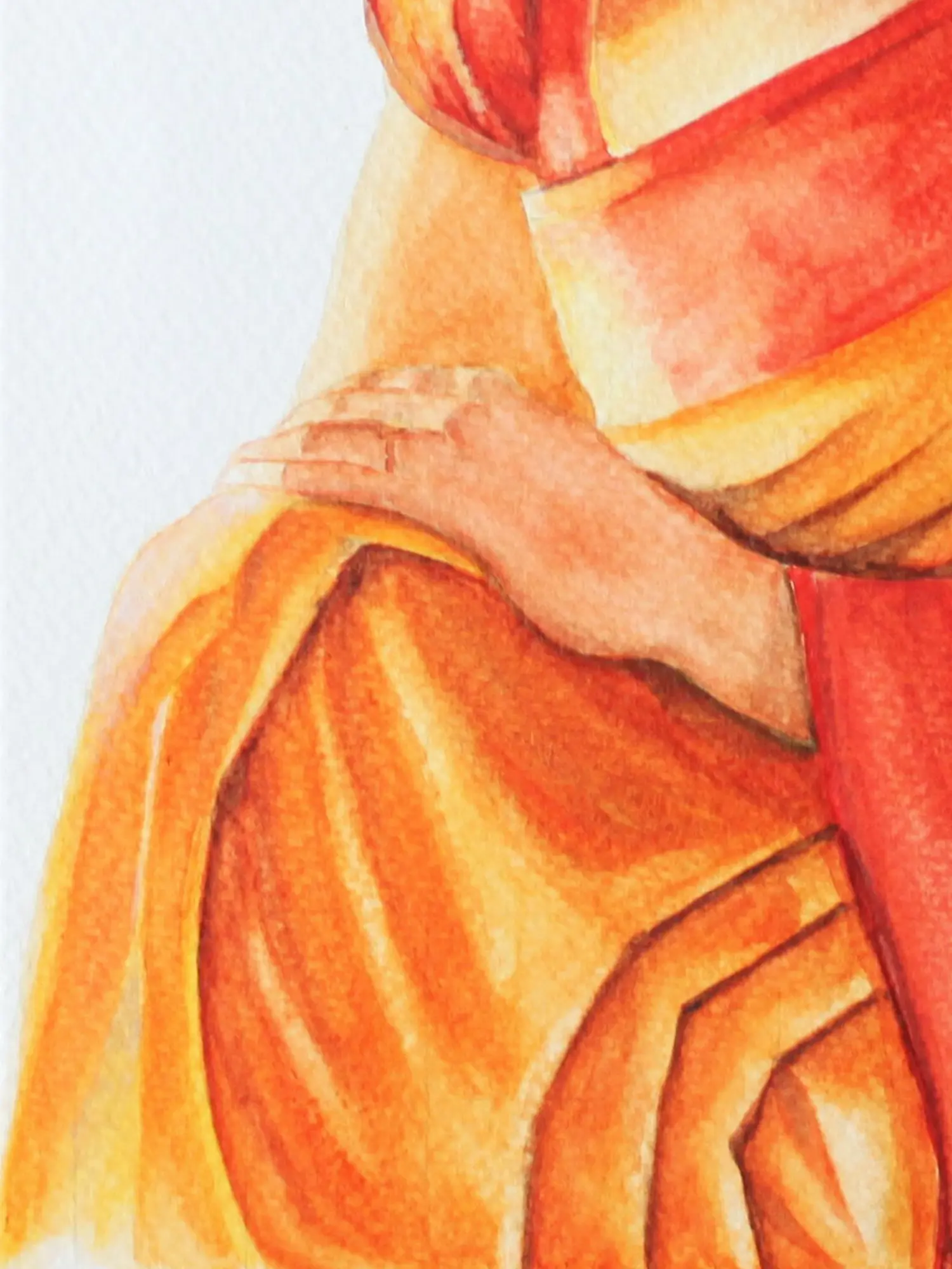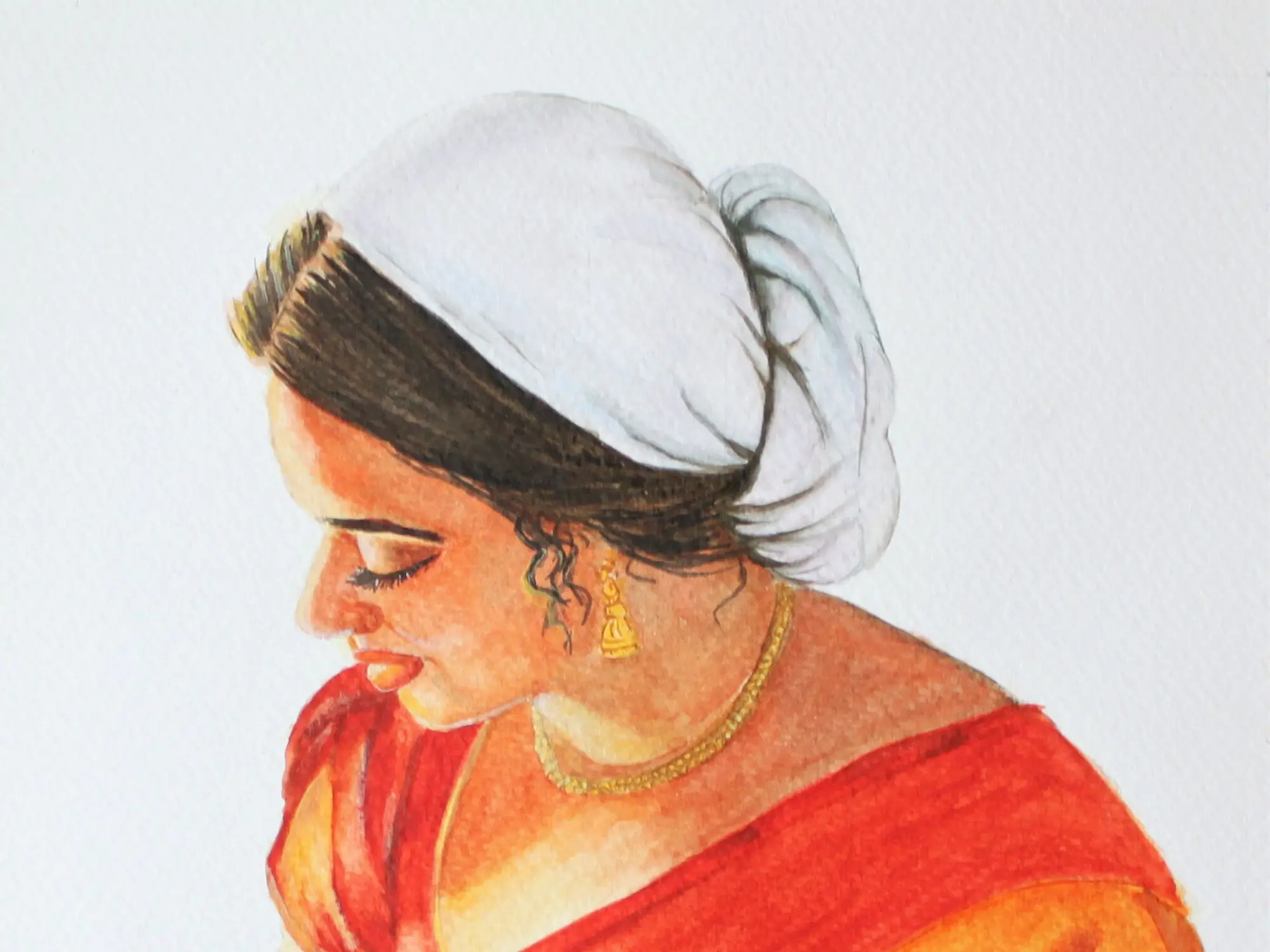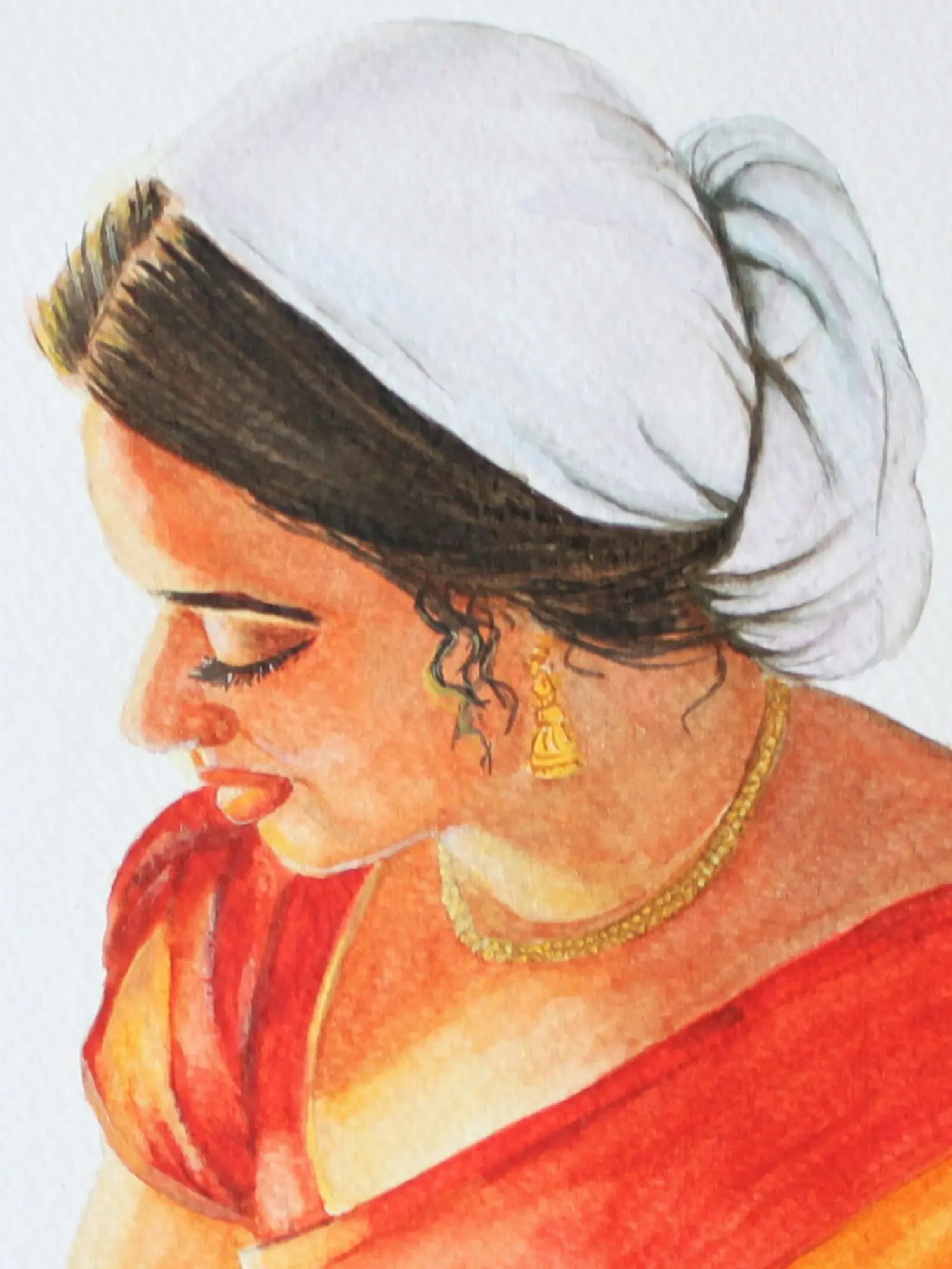 This portrayal may subtly evoke the quiet dignity often associated with classical Indian art, where feminine beauty is expressed through grace and inner strength. The composition, with its downward gaze, suggests introspection or a gentle observance, reminiscent of artistic traditions that celebrate subtle storytelling. You'll appreciate the composition's understated elegance and its capacity to convey a powerful emotional narrative.