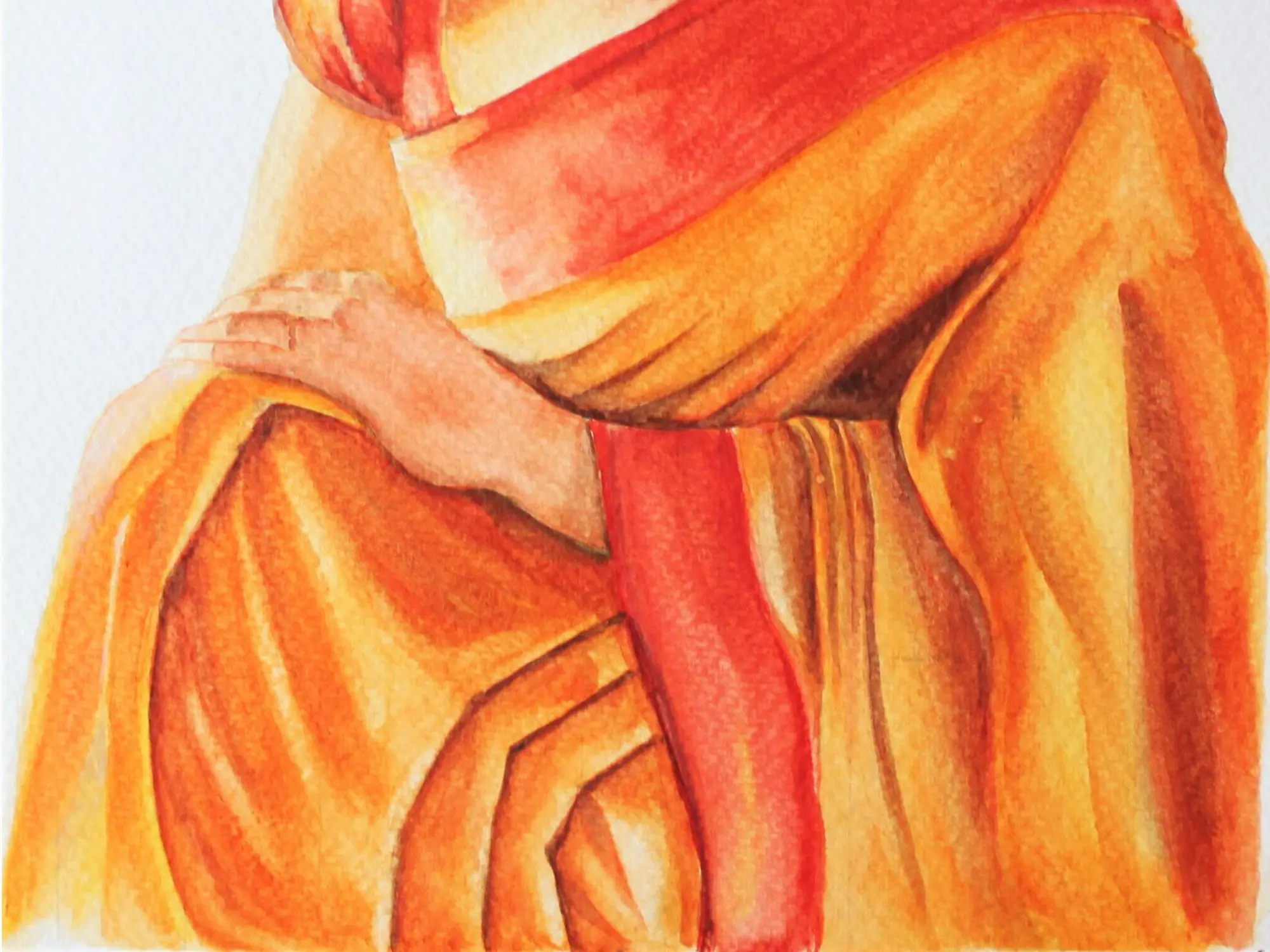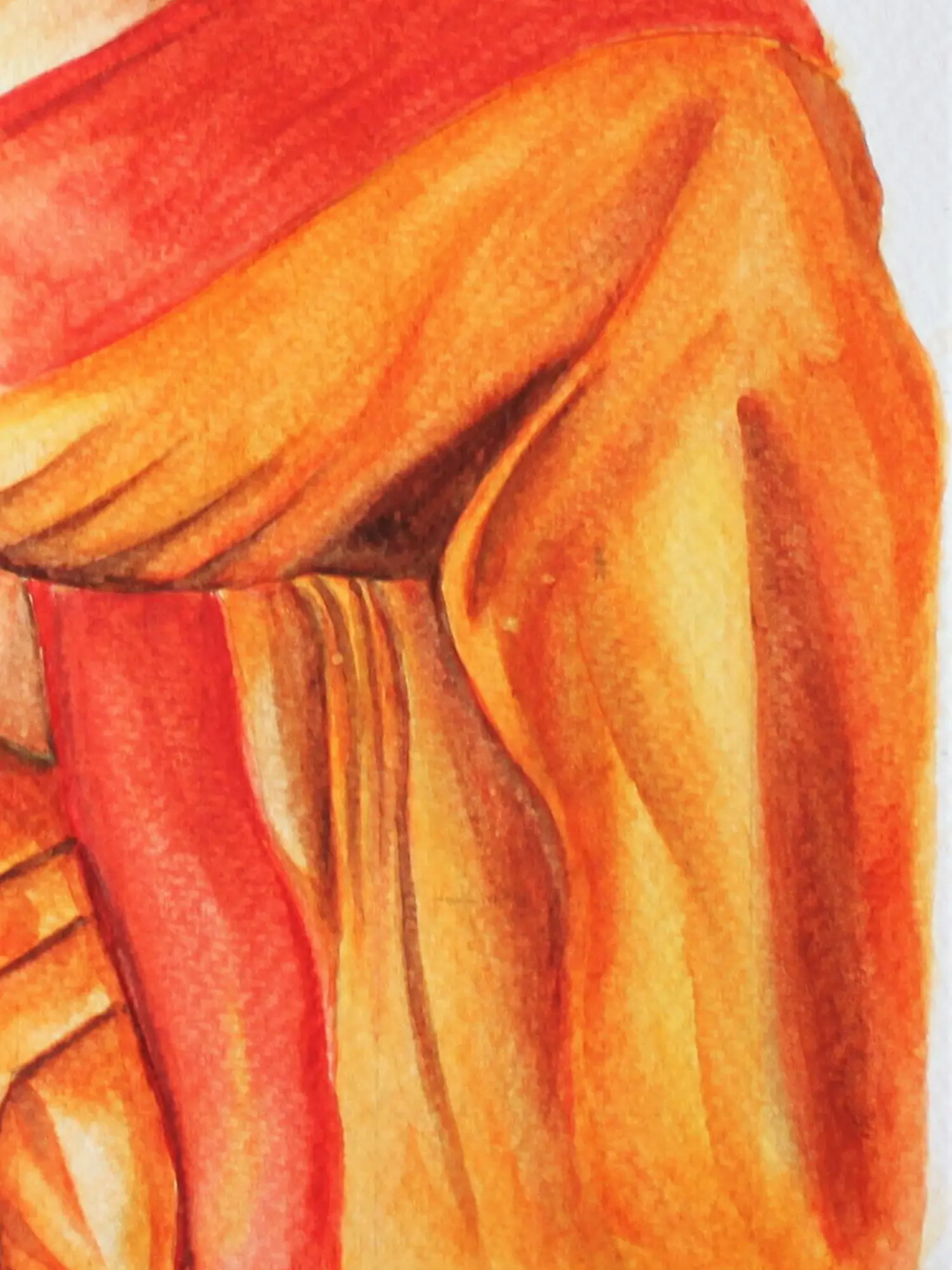 The vibrant interplay of warm oranges and fiery reds in the draped silk evokes a sense of opulence and gentle warmth. Notice the exquisite detail in the jewelry, a subtle yet impactful touch that signifies refinement. The soft white headscarf frames a pensive expression, rendered with captivating subtlety.