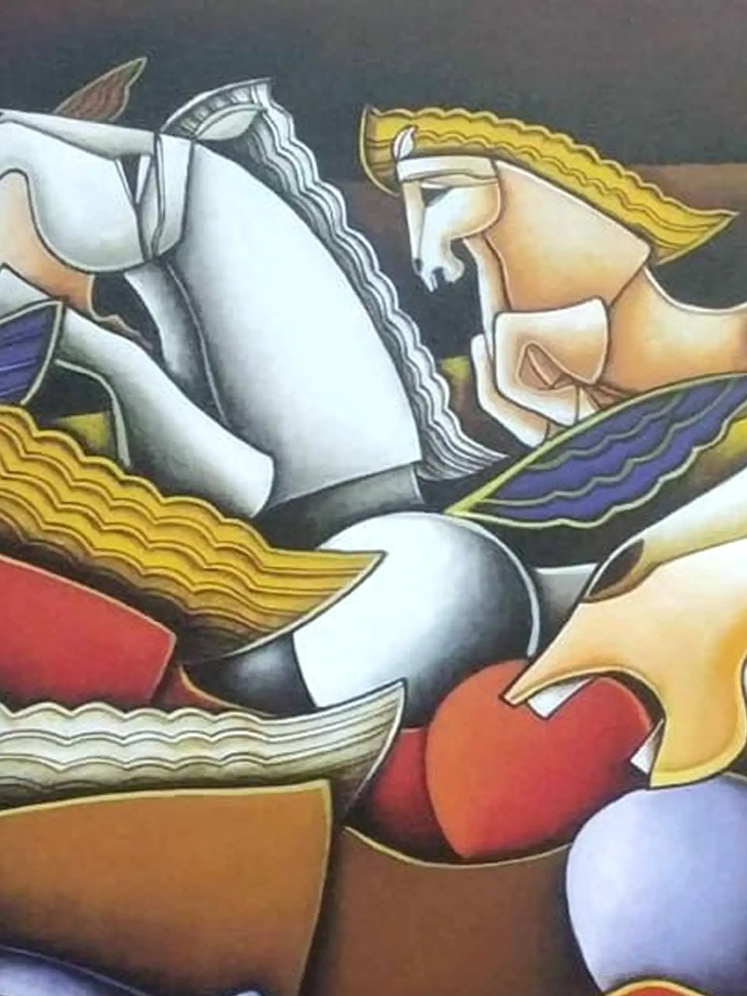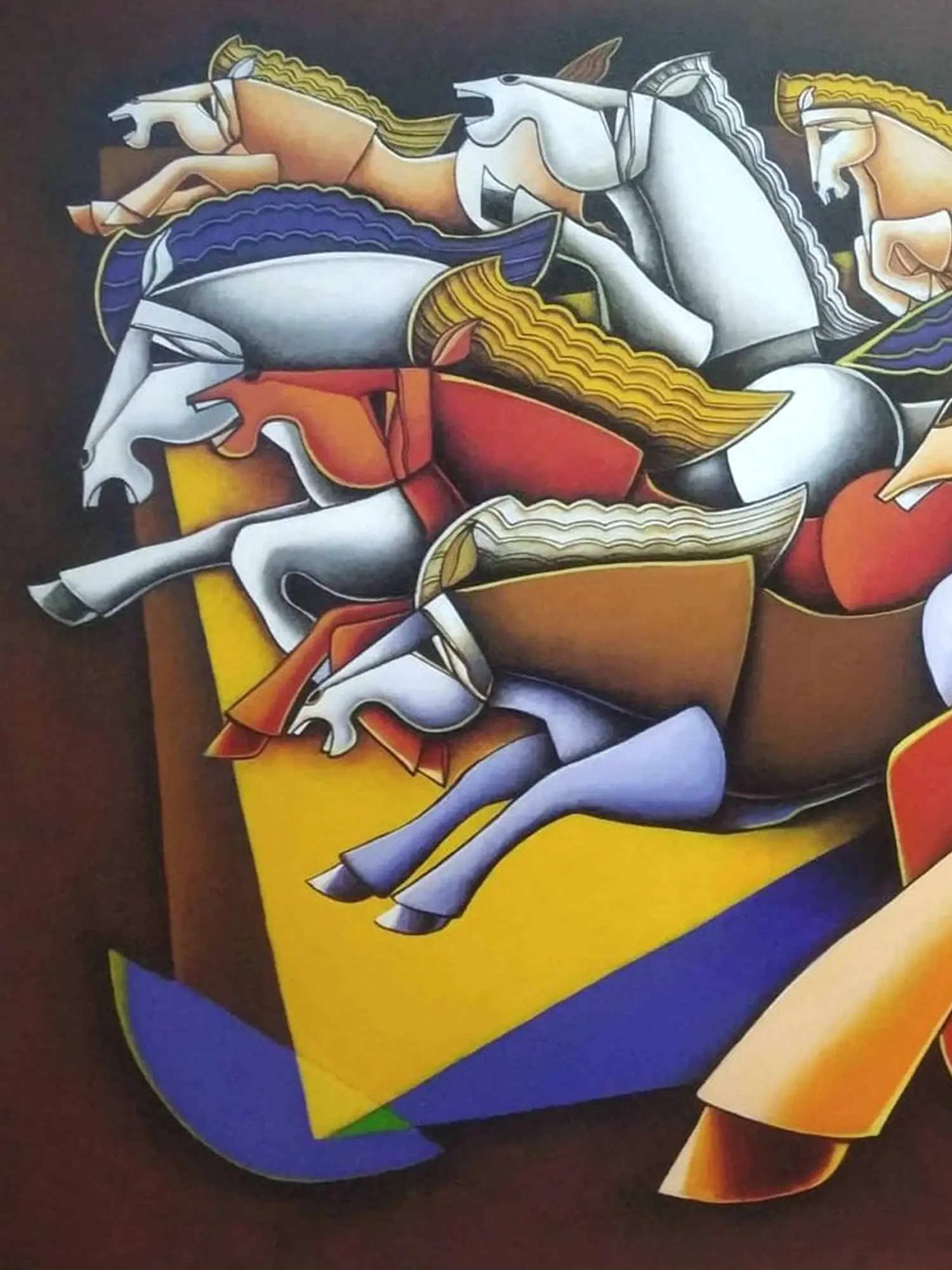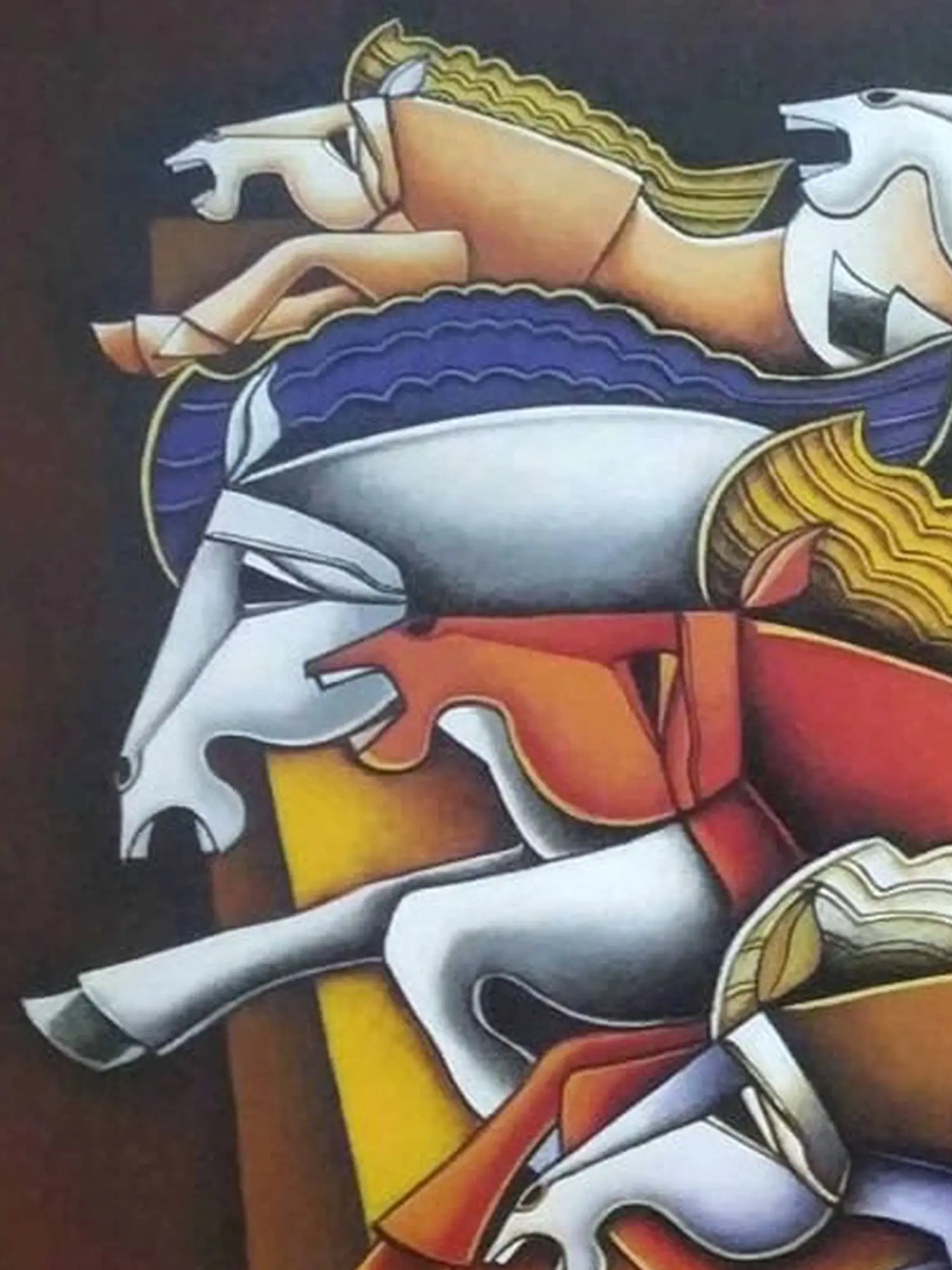 Observe how bold geometric shapes intertwine with the organic fluidity of the equine figures, creating a captivating tension. The palette, rich and evocative, masterfully guides the eye across the expansive 30-inch by 48-inch surface. You'll find yourself drawn to the interplay of shadow and light, the dramatic curves of the horses' forms, and the assertive composition that commands attention.