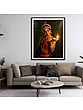 Her exquisite ornaments, glossy red silk saree, and floral hair ornament- all suggest that the divine beauty on the canvas of this oil painting belongs to the Southern region of India, where the tradition of Devadasi or attendants of the Lord originated.