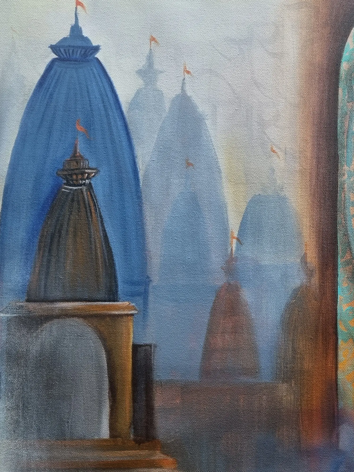The 18 by 24-inch canvas serves as an intimate yet impactful portal, drawing the viewer into its narrative. You'll observe the intricate details of the traditional temple architecture, rendered with a soft, ethereal glow that suggests a distant, sacred realm. Contrasting this is the close-up, tender portrayal of a revered deity, whose serene expression and gentle gesture convey a sense of profound peace and wisdom. The textured detail on the deity's headdress, subtly inscribed with what appears to be sacred script, adds another layer of visual and spiritual richness.