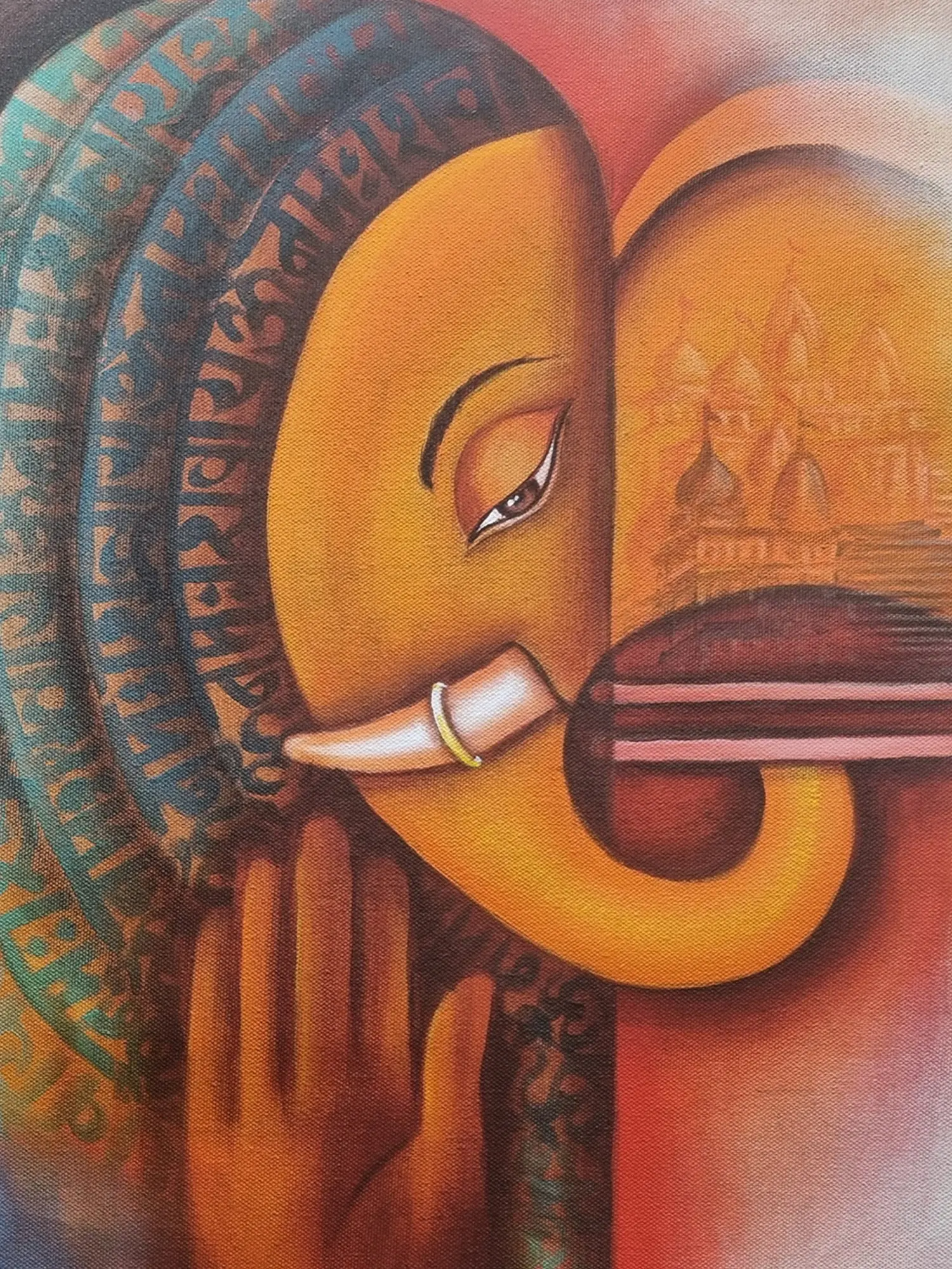 This creation draws inspiration from the heart of Indian spirituality, specifically evoking the atmosphere of ancient temples and the revered form of Lord Ganesha, the remover of obstacles and patron of arts and sciences. The juxtaposition of the architectural grandeur of a temple with the personal, almost intimate depiction of the deity signifies the omnipresence of the divine, accessible both in grand structures and within the quiet contemplation of the individual. It speaks to a rich cultural heritage where art, faith, and daily life are deeply intertwined.