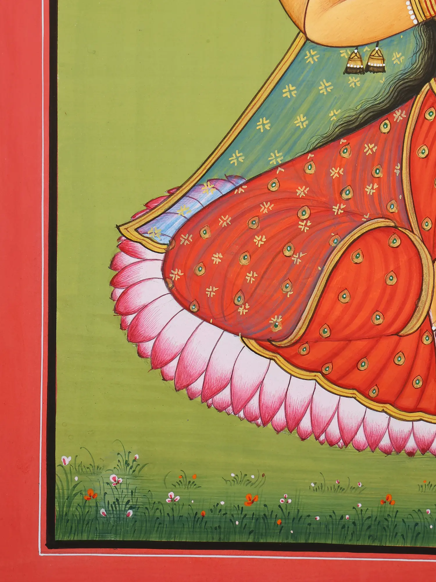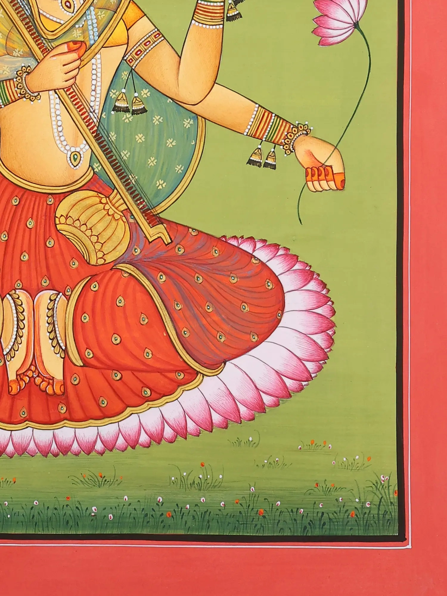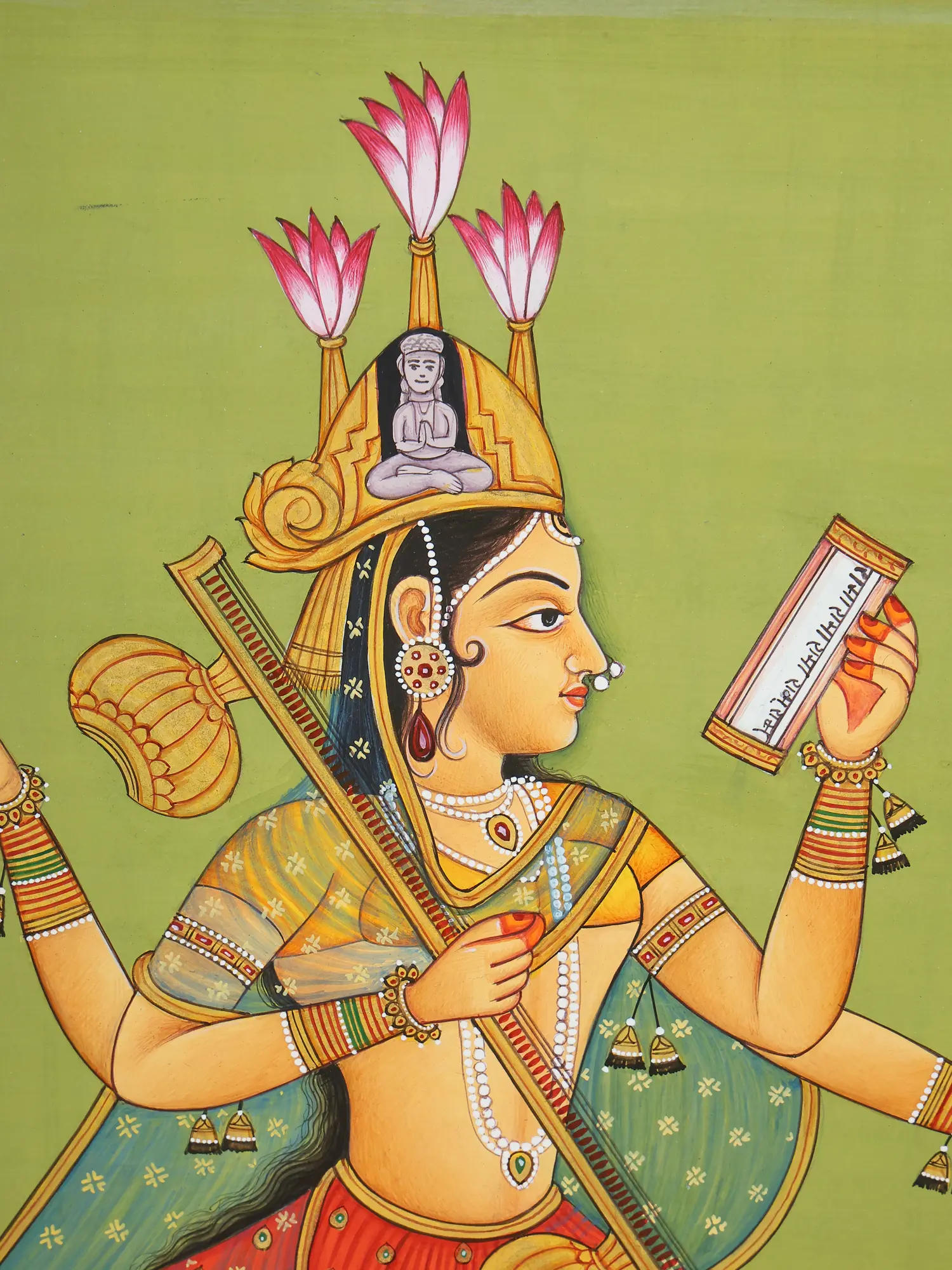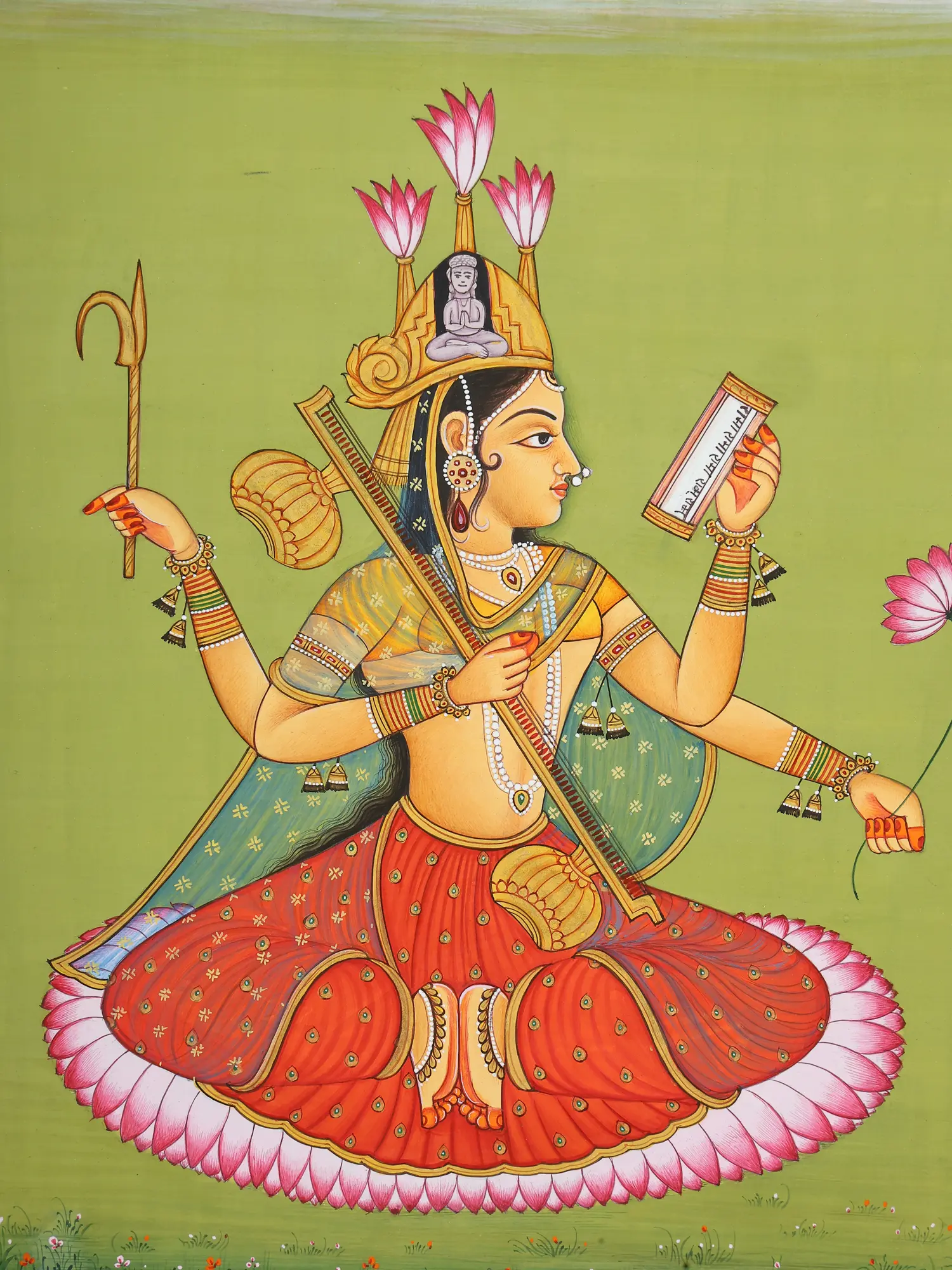 This exquisite watercolor painting captures the essence of Devi Saraswati, the Hindu goddess of knowledge, music, arts, wisdom, and learning. Seated gracefully upon a lotus blossom, she embodies serenity and grace. The vibrant colors and meticulous detail bring to life the rich symbolism associated with this revered deity. The painting is a testament to the skill and artistry of traditional Indian miniature painting techniques. Saraswati, often depicted with a veena (a stringed instrument), symbolizes the power of creative expression and intellectual pursuit. Her four hands represent her mastery over various aspects of wisdom and learning; one holds a veena, another a book representing knowledge, the third a mala (rosary), symbolizing spiritual contemplation, and the fourth holds a lotus flower, representative of purity and enlightenment.