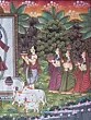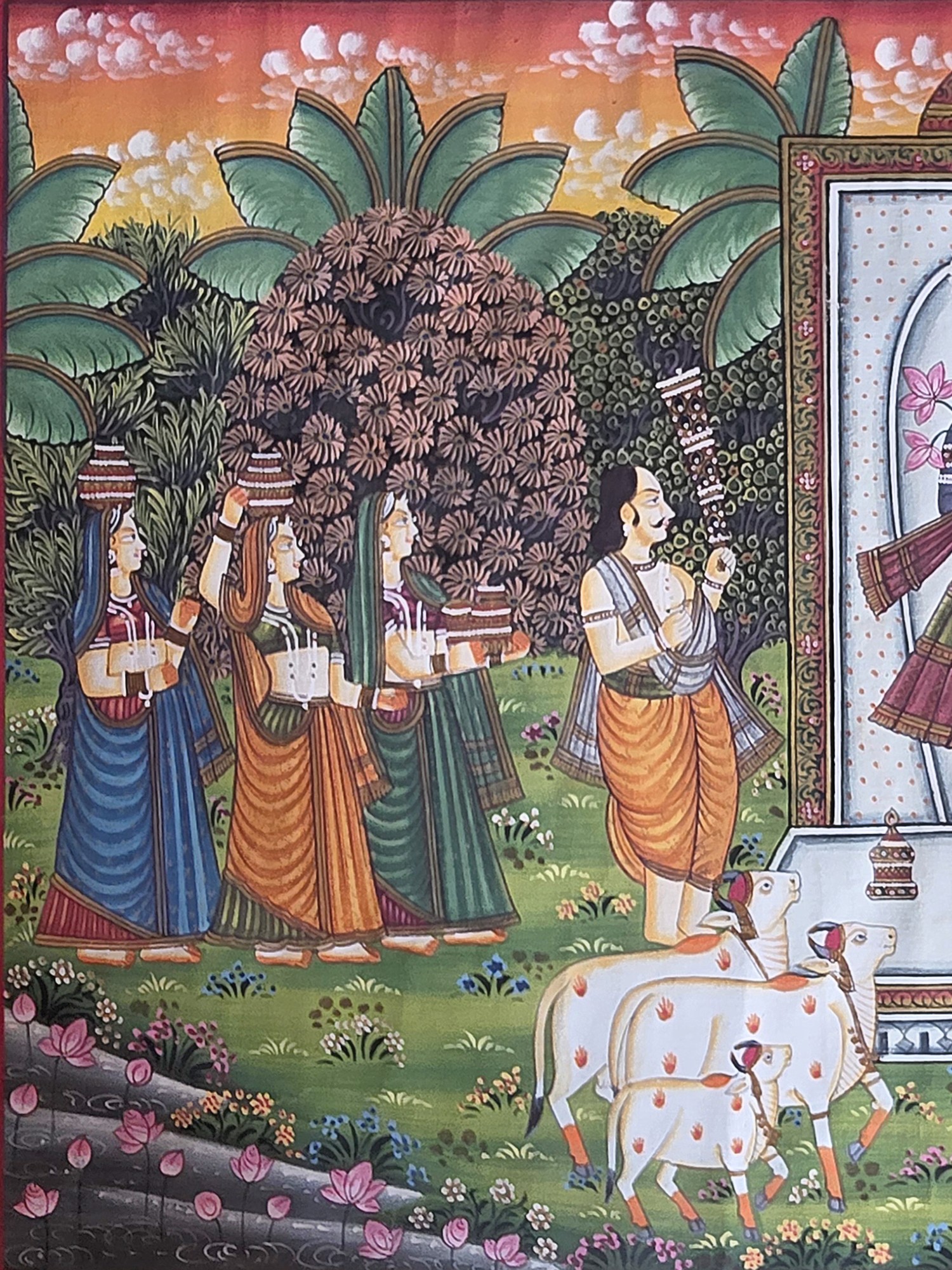 The scene unfolds with devoted followers approaching Shrinathji, their faces alight with piety and reverence. Several women, elegantly attired in traditional Rajasthani attire, are shown carrying offerings, perhaps milk, fruits, or flowers, essential elements in Hindu worship. Their graceful postures and the collective movement towards the divine presence evoke a sense of communal devotion and spiritual harmony. Alongside them, a male figure, likely a priest or a prominent devotee, offers prayers, his hands clasped in reverence. The presence of white cows, considered sacred in Hinduism and closely associated with Krishna, further enhances the spiritual tableau, symbolizing purity and prosperity. ––––––––––––––––––––