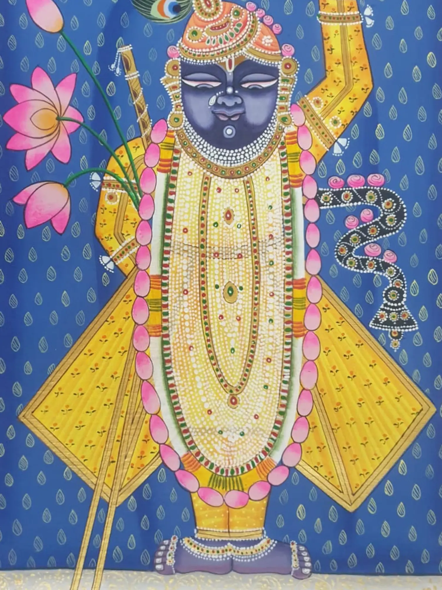 The divine figure of Shrinathji is rendered with captivating detail, adorned in a flowing yellow garment richly embellished with intricate patterns and precious jewels. The vibrant blue background, dotted with a subtle motif, creates a striking contrast that draws the eye to the central deity. The presence of blooming lotuses, symbolic of purity and enlightenment, adds a further layer of visual and spiritual significance. The thoughtful composition, measuring 16 inches in height and 9 inches in width, ensures a commanding yet harmonious presence.