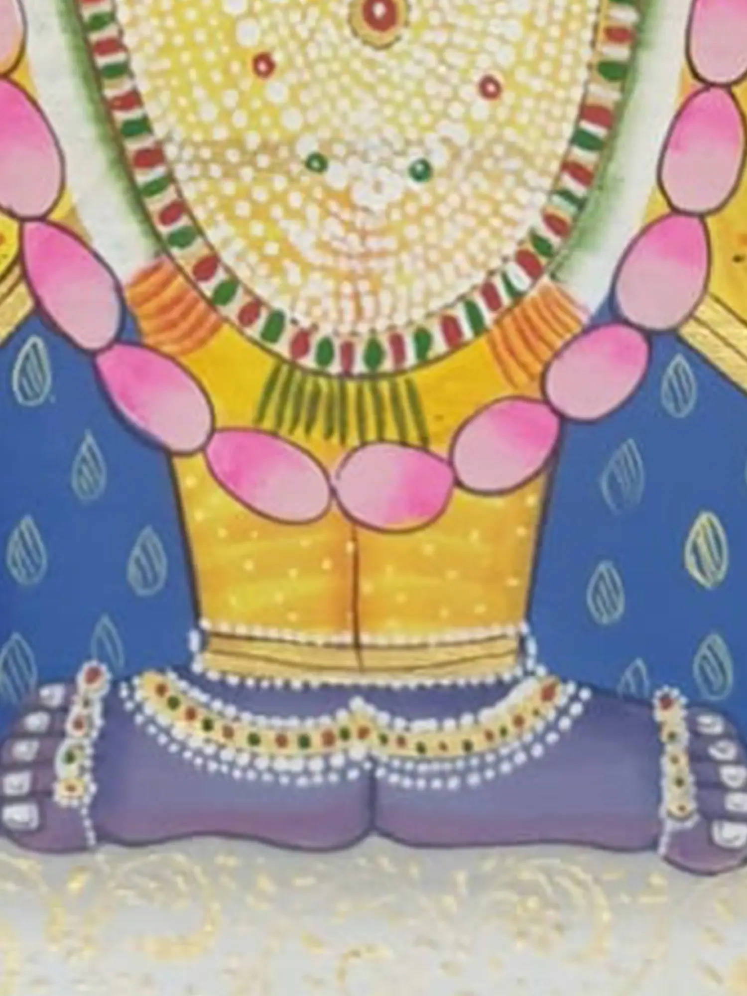 Crafted with meticulous care by the skilled hands of Jagriti Bhardwaj, this painting is a testament to traditional Indian artistry. Created using natural pigments on cloth, each hue is rich and vibrant, possessing a depth that synthetic colors cannot replicate. The delicate brushstrokes and the careful layering of color reveal an artist deeply connected to her craft and the spiritual subject matter.
