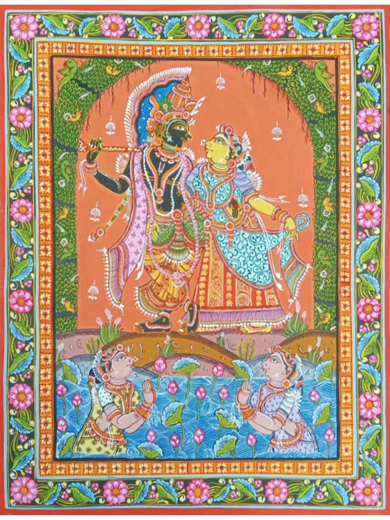 This depiction draws inspiration from the rich tapestry of Hindu mythology, specifically the divine love story of Radha and Krishna. Their bond is celebrated as the ultimate representation of unconditional love and spiritual yearning. The Pattachitra style itself originates from Odisha, India, an art form deeply rooted in religious narratives and folk traditions, passed down through artist families.